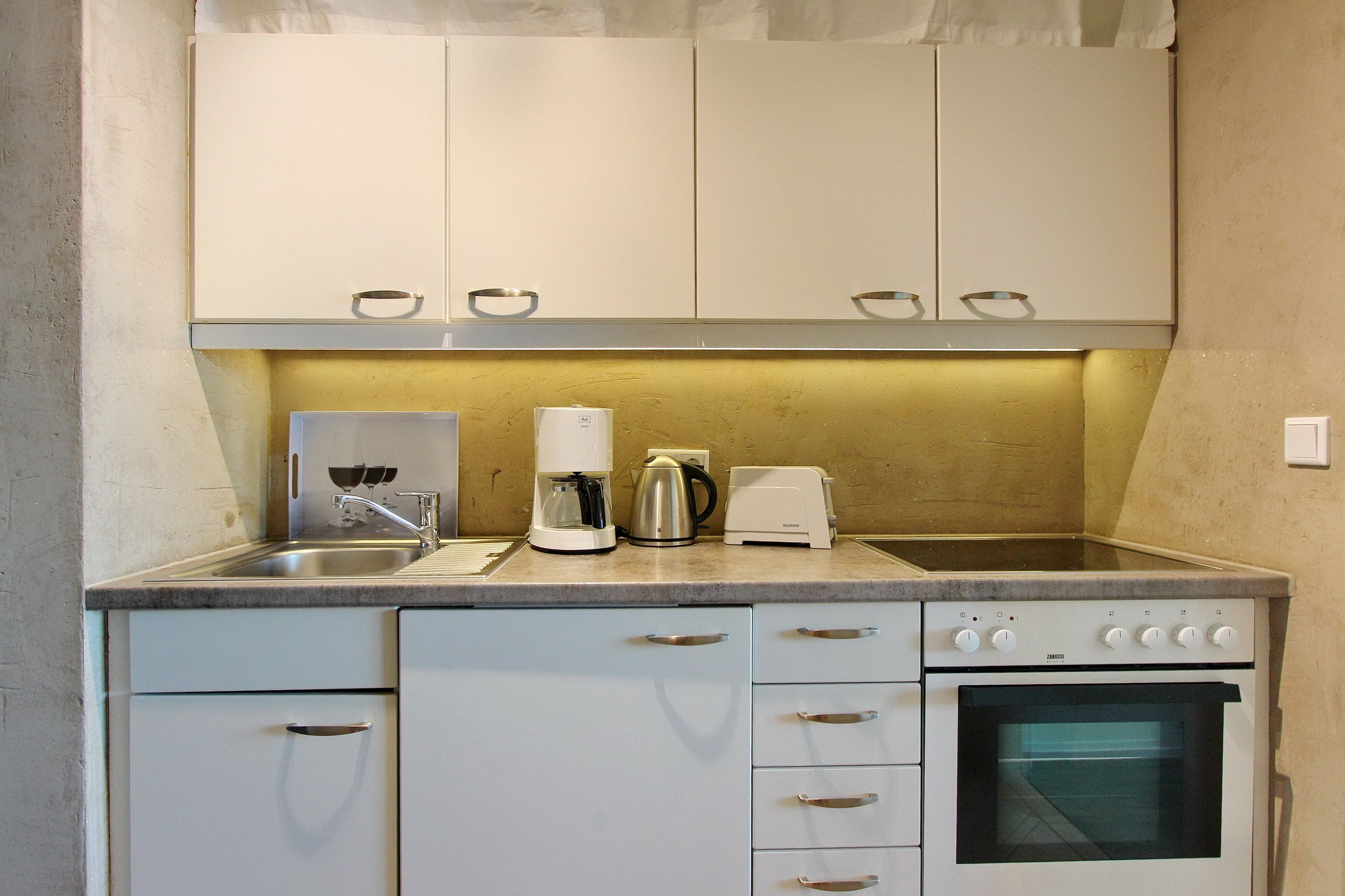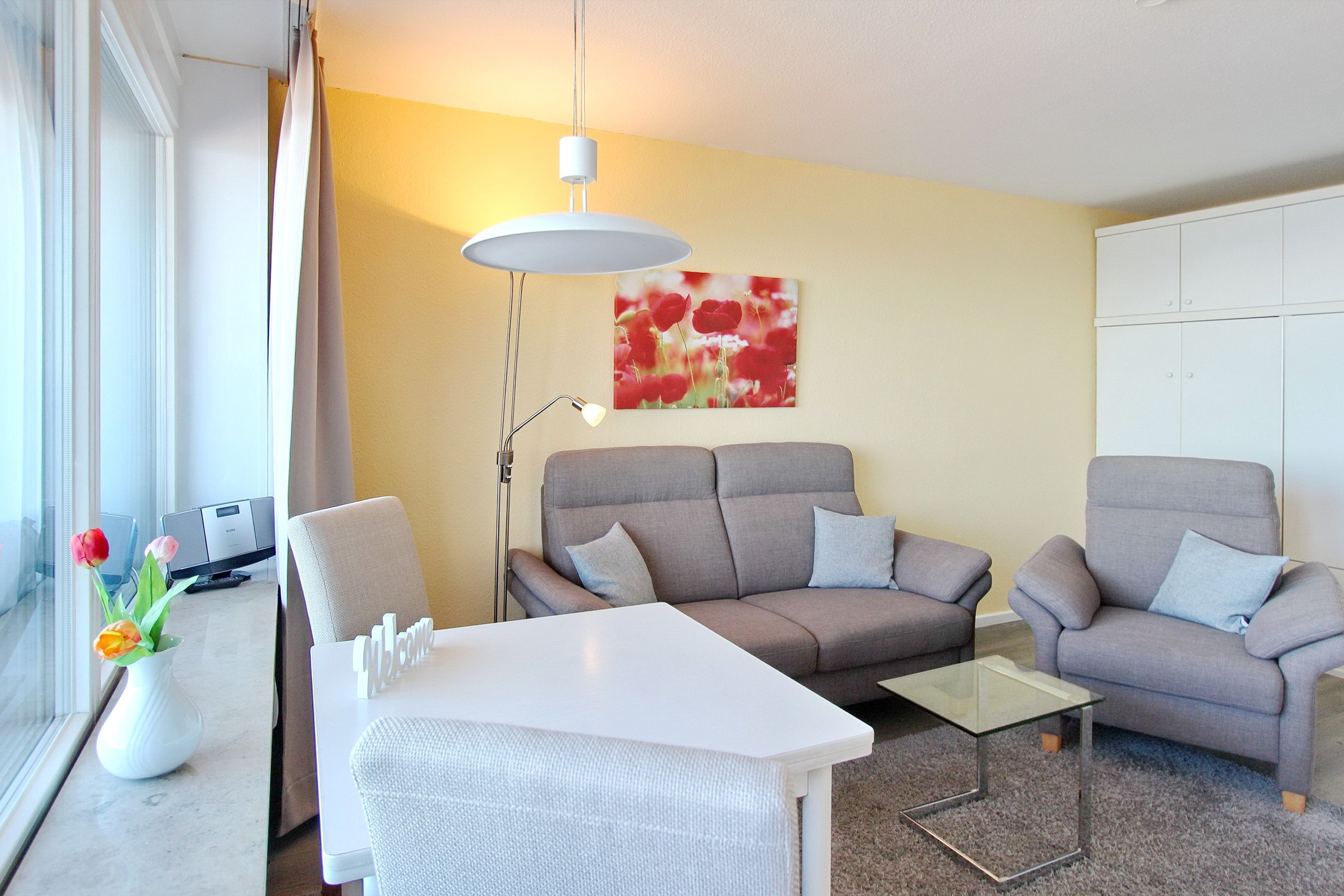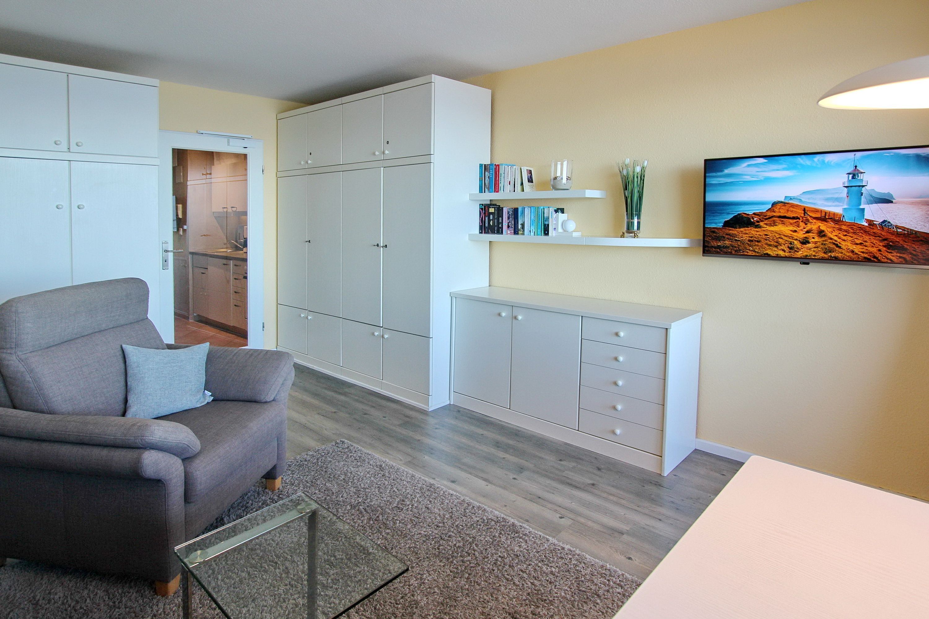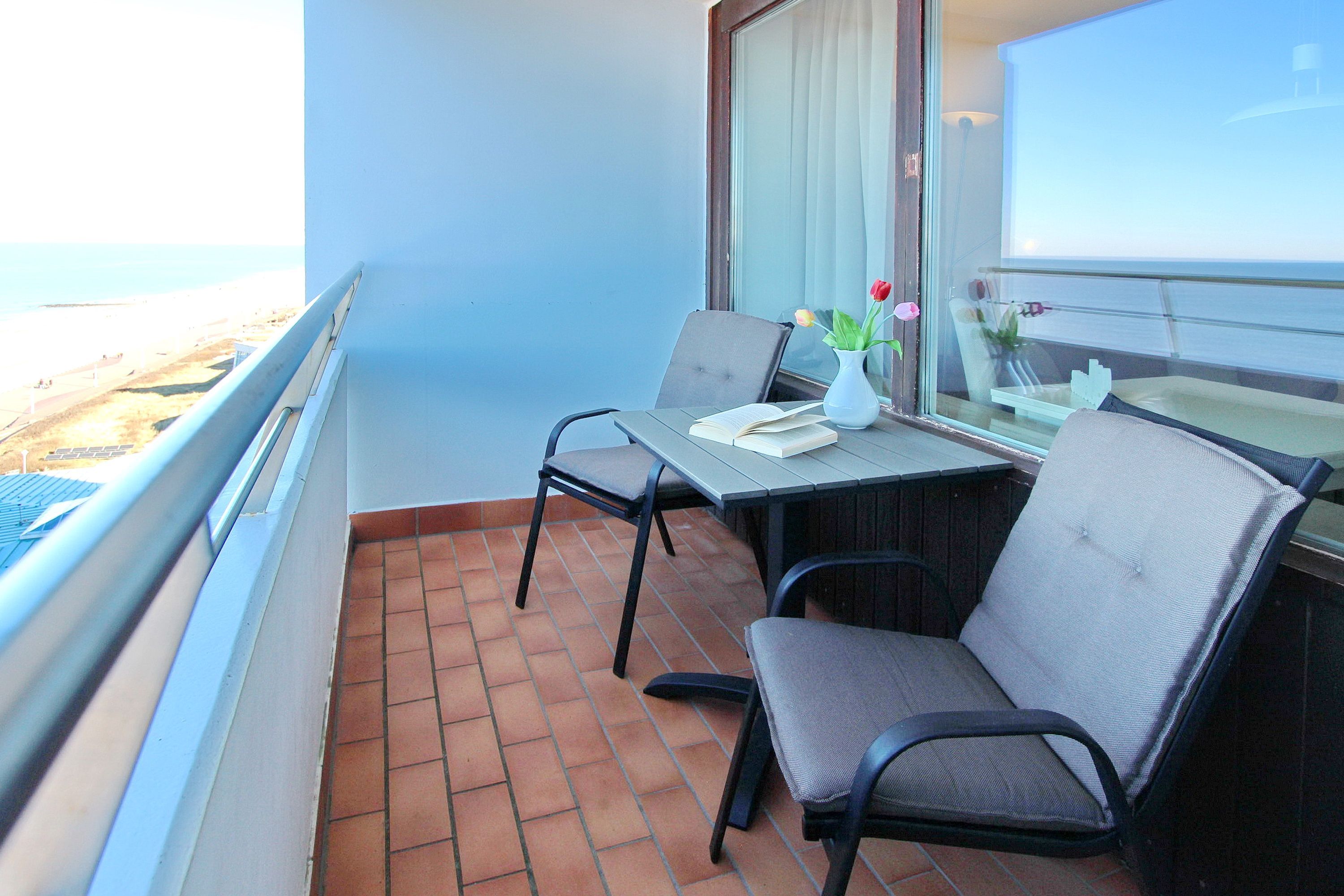 Einen tollen Meeresblick haben Sie aus dieser Einzimmerwohnung in der 8. Etage des Haus Metropol. Der kombinierte Wohn-/Schlafraum mit vorgelagertem Westbalkon (Balkonmöbel mit Kissen sind vorhanden) verfügt über Einzelschrankbetten und einen Essplatz mit 2 Stühlen, der direkt am Fenster steht. In der Wohnung wurde Laminatfußboden verlegt und es gibt eine Couch und einen Sessel. Das Badezimmer hat eine Dusche, Handtuchtrockner und einen Hocker. In der Einbauküche im Flur mit Cerankochfeld und Backofen können sie sich selbst verpflegen. Zur technischen Ausstattung gehört: ein Flachbildfernseher und ein CD Player. Das freie WLAN Netzwerk (WEG Haus Metropol - Passwortfrei - ohne Gewähr) steht ihnen kostenfrei zur Verfügung. Die Wohnungsgröße dieser Nichtraucherwohnung beträgt: ca. 34 m².
