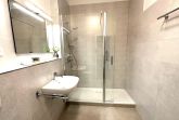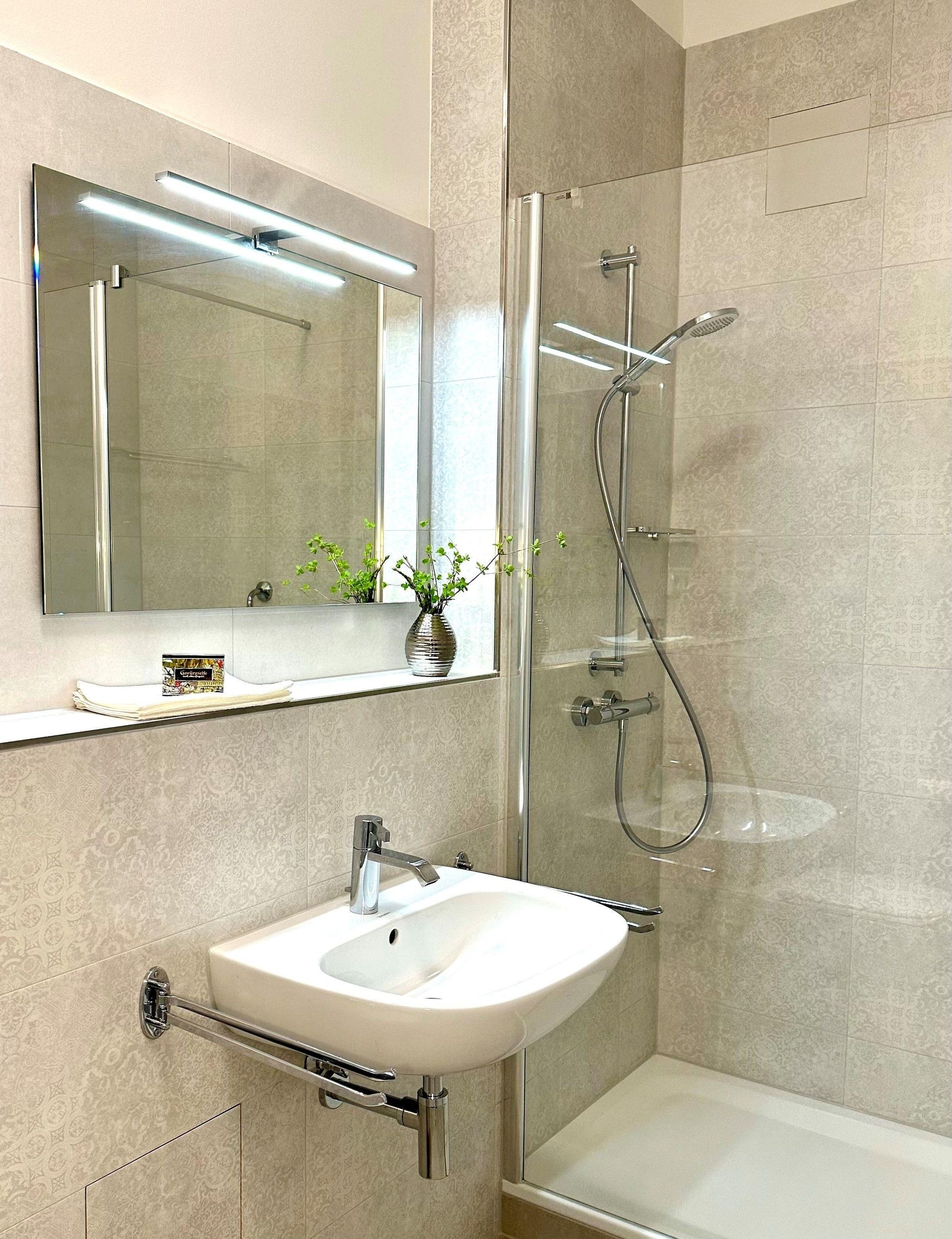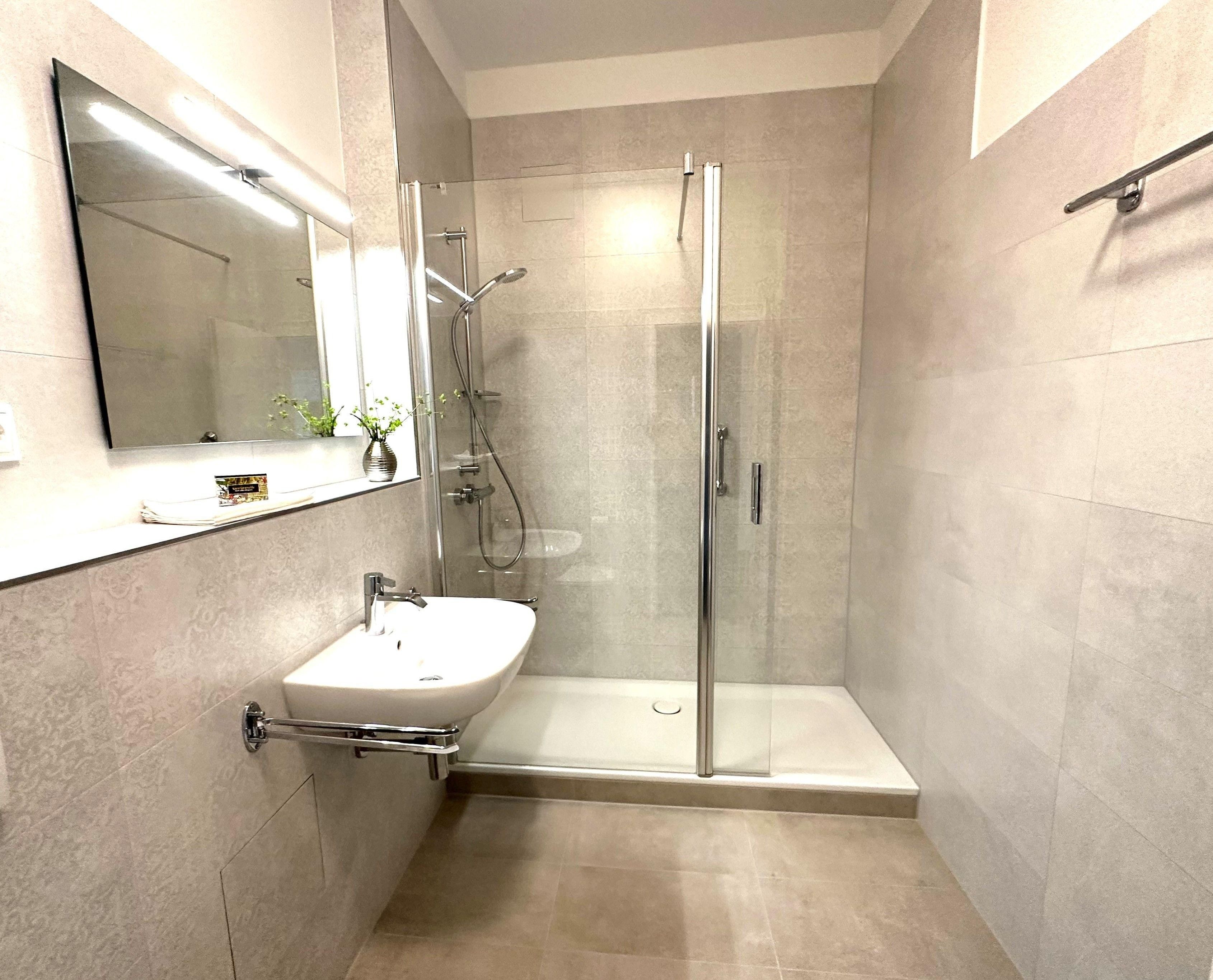 Das helle geräumige Bad mit großer Walk-In-Dusche verfügt über einen großen Spiegel, viele Ablageflächen, Waschbecken, WC und Föhn.