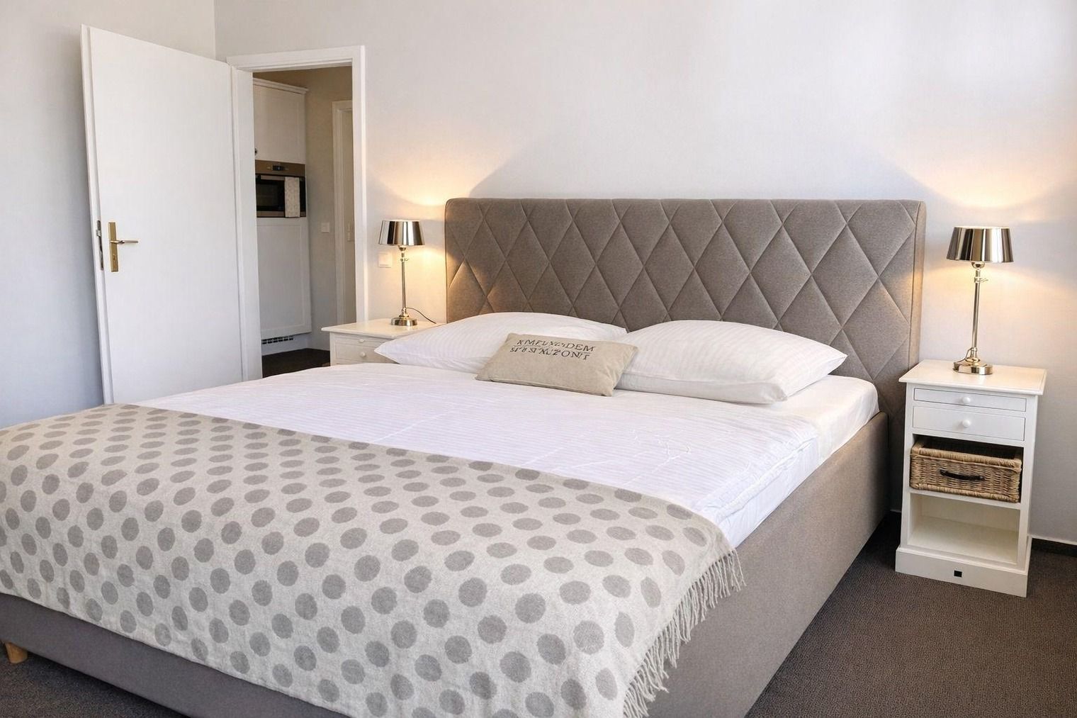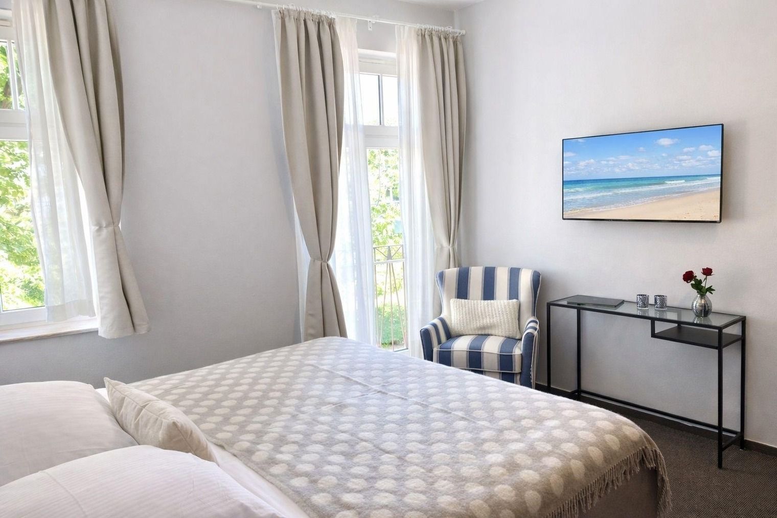 Das geräumige Schlafzimmer verfügt über ein luxuriöses Boxspring-Bett (1,80 x 2,00 m), einen großen Kleiderschrank mit Safe für Ihre Wertsachen, einen zweiten Fernseher sowie eine gemütliche Schreib- und Leseecke.