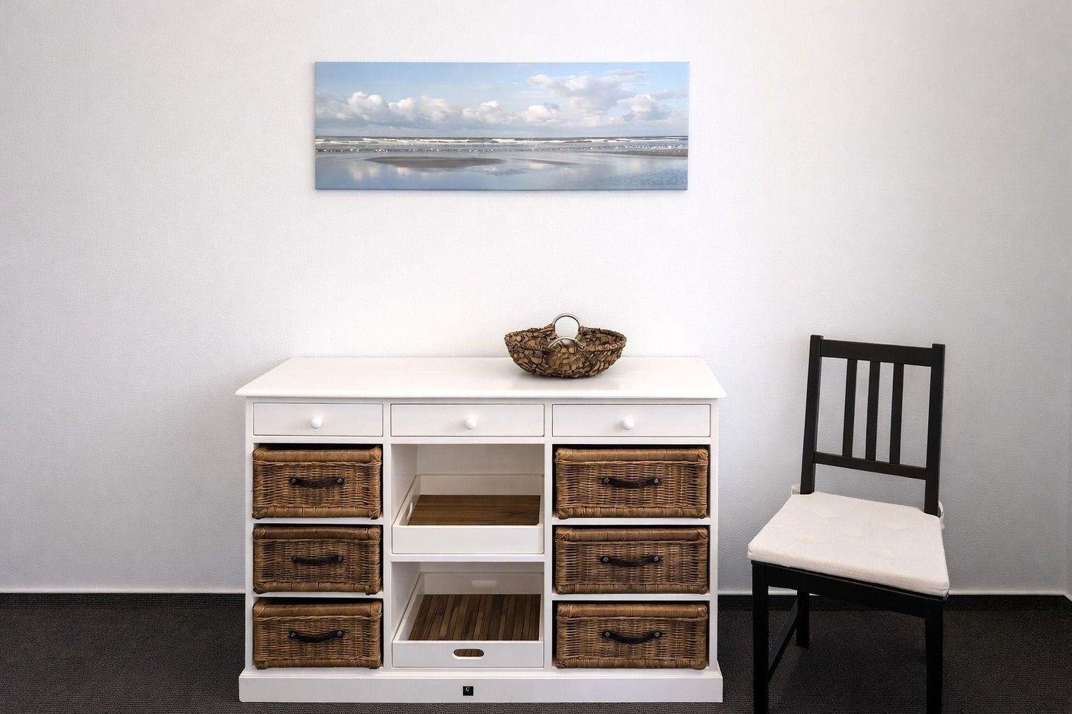 Im Eingangsbereich befindet sich eine geräumige Kommode sowie eine Garderobe mit großem Spiegel.