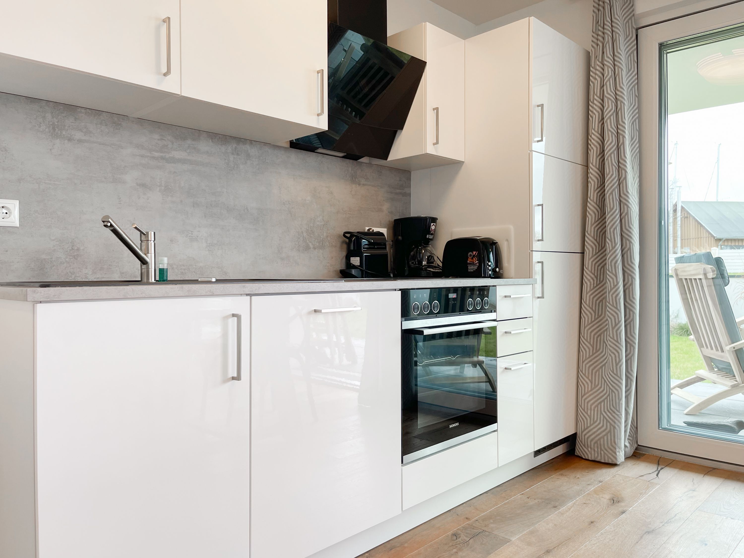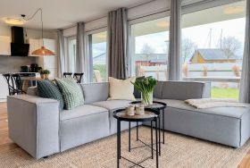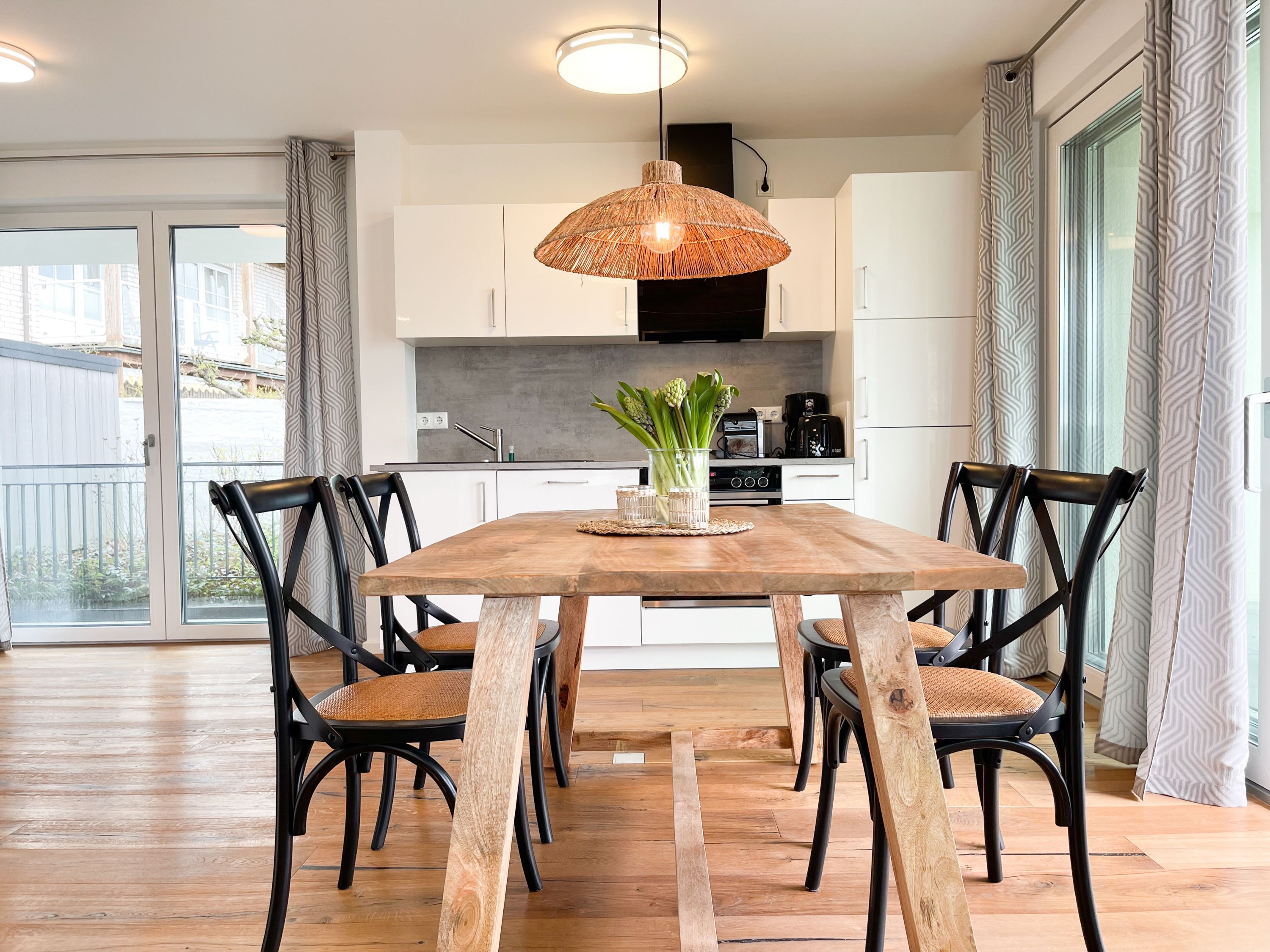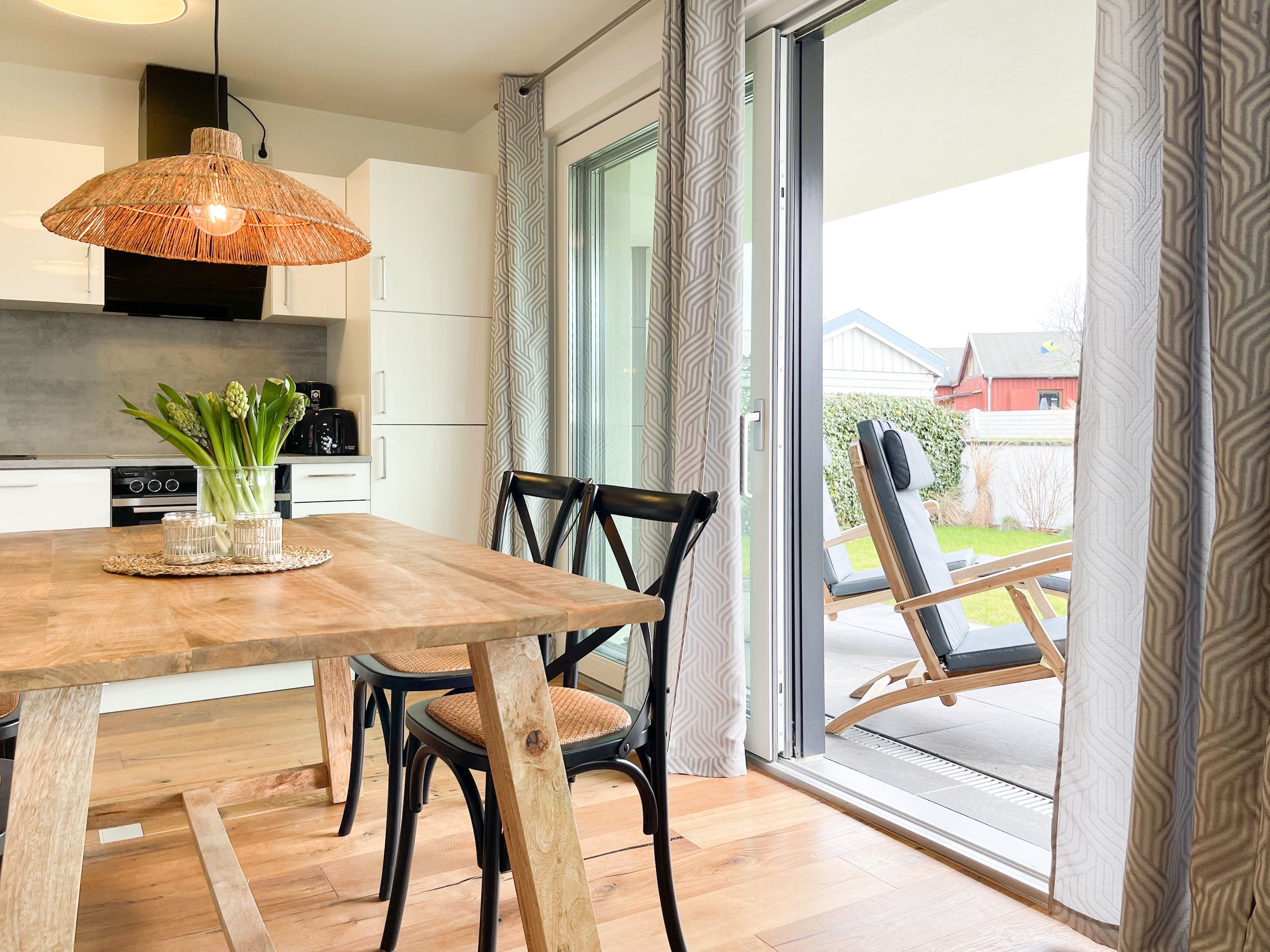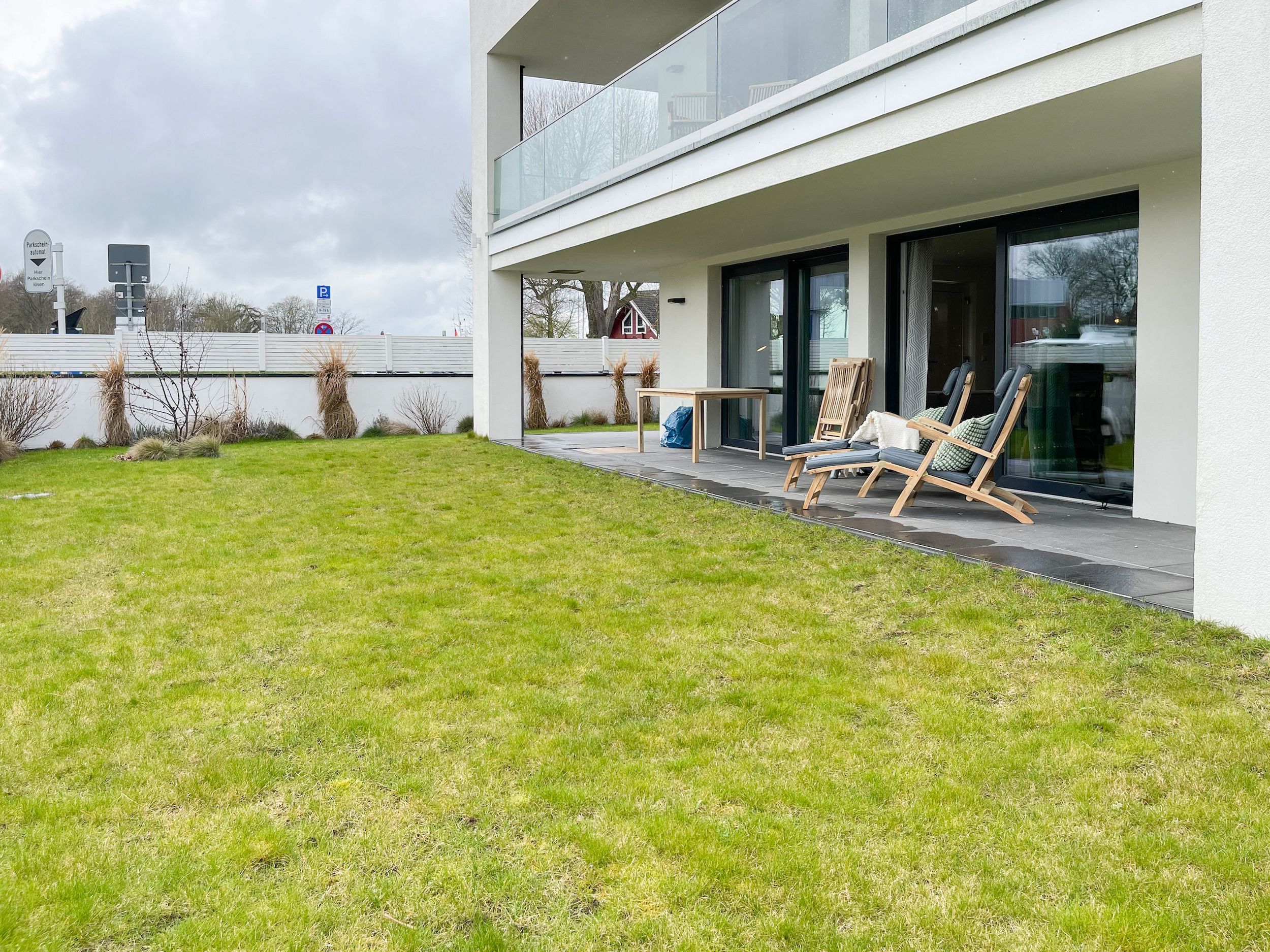 Die Ferienwohnung Hafendeck liegt im Erdgeschoss eines modernen Neubaus mit nur 3 Wohneinheiten und bietet auf 100 qm über 2 Wohnebenen ausreichend Raum für 5 Personen, um einen entspannten Urlaub in absoluter Strandnähe zu verleben. Das Herzstück der Wohnung bildet der lichtdurchflutete Wohn- und Essbereich mit bodentiefen Fensterelementen und einem schönen Blick auf die Holzterrasse und in den Garten, der ausschließlich von den Gästen des Hafendecks genutzt wird. Die großzügig angelegte Sonnenterrasse ist überdacht und sowohl zum Süden als auch zum Westen ausgerichtet. Gartenmöbel und 2 Deckchairs stehen zur Verfügung, um die Sonne von früh bis spät in besonderer Hafenatmosphäre zu genießen und sich an beeindruckenden Sonnenuntergängen bei einem Glas Wein zu erfreuen. Die offene Küche ist in den Wohnbereich integriert und bestens ausgestattet. Im EG befindet sich auch Schlafzimmer 1 mit einem Boxspringbett (160x200), geräumigem Kleiderschrank und Verdunkelungsplissees sowie ein kleines Bad mit Dusche, WC, Waschbecken und Fenster. Als Home Office dient ein weiterer abgeschlossener Raum, der mit einem Schreibtisch eingerichtet ist.