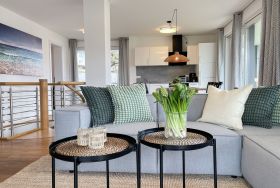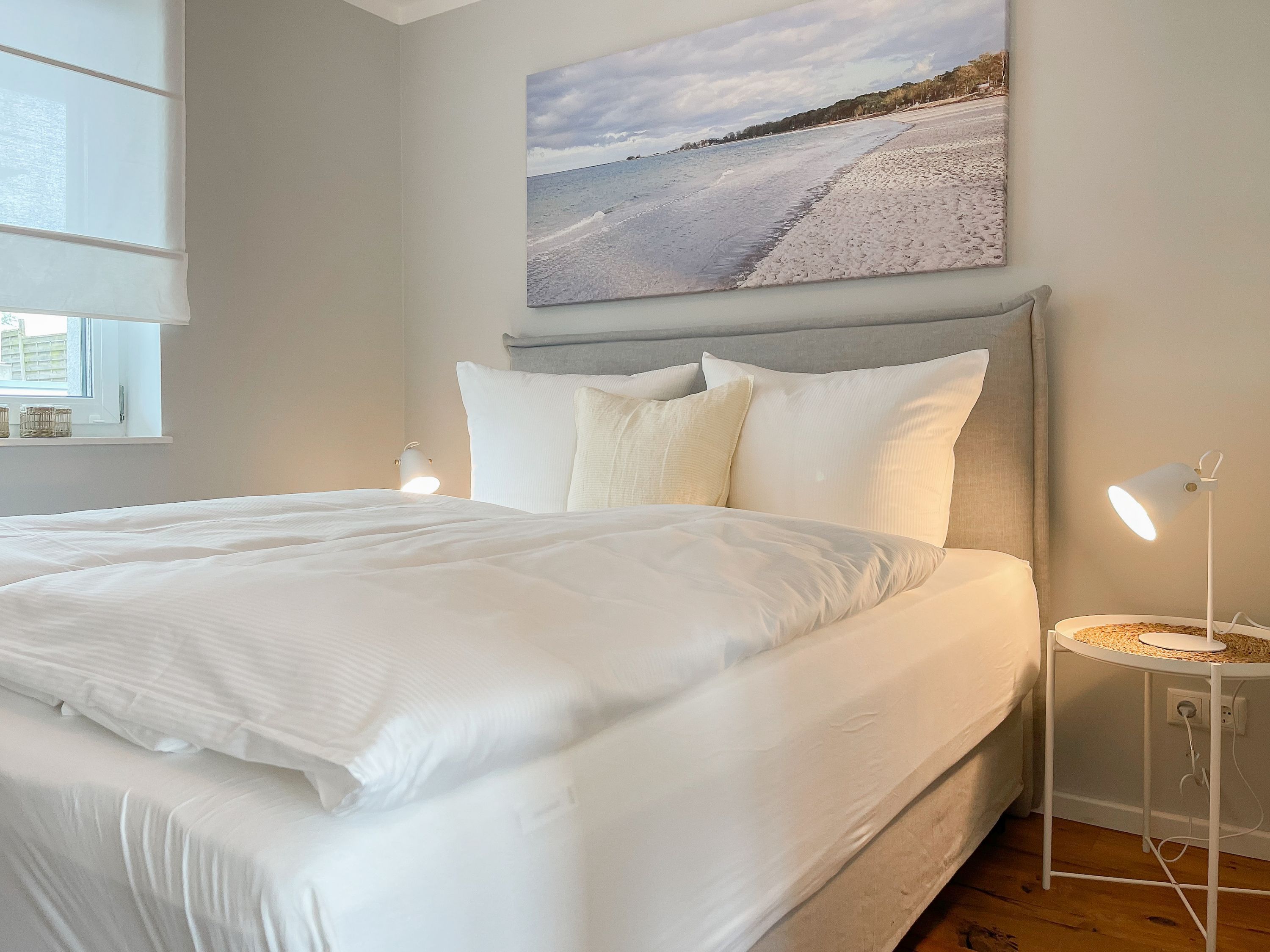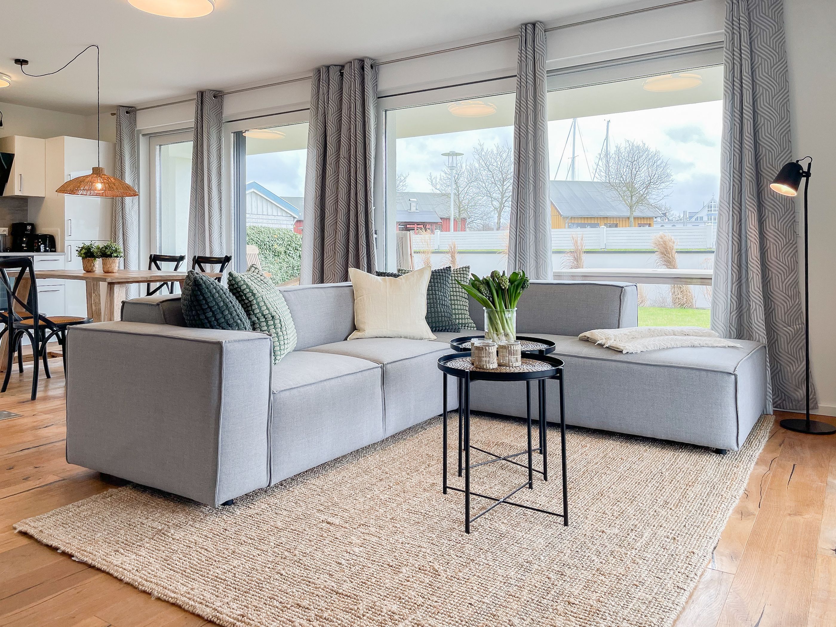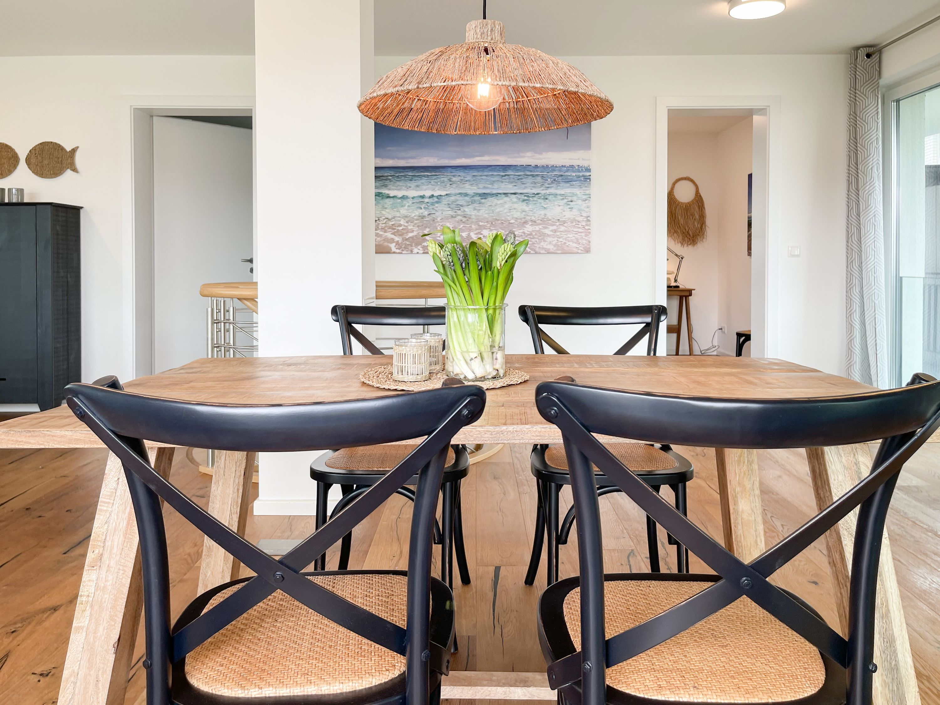 Die Ferienwohnung Hafendeck liegt im Erdgeschoss eines modernen Neubaus mit nur 3 Wohneinheiten und bietet auf 100 qm über 2 Wohnebenen ausreichend Raum für 5 Personen, um einen entspannten Urlaub in absoluter Strandnähe zu verleben. Das Herzstück der Wohnung bildet der lichtdurchflutete Wohn- und Essbereich mit bodentiefen Fensterelementen und einem schönen Blick auf die Holzterrasse und in den Garten, der ausschließlich von den Gästen des Hafendecks genutzt wird. Die großzügig angelegte Sonnenterrasse ist überdacht und sowohl zum Süden als auch zum Westen ausgerichtet. Gartenmöbel und 2 Deckchairs stehen zur Verfügung, um die Sonne von früh bis spät in besonderer Hafenatmosphäre zu genießen und sich an beeindruckenden Sonnenuntergängen bei einem Glas Wein zu erfreuen. Die offene Küche ist in den Wohnbereich integriert und bestens ausgestattet. Im EG befindet sich auch Schlafzimmer 1 mit einem Boxspringbett (160x200), geräumigem Kleiderschrank und Verdunkelungsplissees sowie ein kleines Bad mit Dusche, WC, Waschbecken und Fenster. Als Home Office dient ein weiterer abgeschlossener Raum, der mit einem Schreibtisch eingerichtet ist.