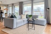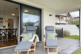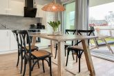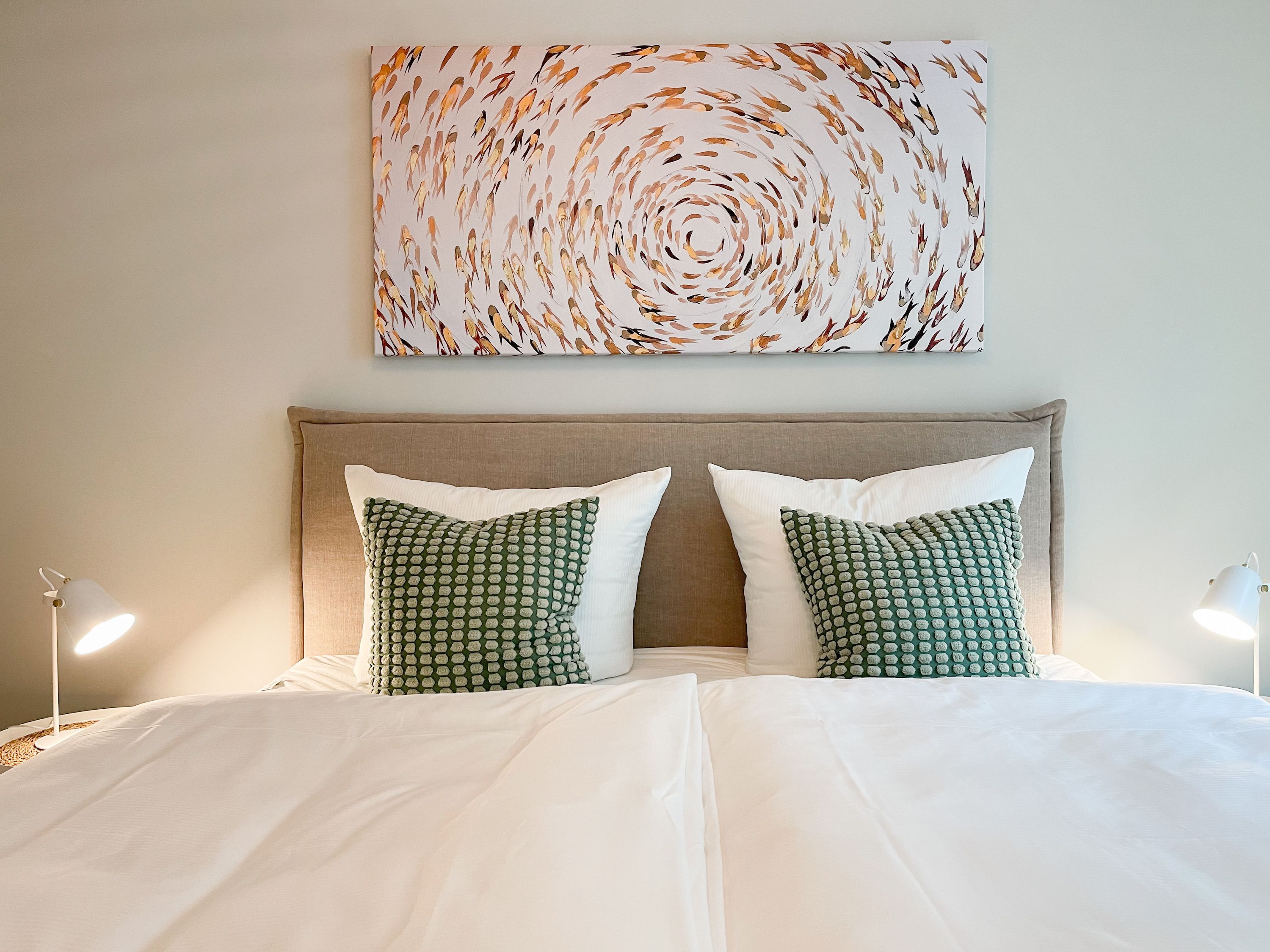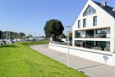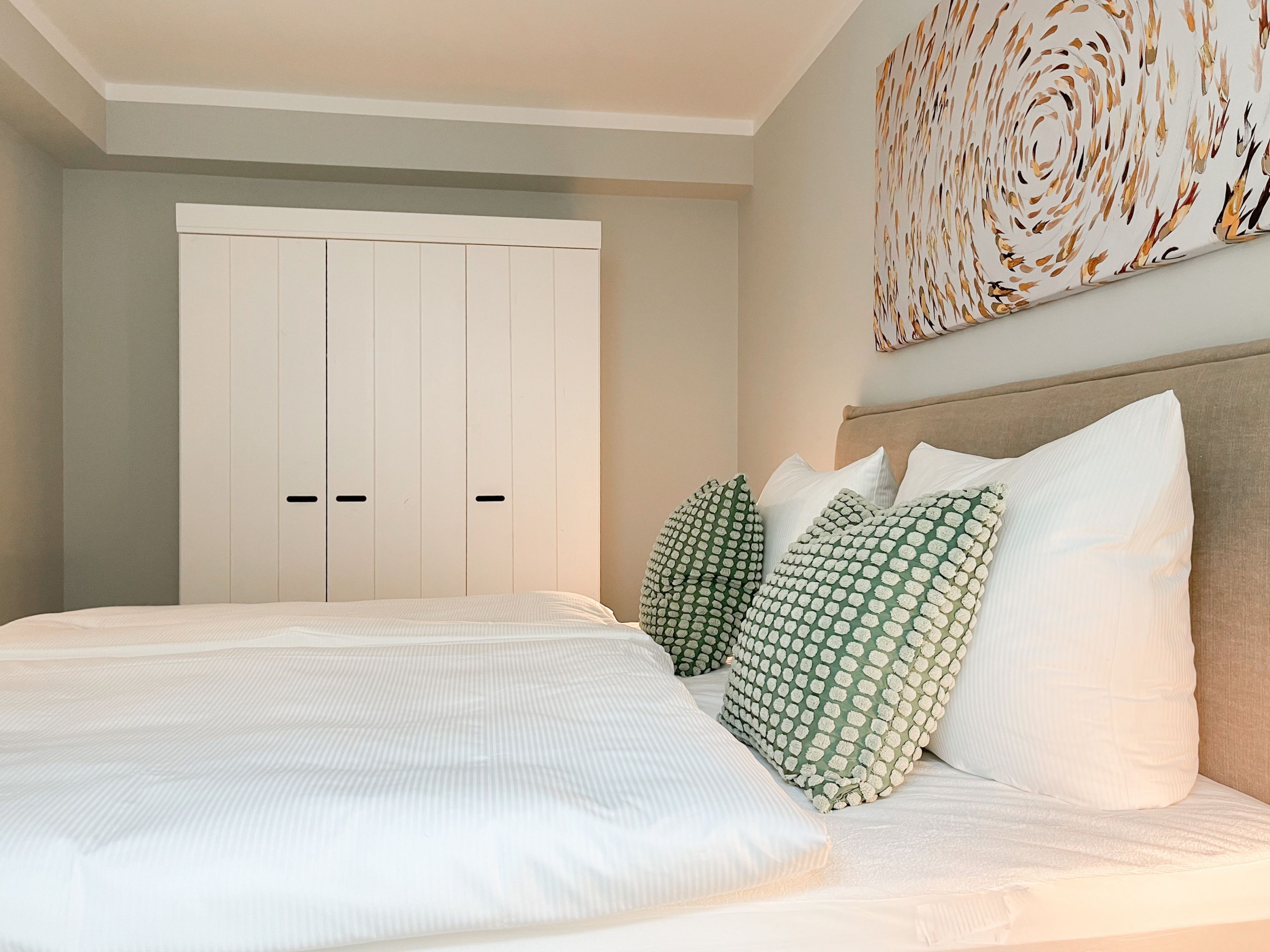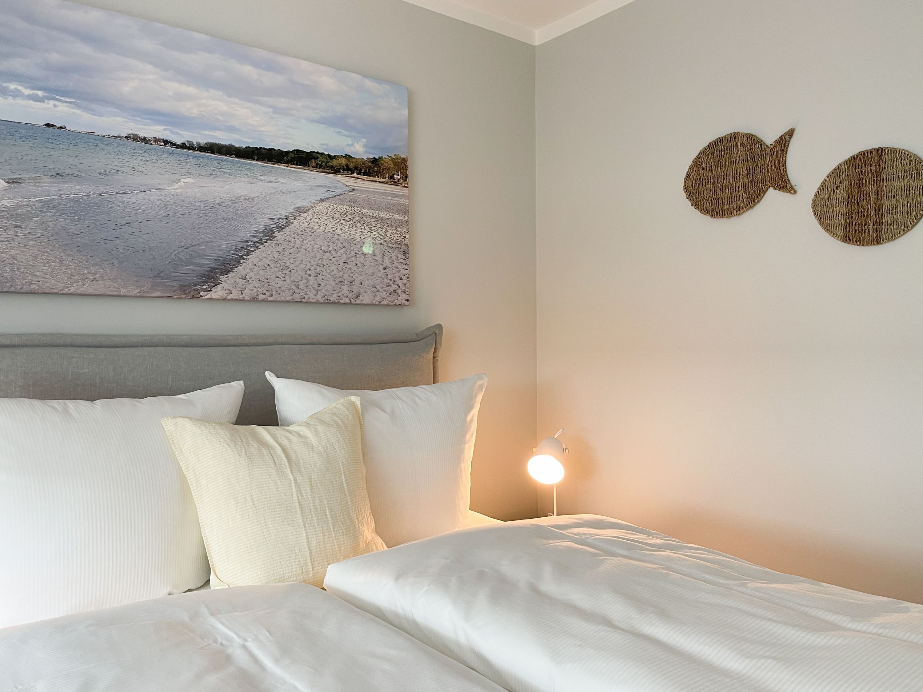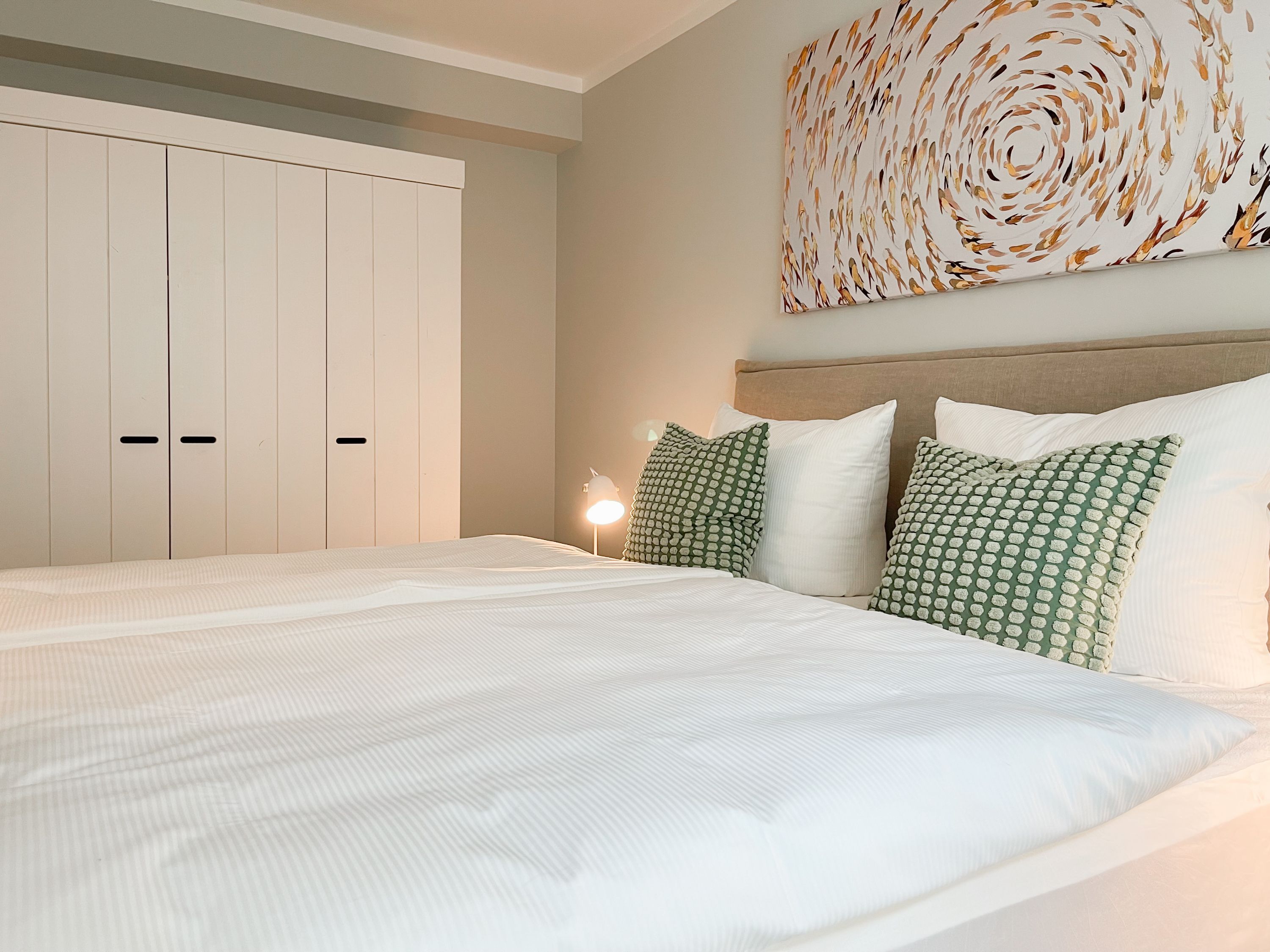 Die Ferienwohnung Hafendeck liegt im Erdgeschoss eines modernen Neubaus mit nur 3 Wohneinheiten und bietet auf 100 qm über 2 Wohnebenen ausreichend Raum für 5 Personen, um einen entspannten Urlaub in absoluter Strandnähe zu verleben. Das Herzstück der Wohnung bildet der lichtdurchflutete Wohn- und Essbereich mit bodentiefen Fensterelementen und einem schönen Blick auf die Holzterrasse und in den Garten, der ausschließlich von den Gästen des Hafendecks genutzt wird. Die großzügig angelegte Sonnenterrasse ist überdacht und sowohl zum Süden als auch zum Westen ausgerichtet. Gartenmöbel und 2 Deckchairs stehen zur Verfügung, um die Sonne von früh bis spät in besonderer Hafenatmosphäre zu genießen und sich an beeindruckenden Sonnenuntergängen bei einem Glas Wein zu erfreuen. Die offene Küche ist in den Wohnbereich integriert und bestens ausgestattet. Im EG befindet sich auch Schlafzimmer 1 mit einem Boxspringbett (160x200), geräumigem Kleiderschrank und Verdunkelungsplissees sowie ein kleines Bad mit Dusche, WC, Waschbecken und Fenster. Als Home Office dient ein weiterer abgeschlossener Raum, der mit einem Schreibtisch eingerichtet ist.