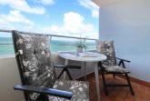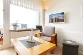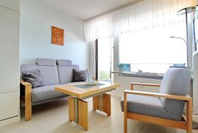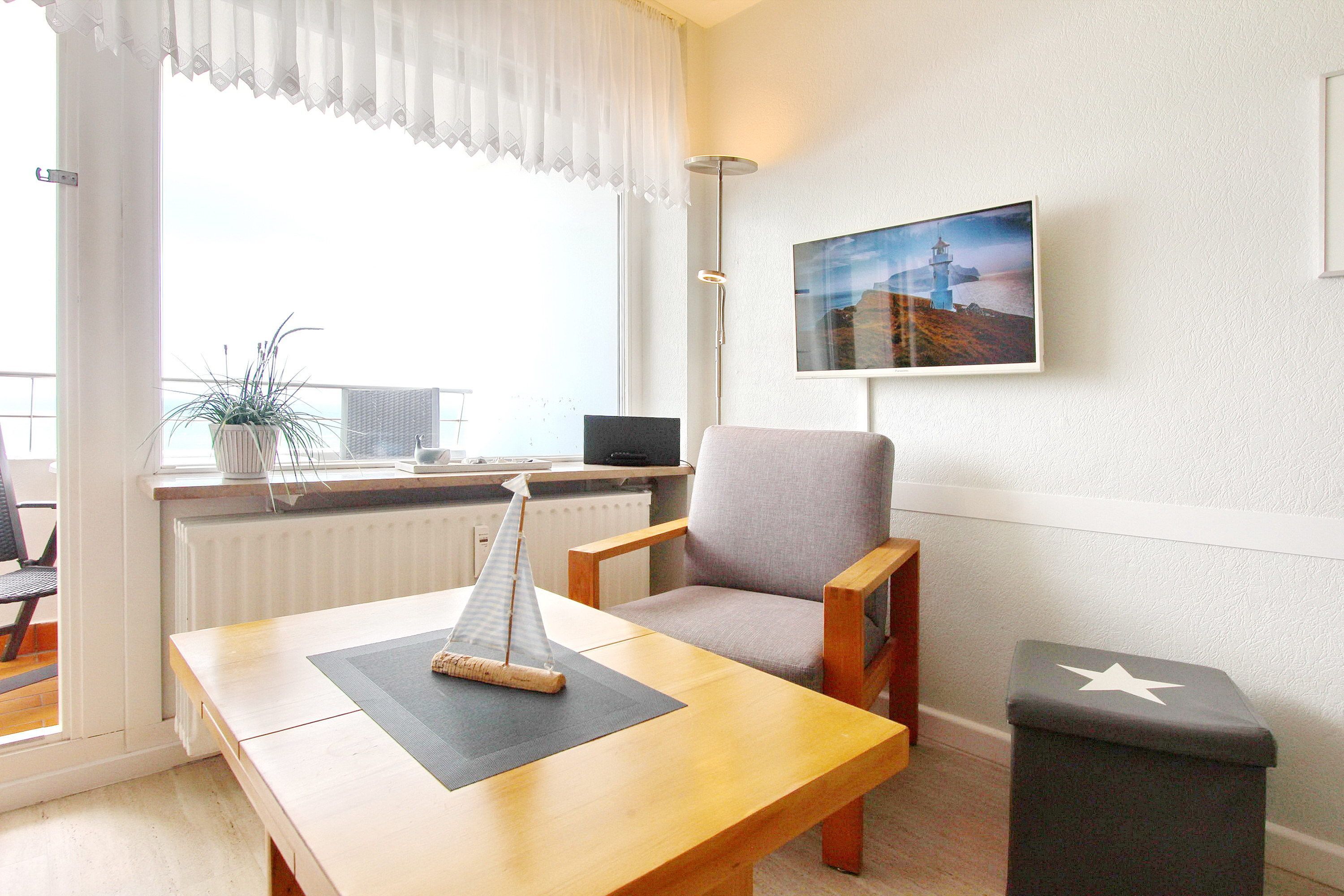 Kleine, aber mit viel Liebe zum Detail eingerichtete Einzimmerwohnung in der 9. Etage im Haus Metropol mit wunderschönem Strand- und Nordseeblick. Der kombinierte Wohn-/Schlafraum mit vorgelagertem Westbalkon ist eingerichtet mit Einzelschrankbetten, Designfussboden, 2 Sitzercouch mit Wohn-Esstisch und Fernsehsessel. Auf dem Balkon gibt es zwei Hochlehnerstühle mit Auflagen und einen Tisch. Das Badezimmer hat eine Dusche mit festem Haltegriff und Hocker. In der Einbauküche mit Mikrowelle, Ceranfeld (2 Platten) und Geschirrspüler können sie sich selbst verpflegen. Zur technischen Ausstattung gehört: ein Smart- TV mit integriertem Radio und eine Bluetoothanlage mit CD Player. Ein freies WLAN Netzwerk (WEG Haus Metropol - Passwortfrei - ohne Gewähr) steht ihnen kostenfrei zur Verfügung. Diese Nichtraucherwohnung hat eine Größe von ca. 25 m².