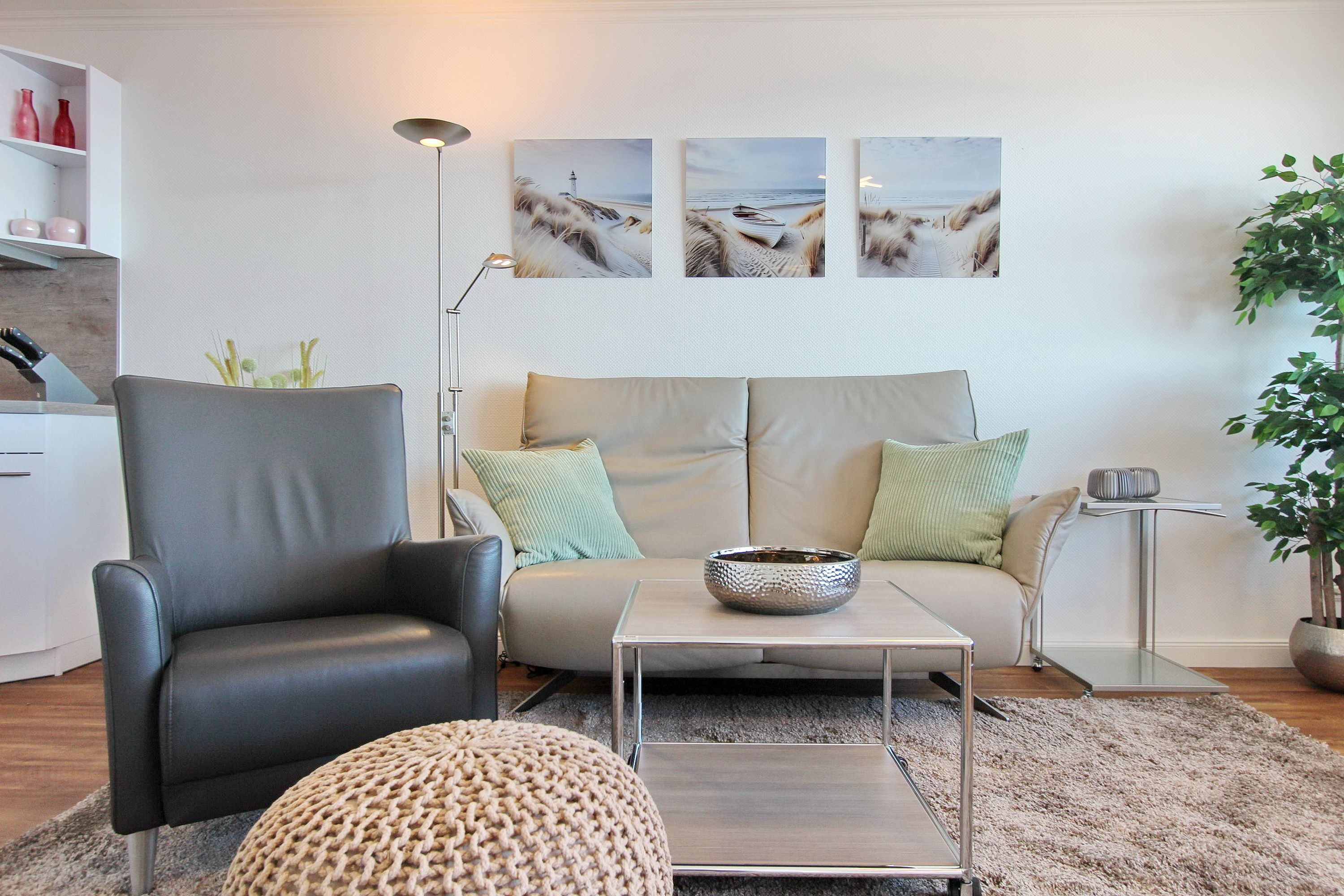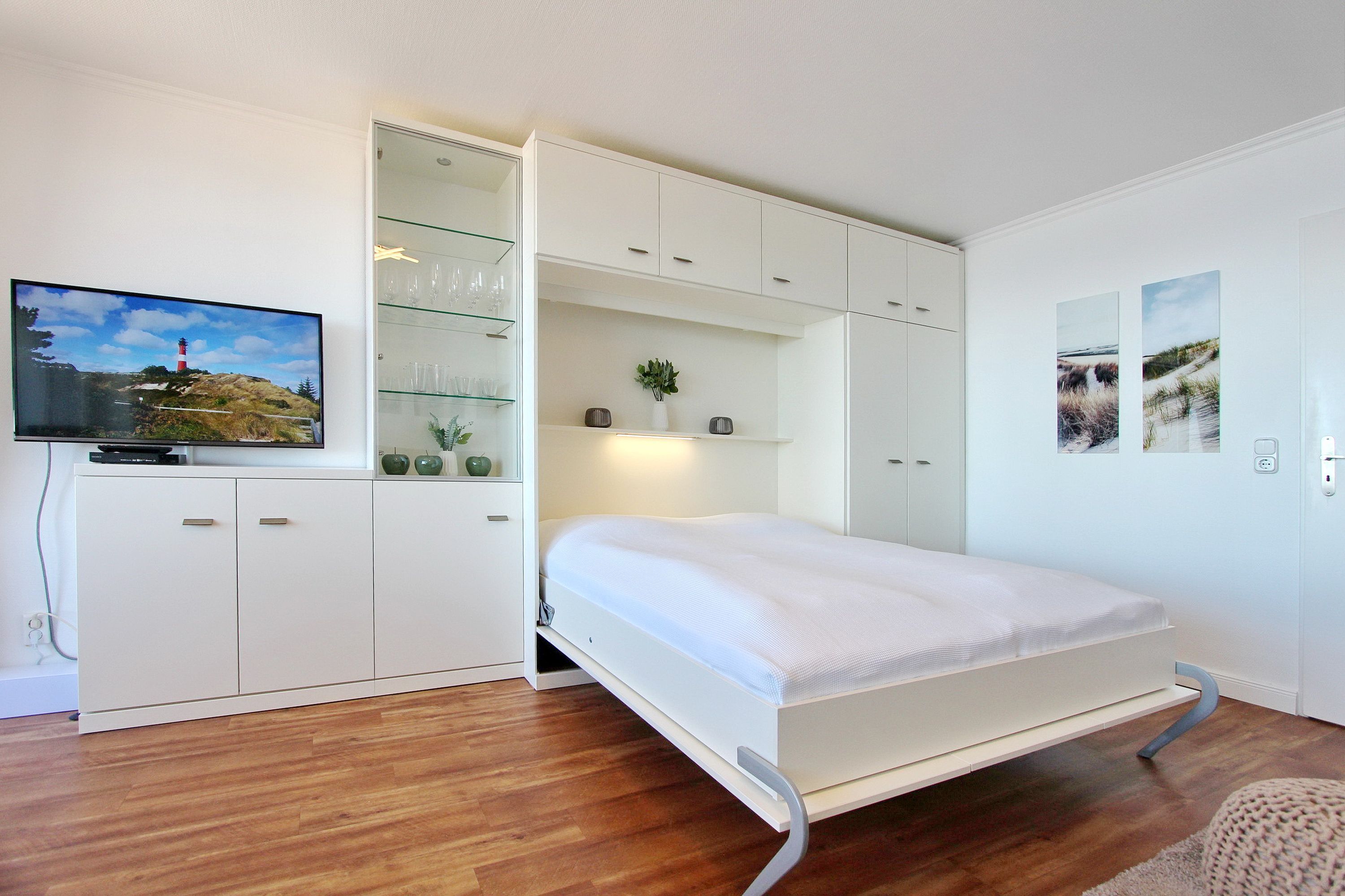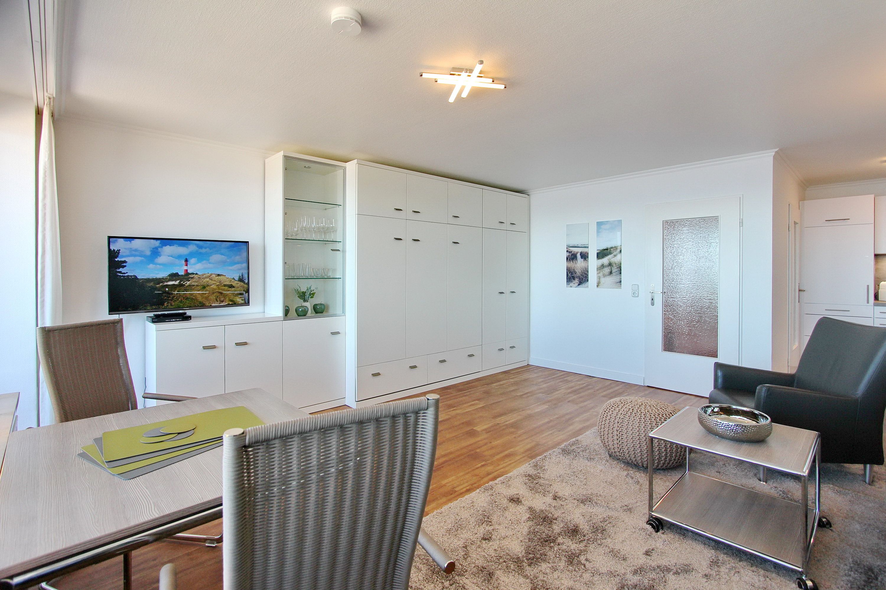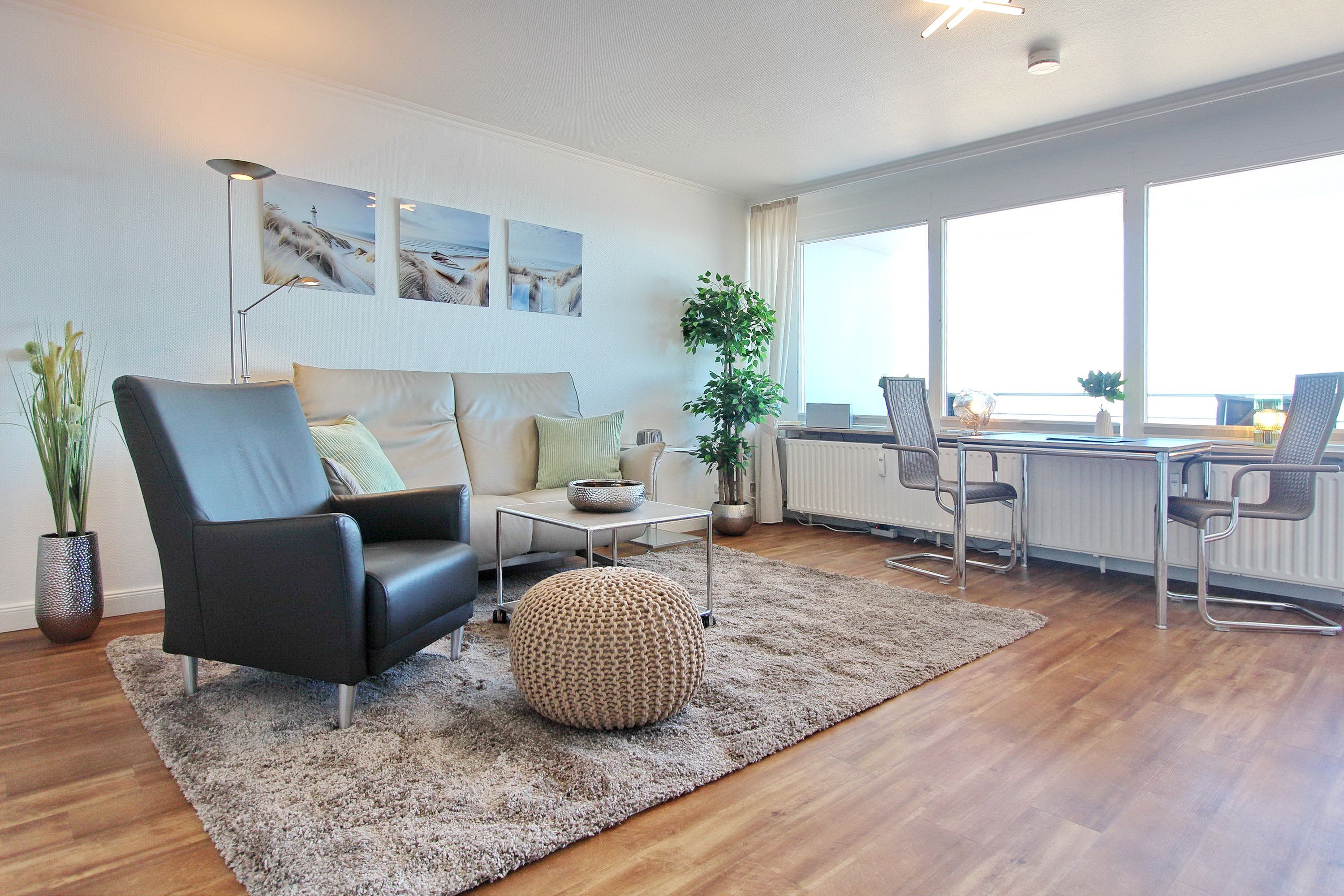 Diese gemütliche Einzimmerwohnung befindet sich in der 9. Etage des Haus Metropol und hat einen herrlichen Blick über den Strand und die Nordsee. Der hell und freundlich eingerichtete Wohn-/Schlafraum mit vorgelagertem Westbalkon verfügt über ein Doppelschrankbett, einen Essplatz mit 2 Stühlen am Fenster sowie eine bequeme Sitzgruppe mit 2er Sofa und Fernsehsessel. Der Holzfussboden verleiht dem Raum Wärme und Gemütlichkeit und in den Schränken ist ausreichend Stauraum für Ihre persönlichen Dinge. Im Badezimmer gibt es eine Dusche, einen Handtuchtrockner, Kosmetikspiegel und Fön. Die zum Wohnraum offene Küche verfügt über ein Ceranfeld mit 4 Herdplatten und einen Geschirrspüler. Moderne Küchengeräte der Firma WMF (z.B. Eierkocher, Smoothiemaker, Mixer) eine zusätzliche Nespresso Maschine und hochwertiges Geschirr und Gläser stehen Ihnen zur Verfügung. Zur technischen Ausstattung dieser Nichtraucherwohnung gehört: ein Flachbildfernseher der Firma LG, ein Bluray Player und eine Bluetoothanlage mit CD Spieler von Sony. Das freie WLAN Netzwerk (WEG Haus Metropol - Passwortfrei - ohne Gewähr) können Sie kostenfrei nutzen. Wohnungsgröße: ca. 42 m².