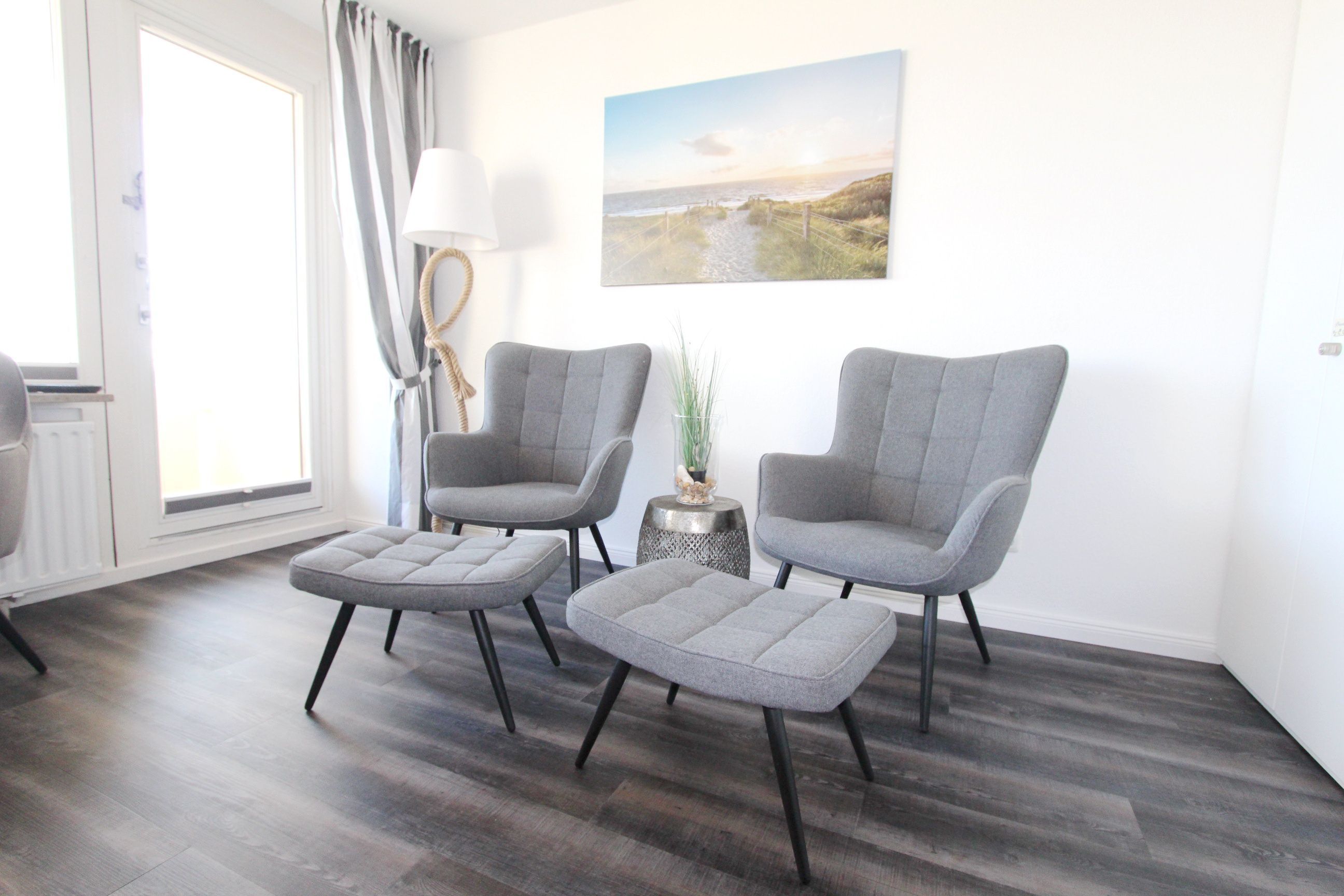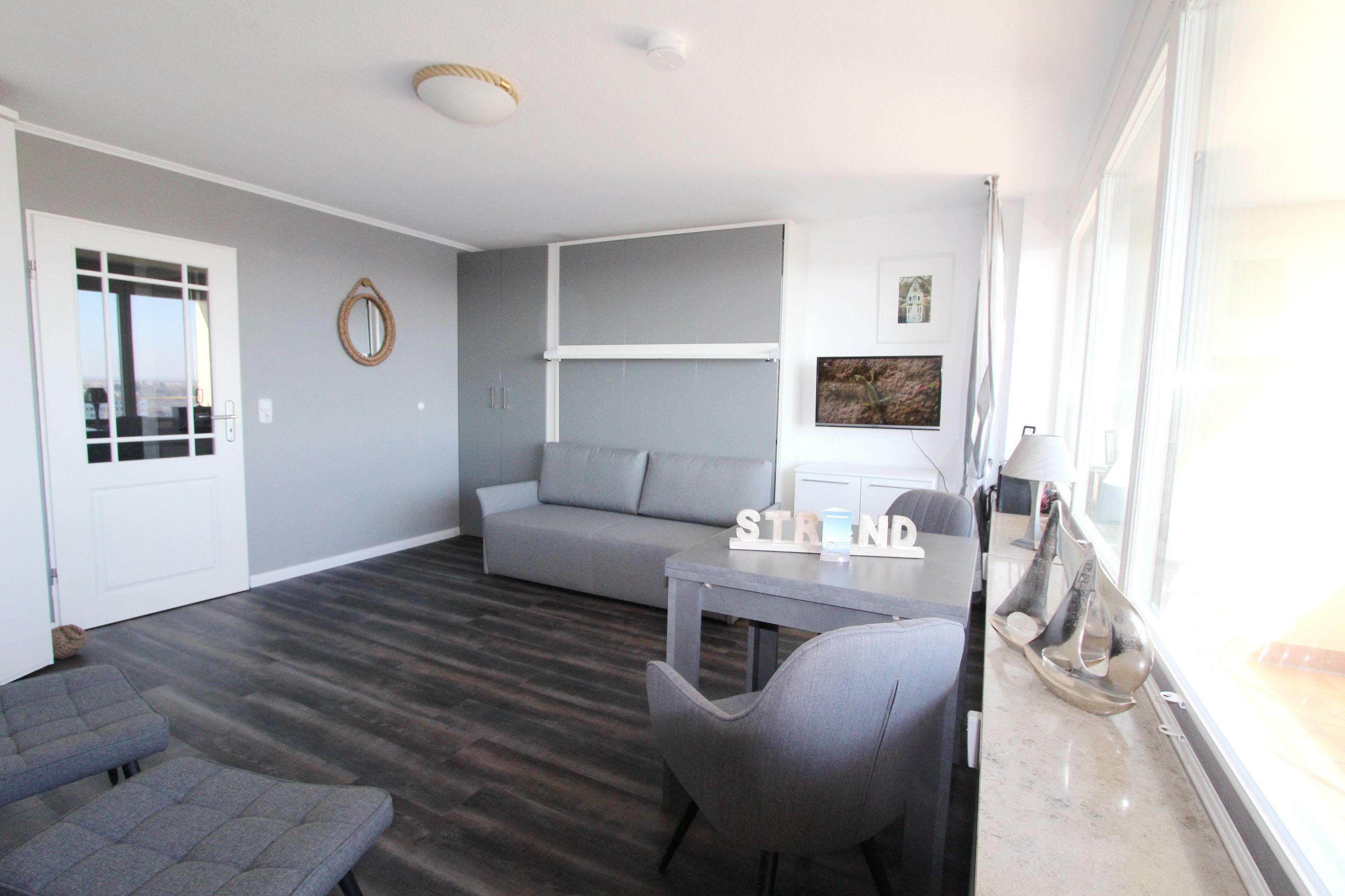 Einzimmerwohnung in der 9. Etage im Haus Metropol mit herrlichem Weitblick über die Insel und die Stadt Westerland. Bei klarem Wetter können sie bis zum nordfriesischen Wattenmeer und dem Festland schauen. Der kombinierte Wohn-/Schlafraum hat einen vorgelagerten großen Ostbalkon mit Balkonmöbeln und Auflagen. Ein Doppelschrankbett, ein Essplatz mit 2 Stühlen am Fenster, eine Couch und 2 Fernsehsessel mit Fusshockern und viel Schrankfläche, für Ihre persönlichen Dinge, steht ihnen zur Verfügung. Im Wohnraum wurde Designboden verlegt. Das Badezimmer hat eine Dusche, einen Duschhocker und einen Handtuchtrockner. In der separaten Küche mit Mikrowellen Backkombination, Ceranfeld mit 4 Herdplatten, Geschirrspüler und zusätzlicher Senseo Padmaschine können sie sich selbst verpflegen. Zur technischen Ausstattung dieser Wohnung gehört: ein Flachbildfernseher und ein Radio mit CD Player. Das freie WLAN Netzwerk Hotspot (WEG Haus Metropol - Passwortfrei - ohne Gewähr) steht ihnen kostenfrei zur Verfügung. Wohnungsgröße ca. 38 m².