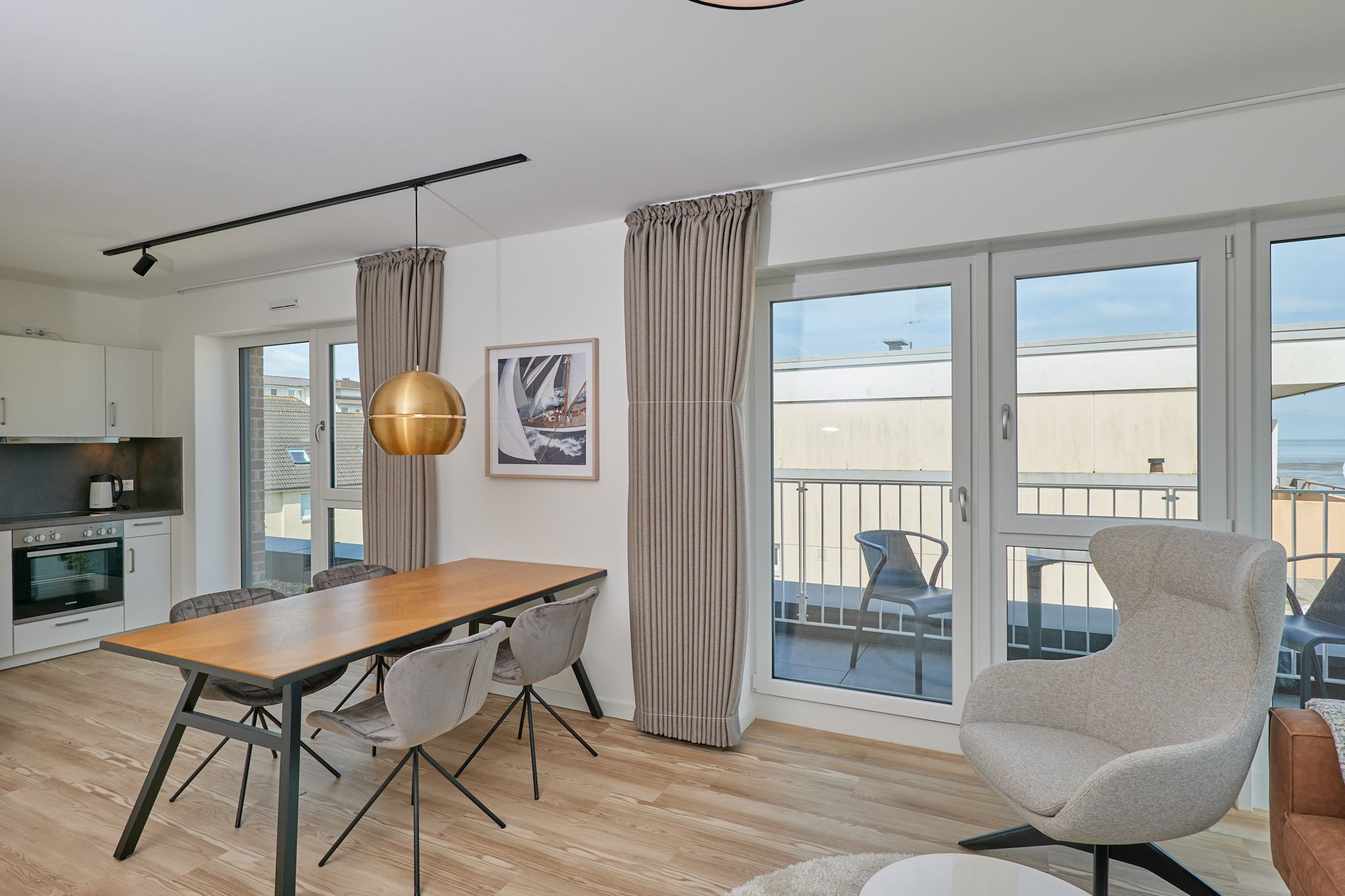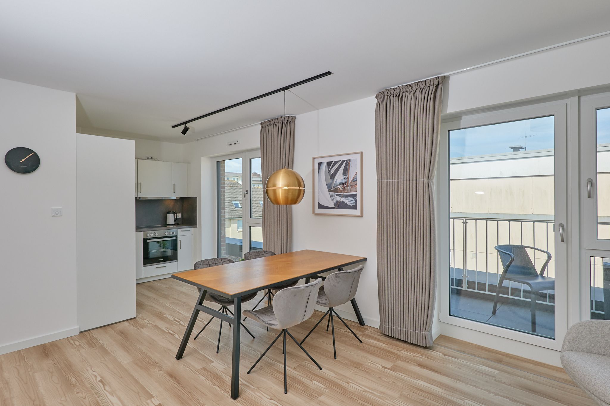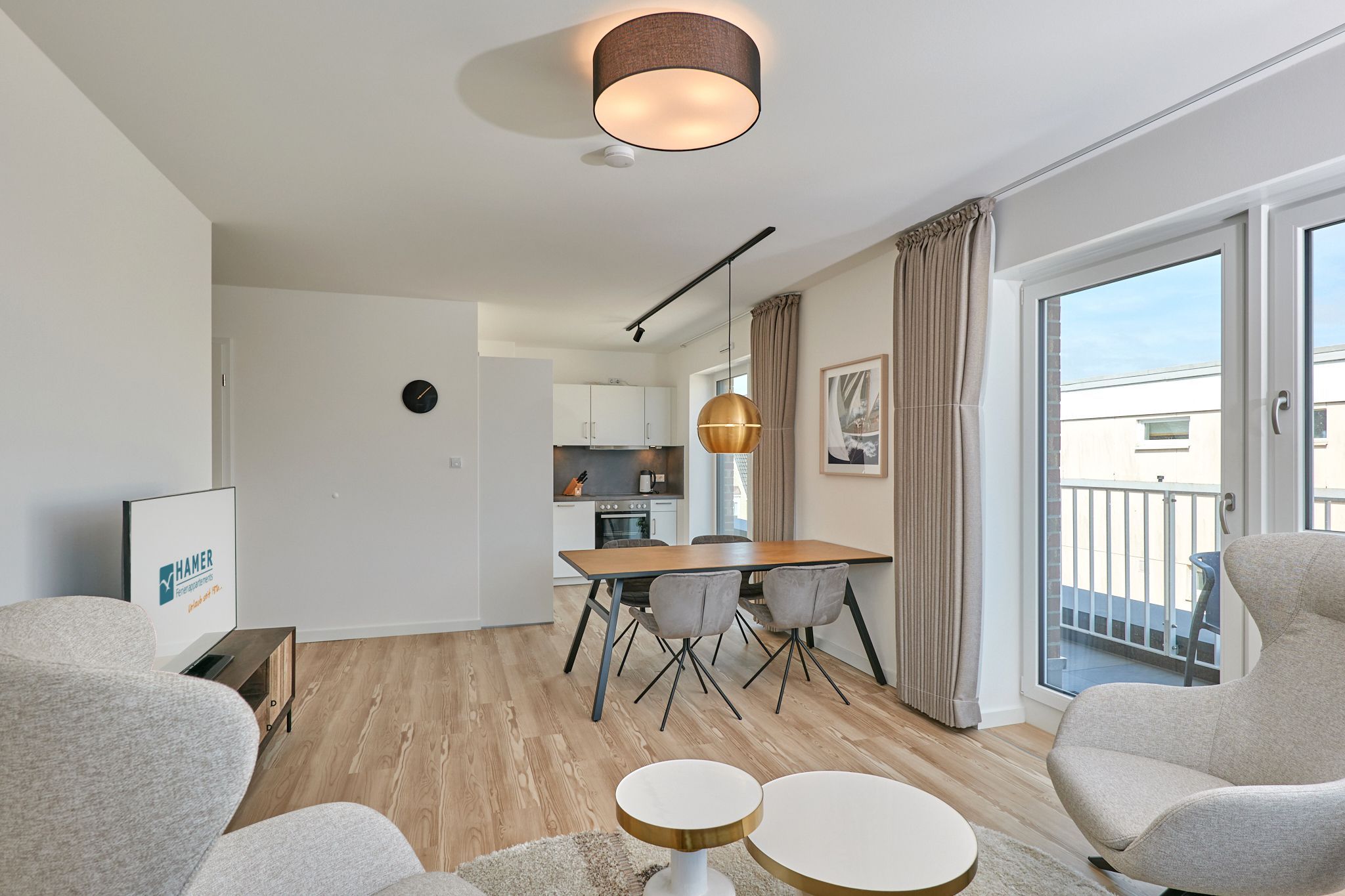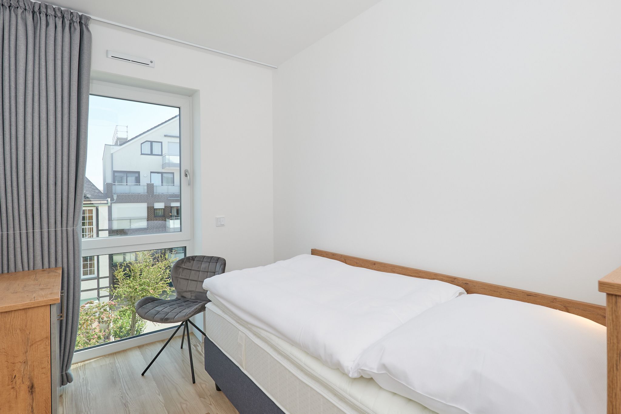 Neubau Mai 2023! Sehr schöne, moderne 3-Raum-Wohnung bis 4 Pers. voll ausgestattet auf ca. 80 m² in der 3.Etage gelegen, 2 Schlafzimmer (1x Doppelbett, 1x 2 Einzelbetten) und Außenjalousien an allen Fenstern, ebenerdige Dusche/WC, Wohnzimmer mit großer Küchenzeile (Backofen, Geschirrspüler, Mikrowelle) u. Teilseesicht, 2x Kabel-TV, Radio, kostenfreies W-LAN-Internet, kleiner Balkon (nord) mit Teilseesicht, Personenaufzug, reservierter Pkw-Stellplatz in der Tiefgarage inkl., es sind keine Haustiere erlaubt und natürlich Nichtraucher. Durchfahrtshöhe Tiefgarage: 2,05m.