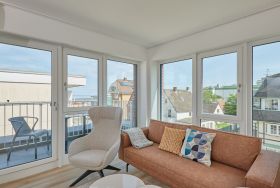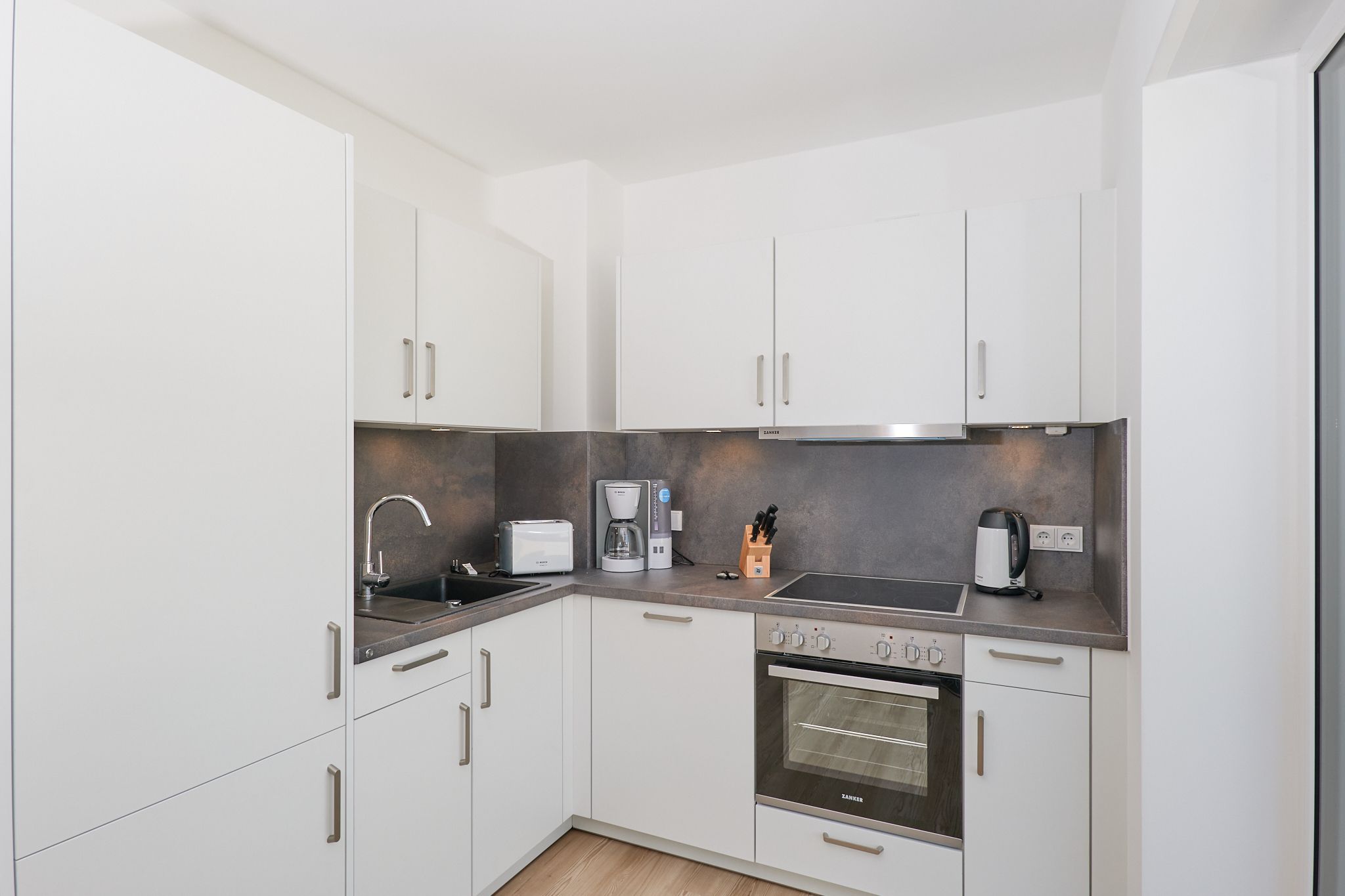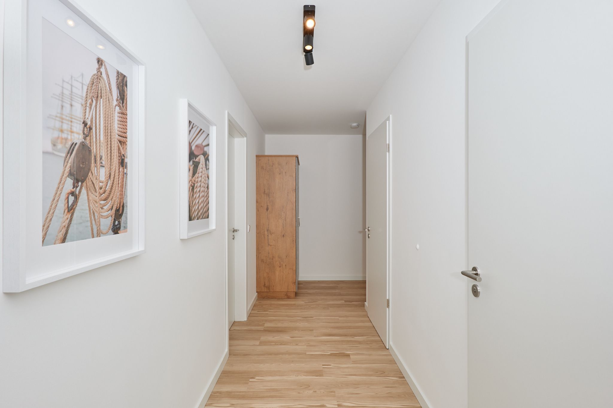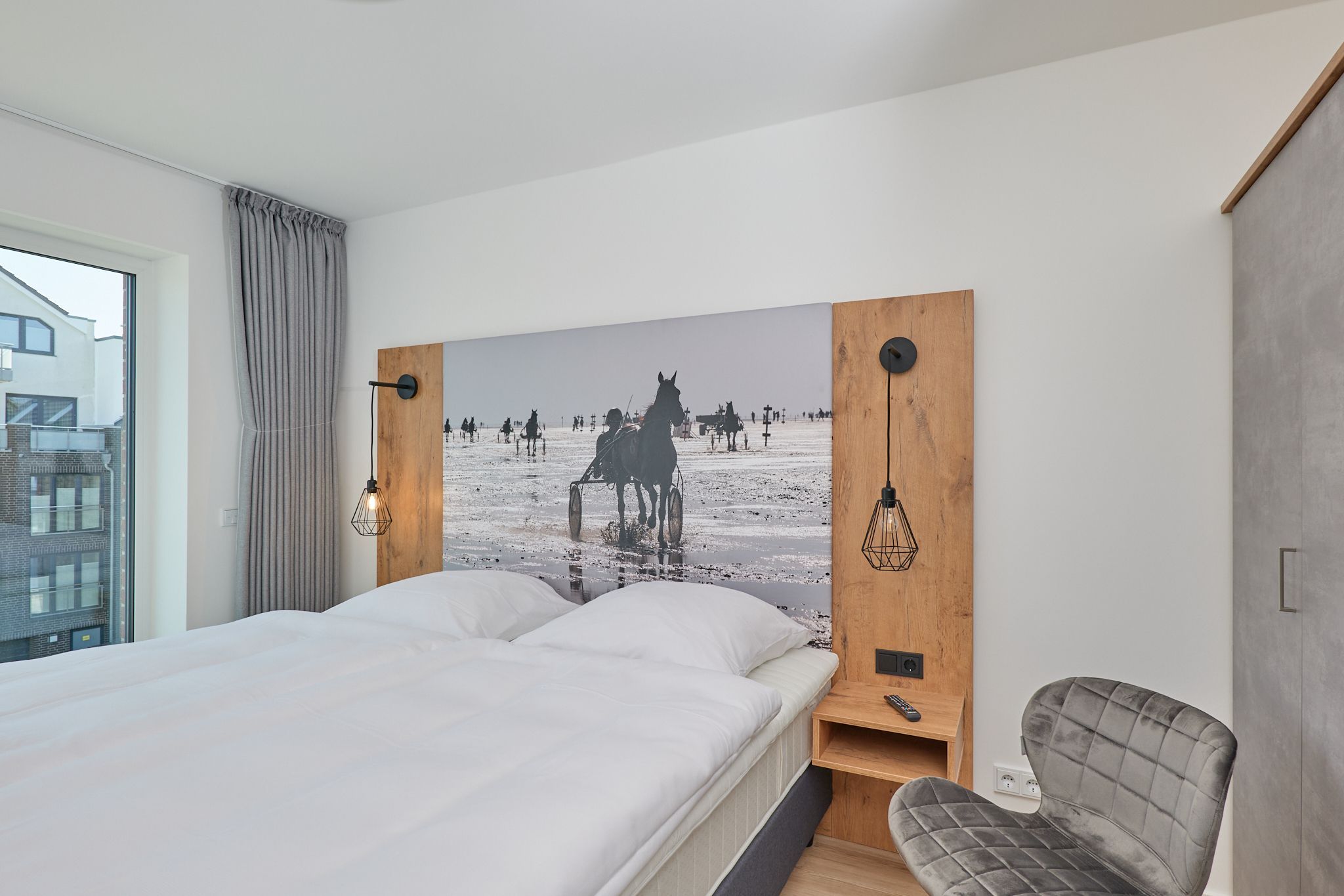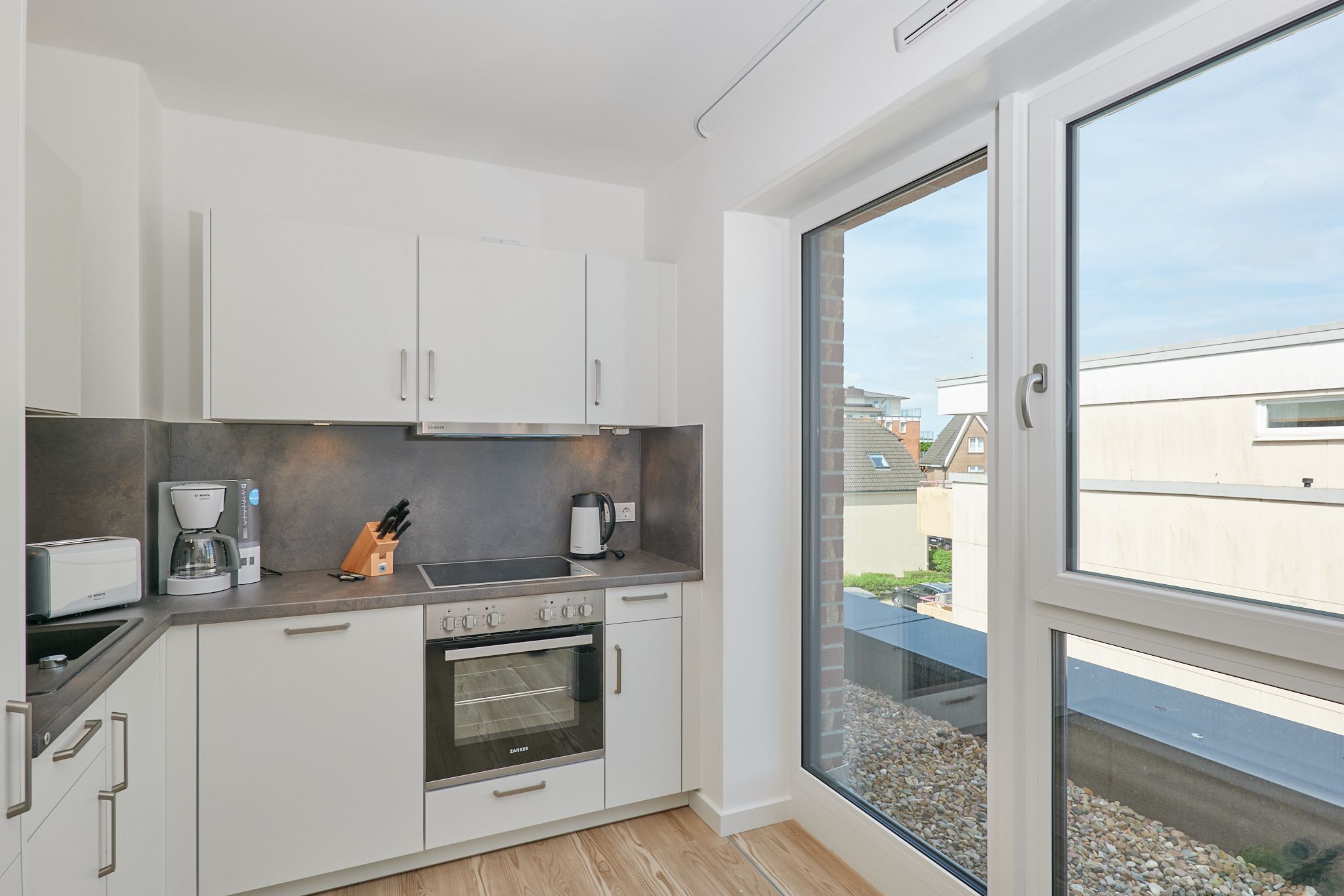 Neubau Mai 2023! Sehr schöne, moderne 3-Raum-Wohnung bis 4 Pers. voll ausgestattet auf ca. 80 m² in der 3.Etage gelegen, 2 Schlafzimmer (1x Doppelbett, 1x 2 Einzelbetten) und Außenjalousien an allen Fenstern, ebenerdige Dusche/WC, Wohnzimmer mit großer Küchenzeile (Backofen, Geschirrspüler, Mikrowelle) u. Teilseesicht, 2x Kabel-TV, Radio, kostenfreies W-LAN-Internet, kleiner Balkon (nord) mit Teilseesicht, Personenaufzug, reservierter Pkw-Stellplatz in der Tiefgarage inkl., es sind keine Haustiere erlaubt und natürlich Nichtraucher. Durchfahrtshöhe Tiefgarage: 2,05m.