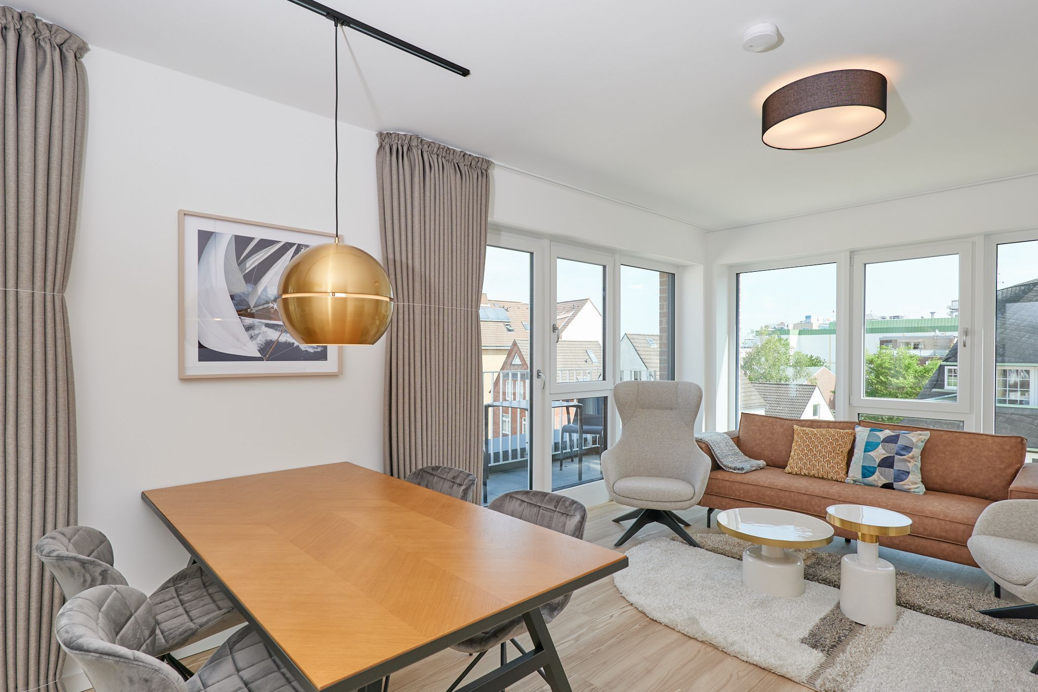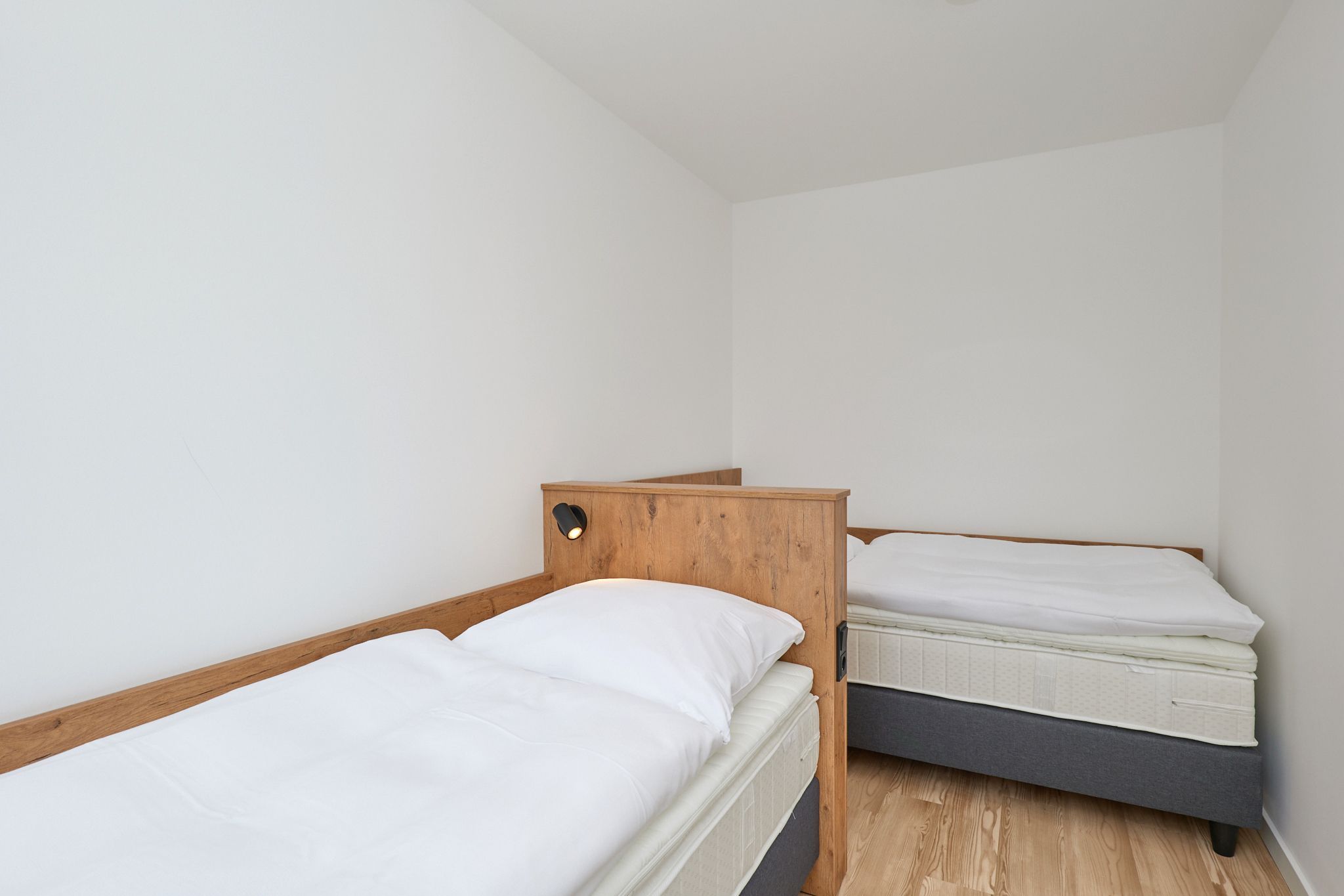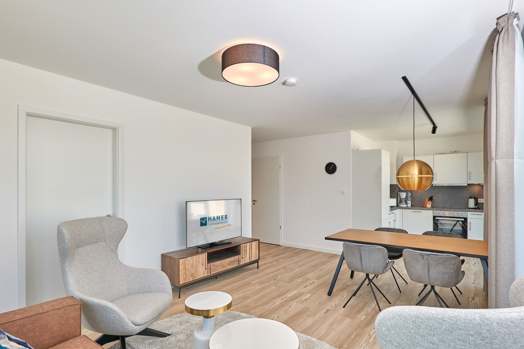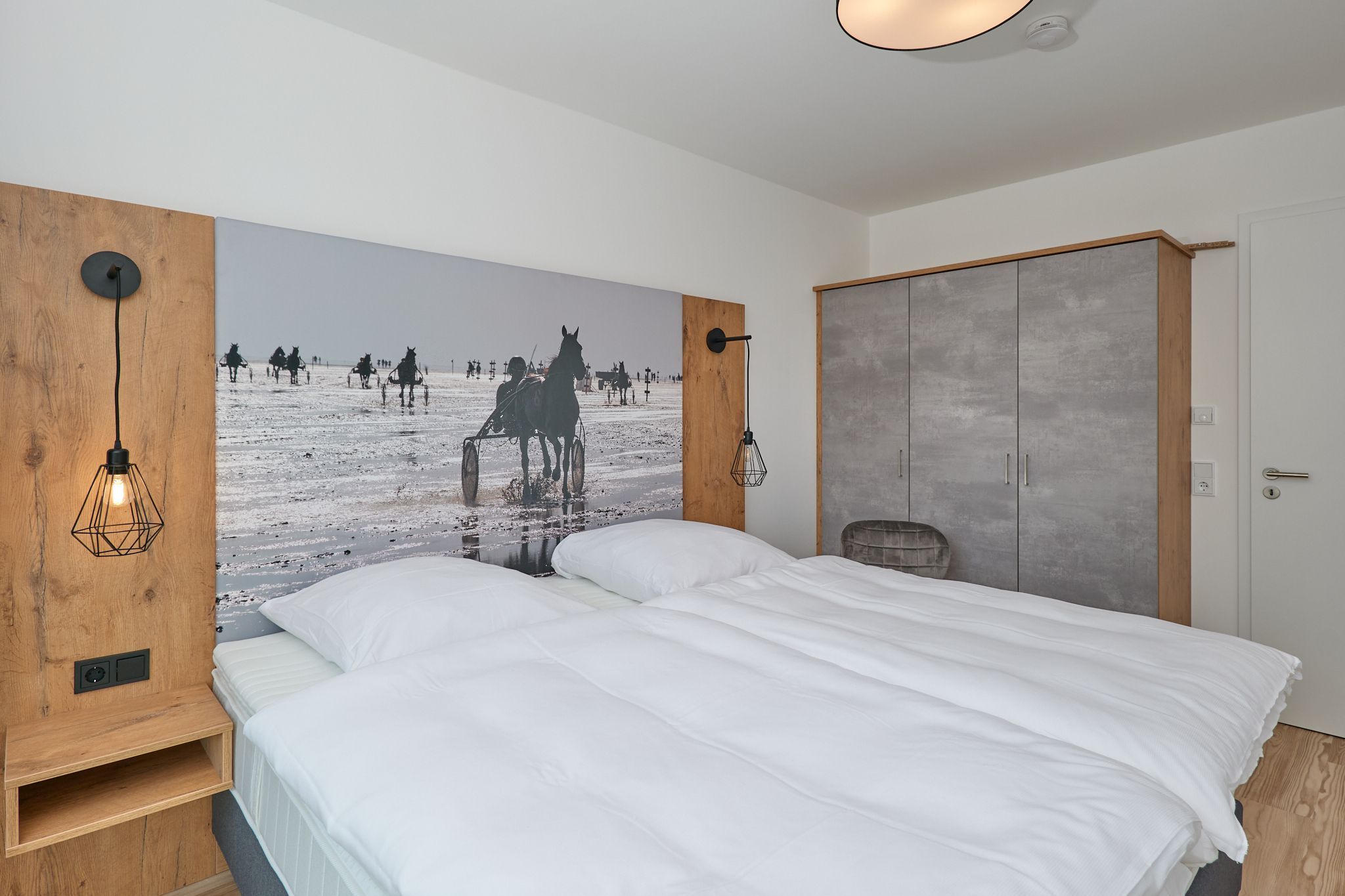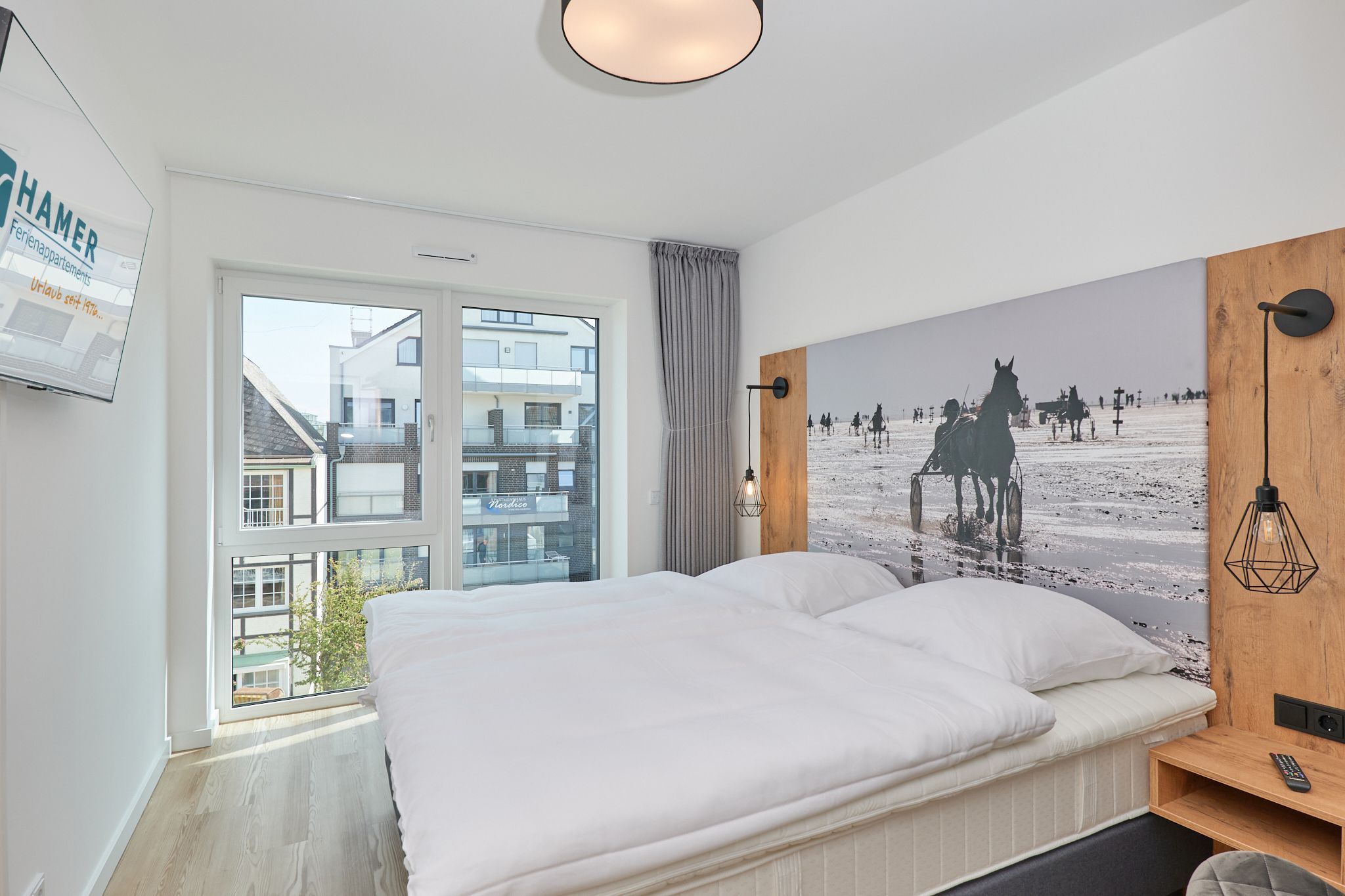 Neubau Mai 2023! Sehr schöne, moderne 3-Raum-Wohnung bis 4 Pers. voll ausgestattet auf ca. 80 m² in der 3.Etage gelegen, 2 Schlafzimmer (1x Doppelbett, 1x 2 Einzelbetten) und Außenjalousien an allen Fenstern, ebenerdige Dusche/WC, Wohnzimmer mit großer Küchenzeile (Backofen, Geschirrspüler, Mikrowelle) u. Teilseesicht, 2x Kabel-TV, Radio, kostenfreies W-LAN-Internet, kleiner Balkon (nord) mit Teilseesicht, Personenaufzug, reservierter Pkw-Stellplatz in der Tiefgarage inkl., es sind keine Haustiere erlaubt und natürlich Nichtraucher. Durchfahrtshöhe Tiefgarage: 2,05m.