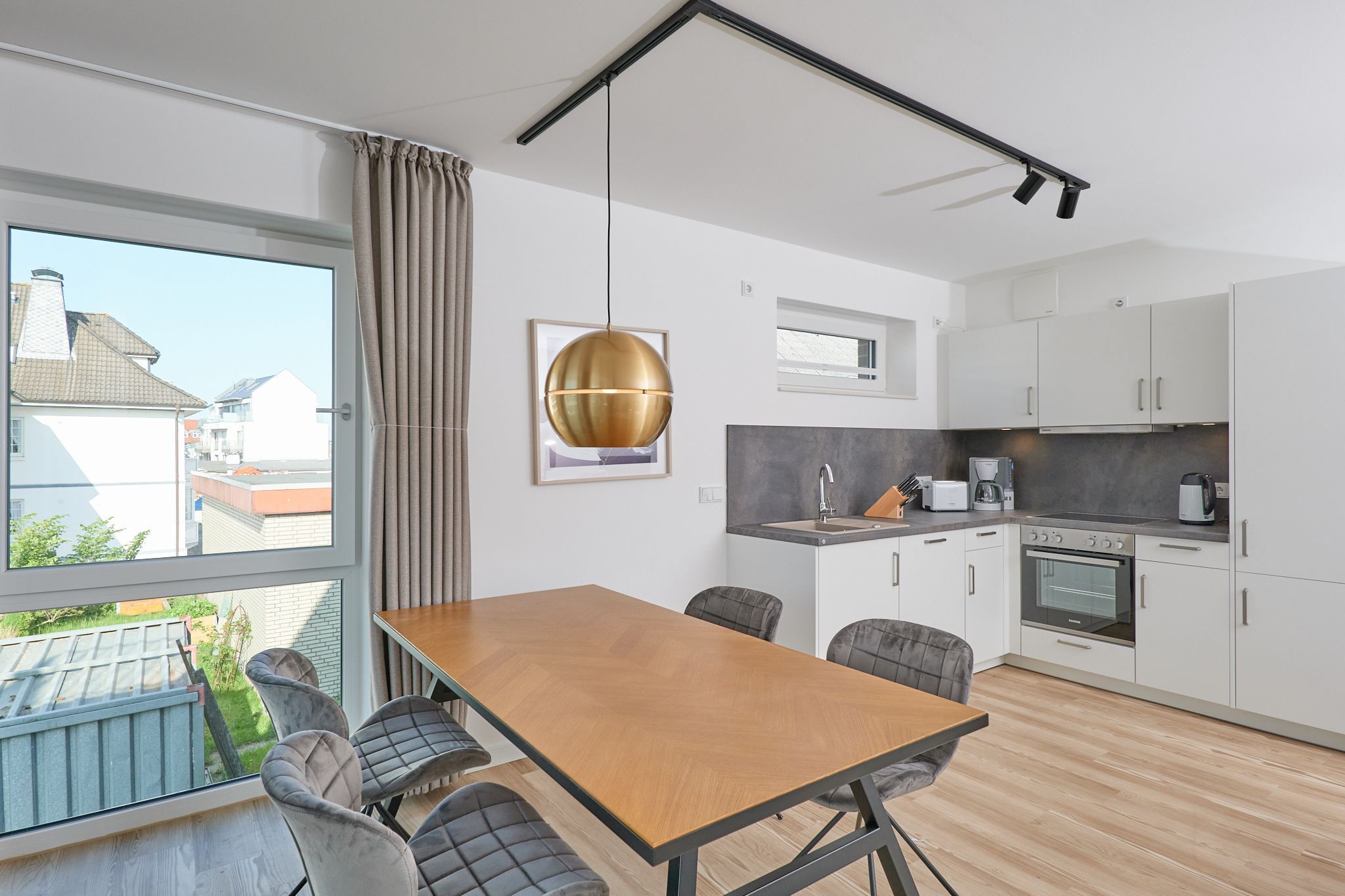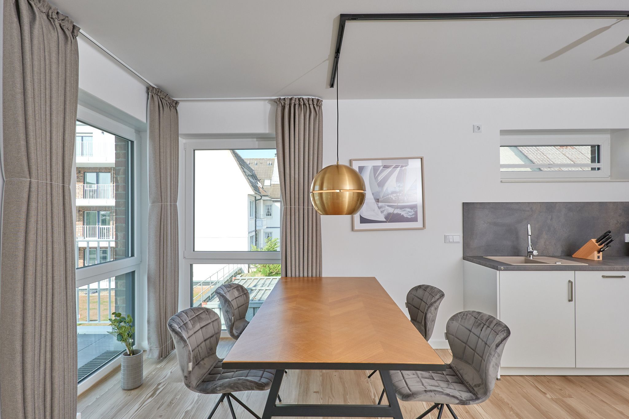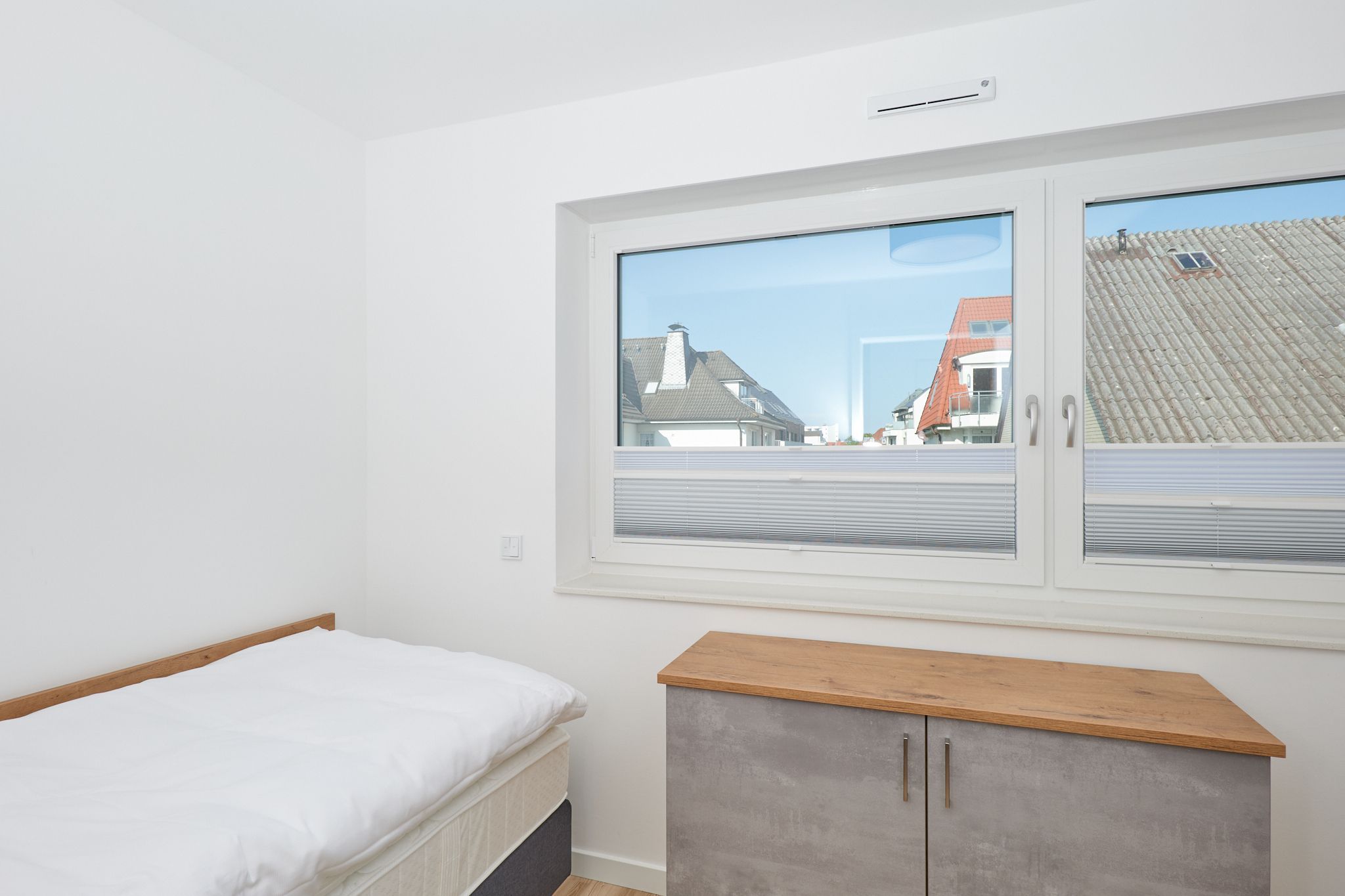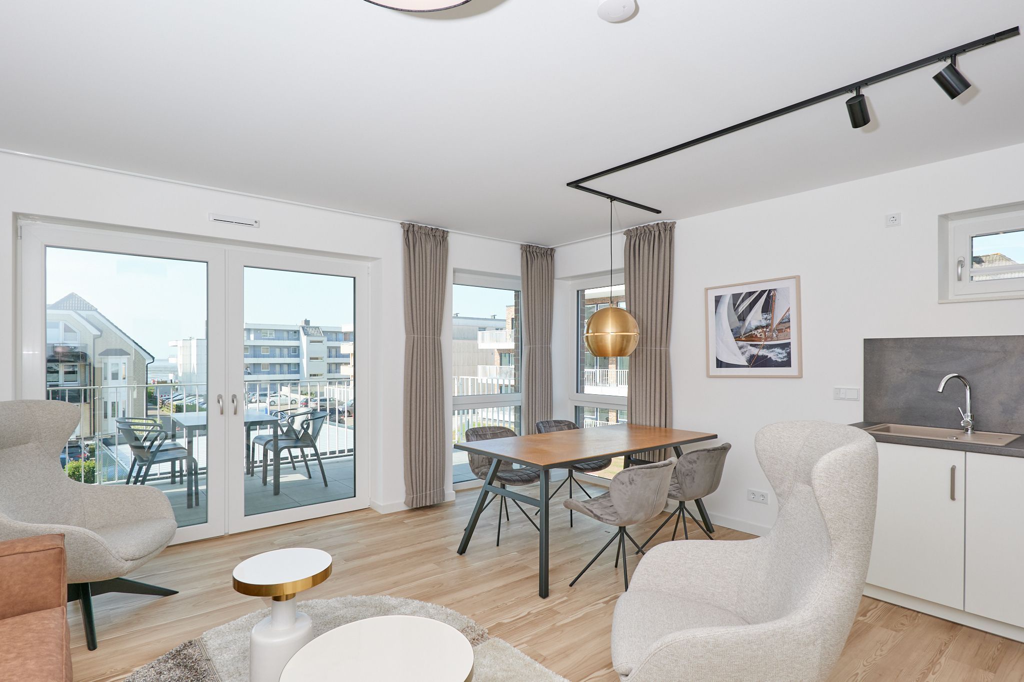 Neubau Mai 2023! Sehr schöne, moderne 3-Raum-Wohnung bis 4 Pers. voll ausgestattet auf ca. 67 m² in der 2.Etage gelegen, 2 Schlafzimmer (1x Doppelbett, 1x 2 Einzelbetten) und Außenjalousien an allen Fenstern, ebenerdige Dusche/WC, Wohnzimmer mit großer Küchenzeile (Backofen, Geschirrspüler, Mikrowelle), 2x Kabel-TV, Radio, kostenfreies W-LAN-Internet, großer Balkon mit Teilseesicht (nord/west), Personenaufzug, die Wohnung ist barrierefrei erreichbar, reservierter Pkw-Stellplatz in der Tiefgarage inkl., es sind keine Haustiere erlaubt und natürlich Nichtraucher. Durchfahrtshöhe Tiefgarage: 2,05m.