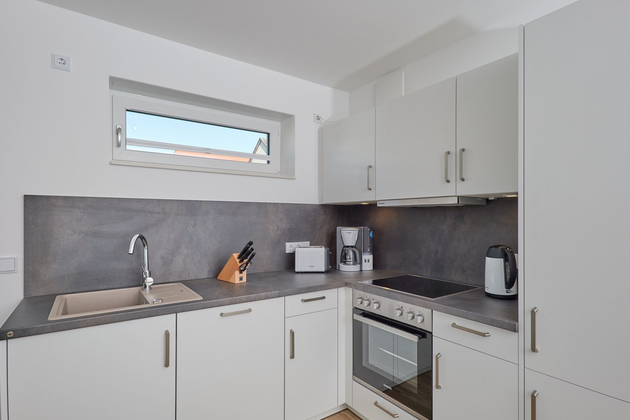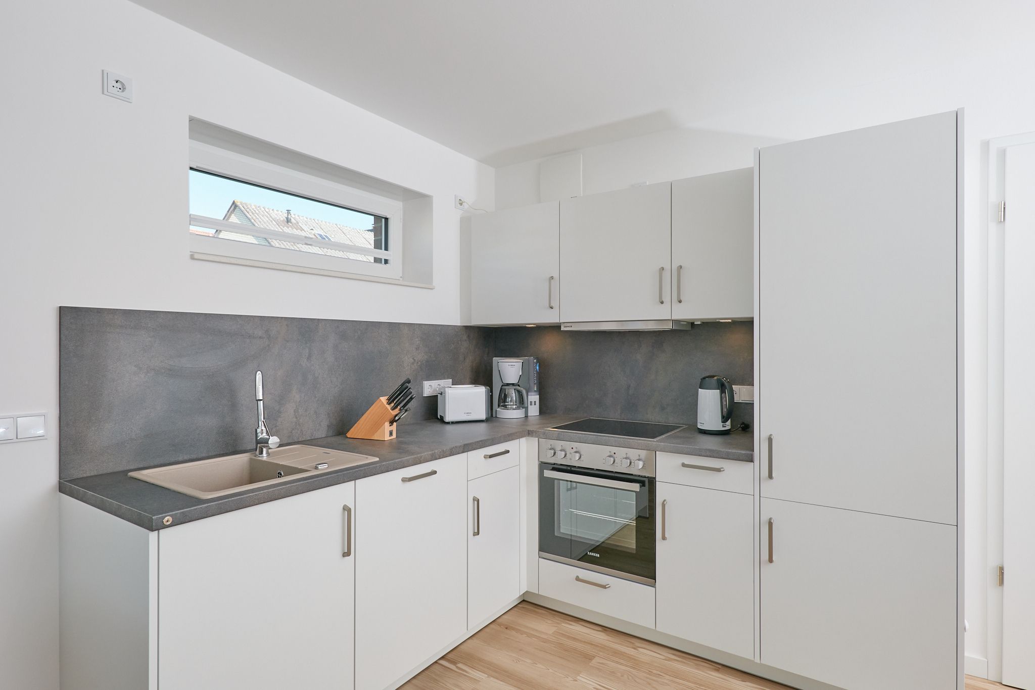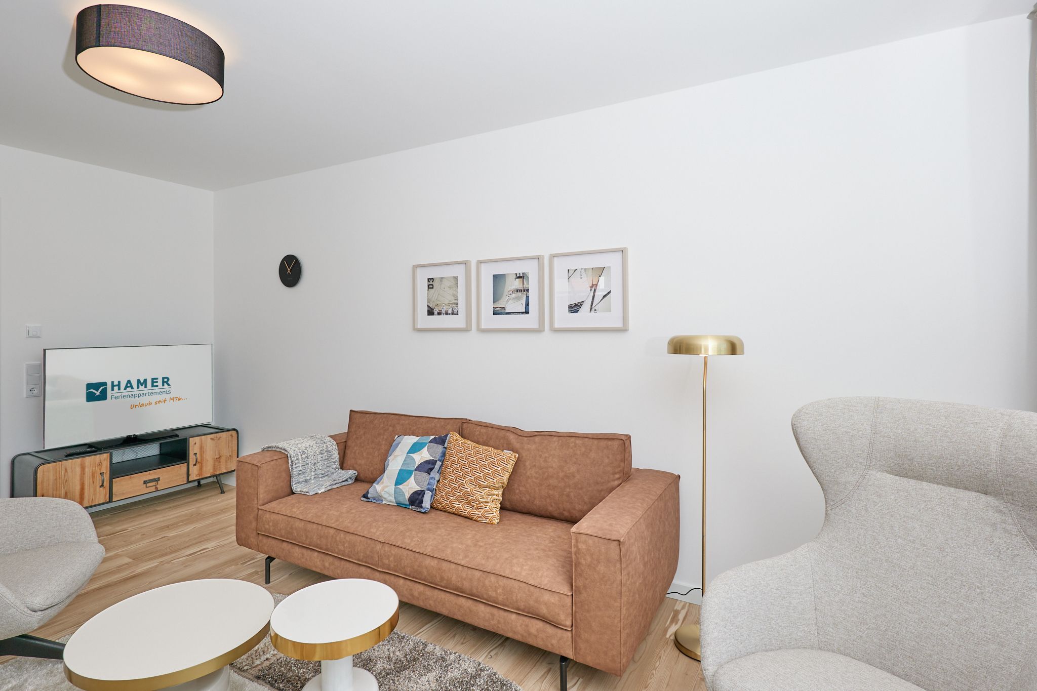 Neubau Mai 2023! Sehr schöne, moderne 3-Raum-Wohnung bis 4 Pers. voll ausgestattet auf ca. 67 m² in der 2.Etage gelegen, 2 Schlafzimmer (1x Doppelbett, 1x 2 Einzelbetten) und Außenjalousien an allen Fenstern, ebenerdige Dusche/WC, Wohnzimmer mit großer Küchenzeile (Backofen, Geschirrspüler, Mikrowelle), 2x Kabel-TV, Radio, kostenfreies W-LAN-Internet, großer Balkon mit Teilseesicht (nord/west), Personenaufzug, die Wohnung ist barrierefrei erreichbar, reservierter Pkw-Stellplatz in der Tiefgarage inkl., es sind keine Haustiere erlaubt und natürlich Nichtraucher. Durchfahrtshöhe Tiefgarage: 2,05m.