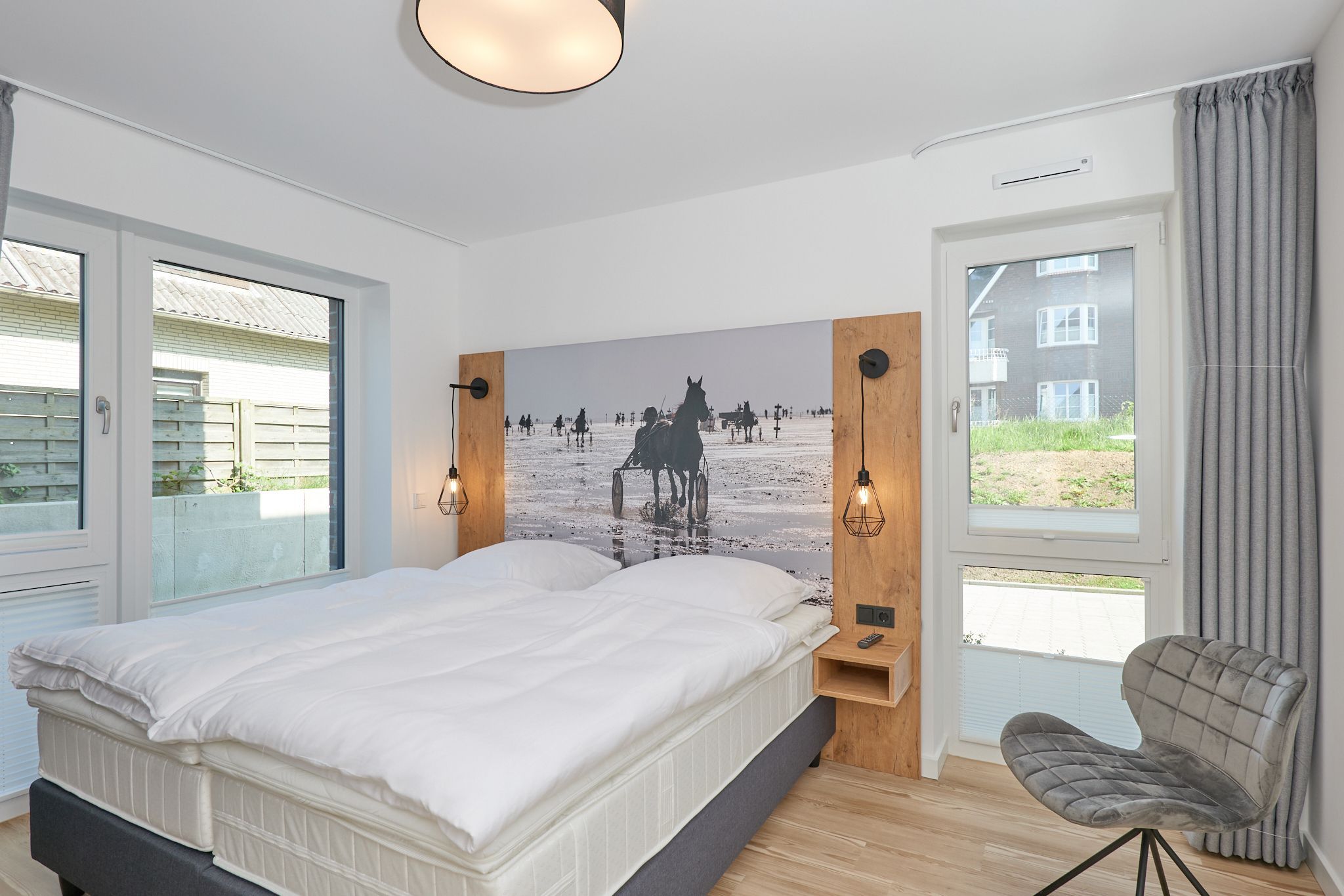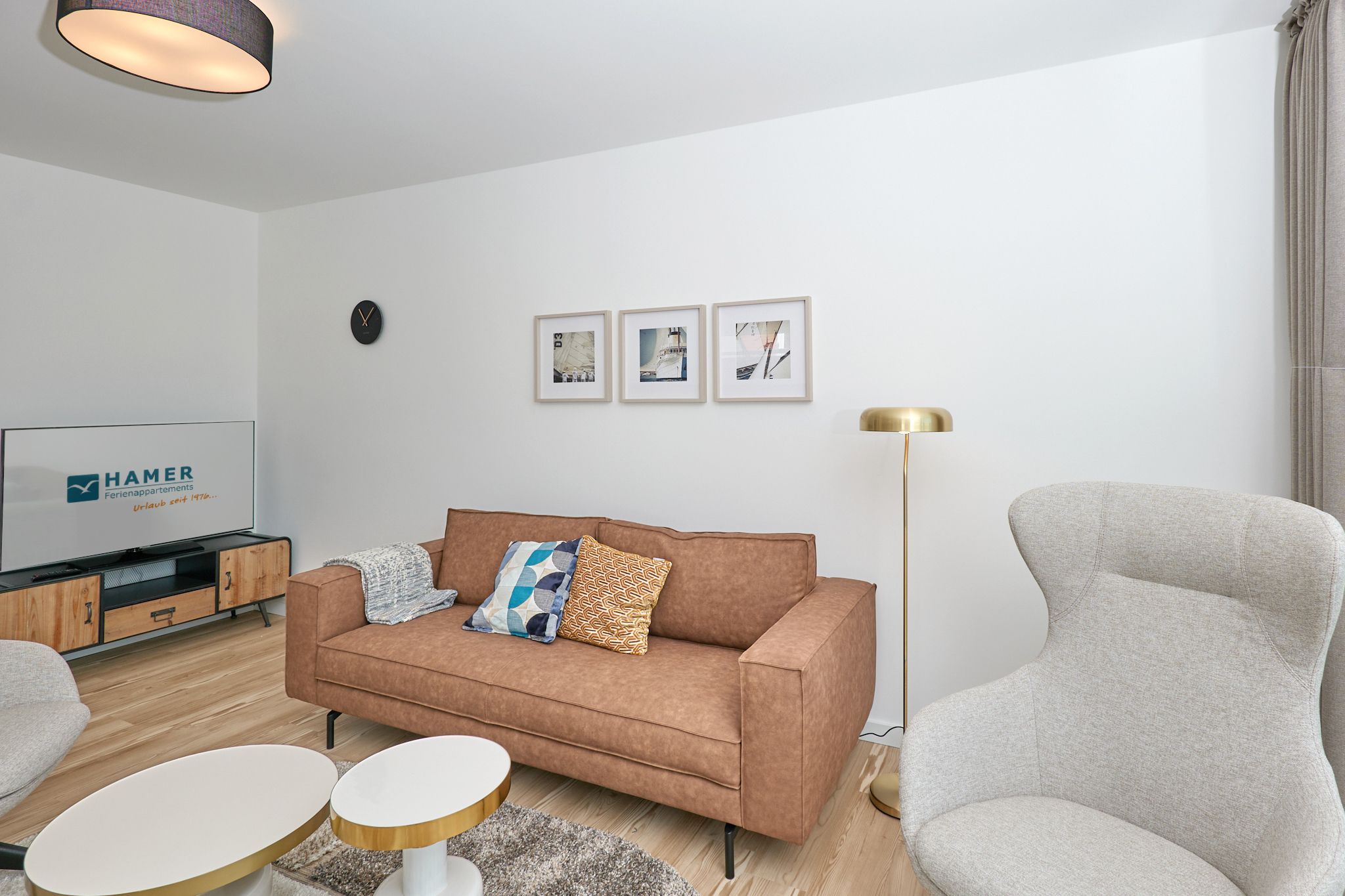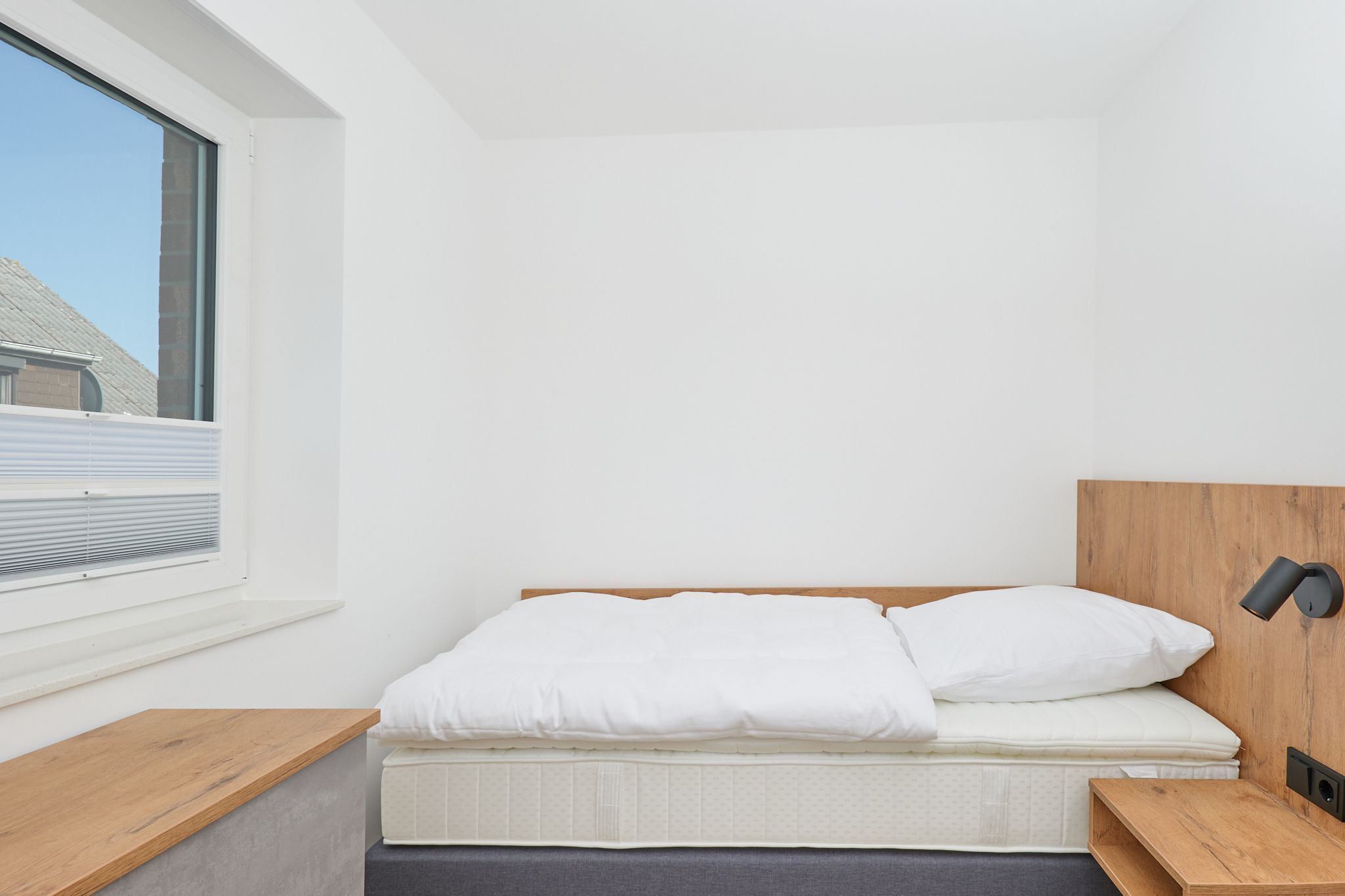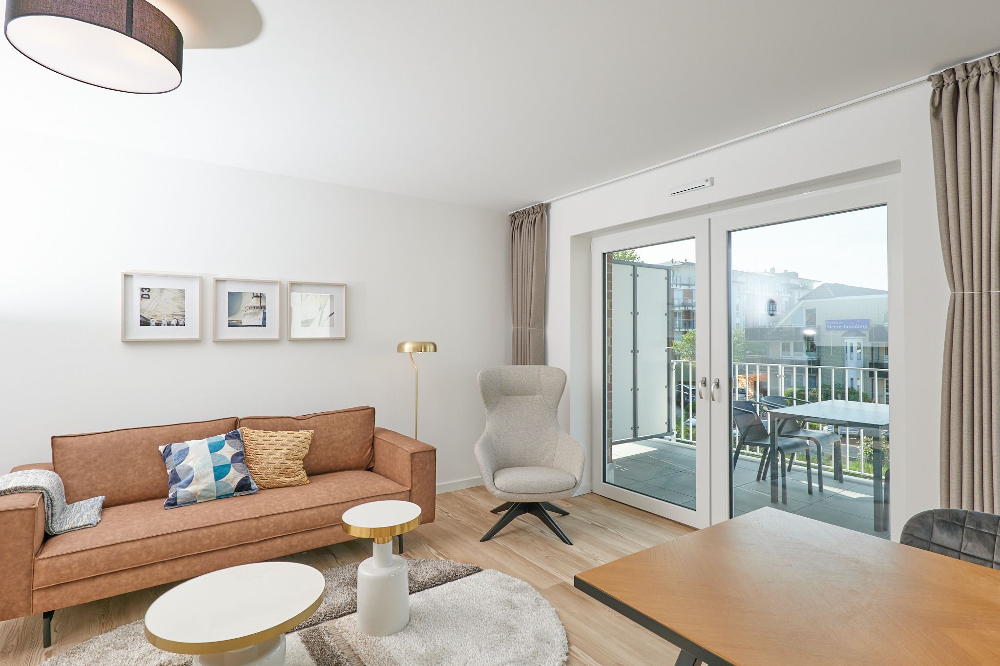 Neubau Mai 2023! Sehr schöne, moderne 3-Raum-Wohnung bis 4 Pers. voll ausgestattet auf ca. 67 m² in der 2.Etage gelegen, 2 Schlafzimmer (1x Doppelbett, 1x 2 Einzelbetten) und Außenjalousien an allen Fenstern, ebenerdige Dusche/WC, Wohnzimmer mit großer Küchenzeile (Backofen, Geschirrspüler, Mikrowelle), 2x Kabel-TV, Radio, kostenfreies W-LAN-Internet, großer Balkon mit Teilseesicht (nord/west), Personenaufzug, die Wohnung ist barrierefrei erreichbar, reservierter Pkw-Stellplatz in der Tiefgarage inkl., es sind keine Haustiere erlaubt und natürlich Nichtraucher. Durchfahrtshöhe Tiefgarage: 2,05m.