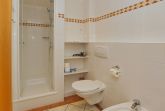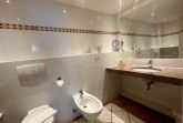 Modernes Bad mit Dusche, WC, Bidet, großem Waschtisch mit Spiegel, ausreichend Ablageflächen, Fußbodenheizung, Handtuchtrockner und Radio.