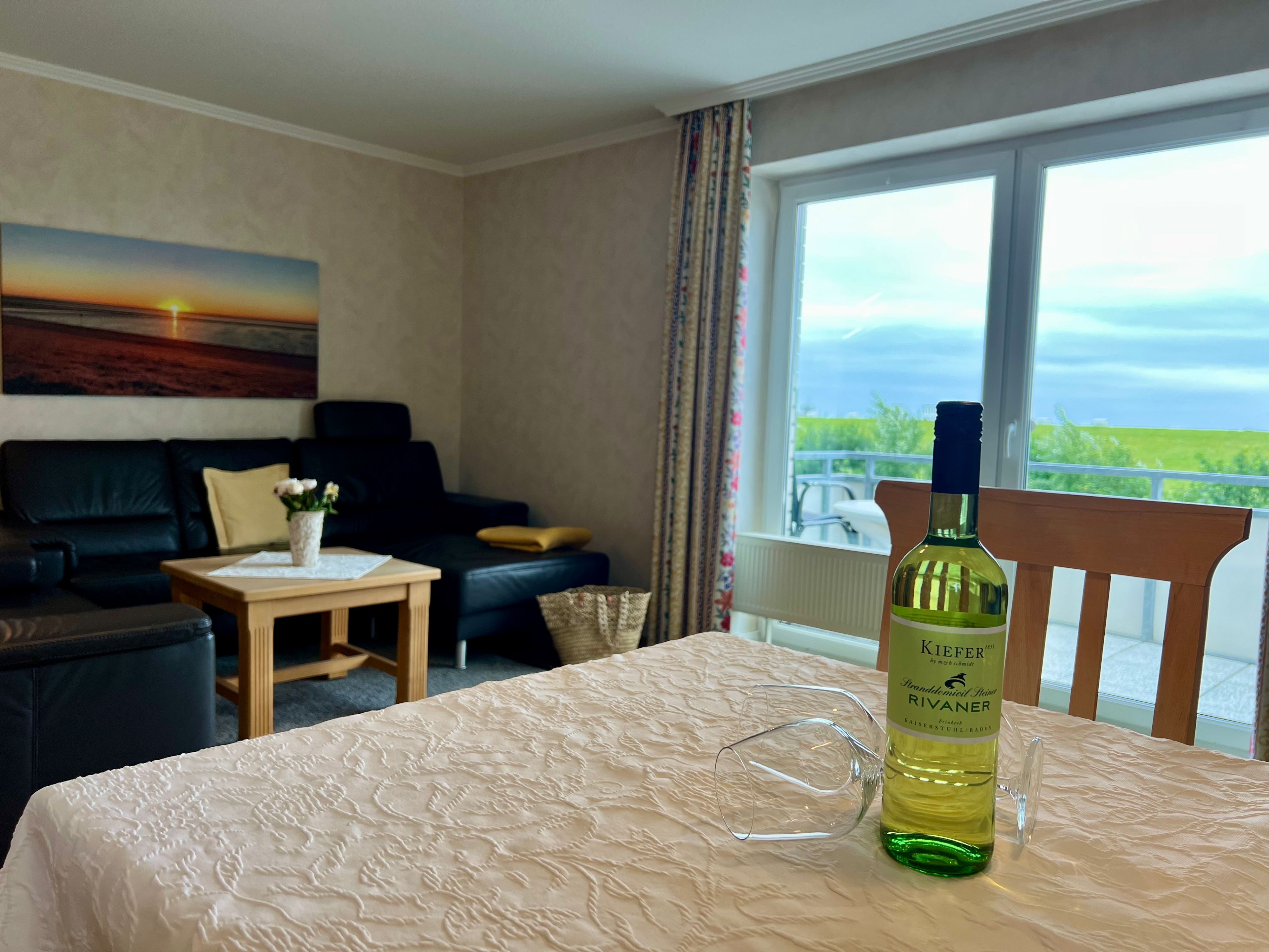 Appartement mit Blick über den Deich (bedingter Meerblick). Die beiden Schlafzimmer sind ruhig gelegen zur Rückseite des Hauses. Geräumiges Schlafzimmer mit Doppelbett, großem Kleiderschrank und einem Ganzkörperspiegel. 2. Schlafzimmer mit Einzelbetten und Kleiderschrank. Wohnzimmer mit hochwertiger Schlafcouch, Sitzgruppe, Fernseher, Stereoanlage, Eßplatz und Küchenzeile.