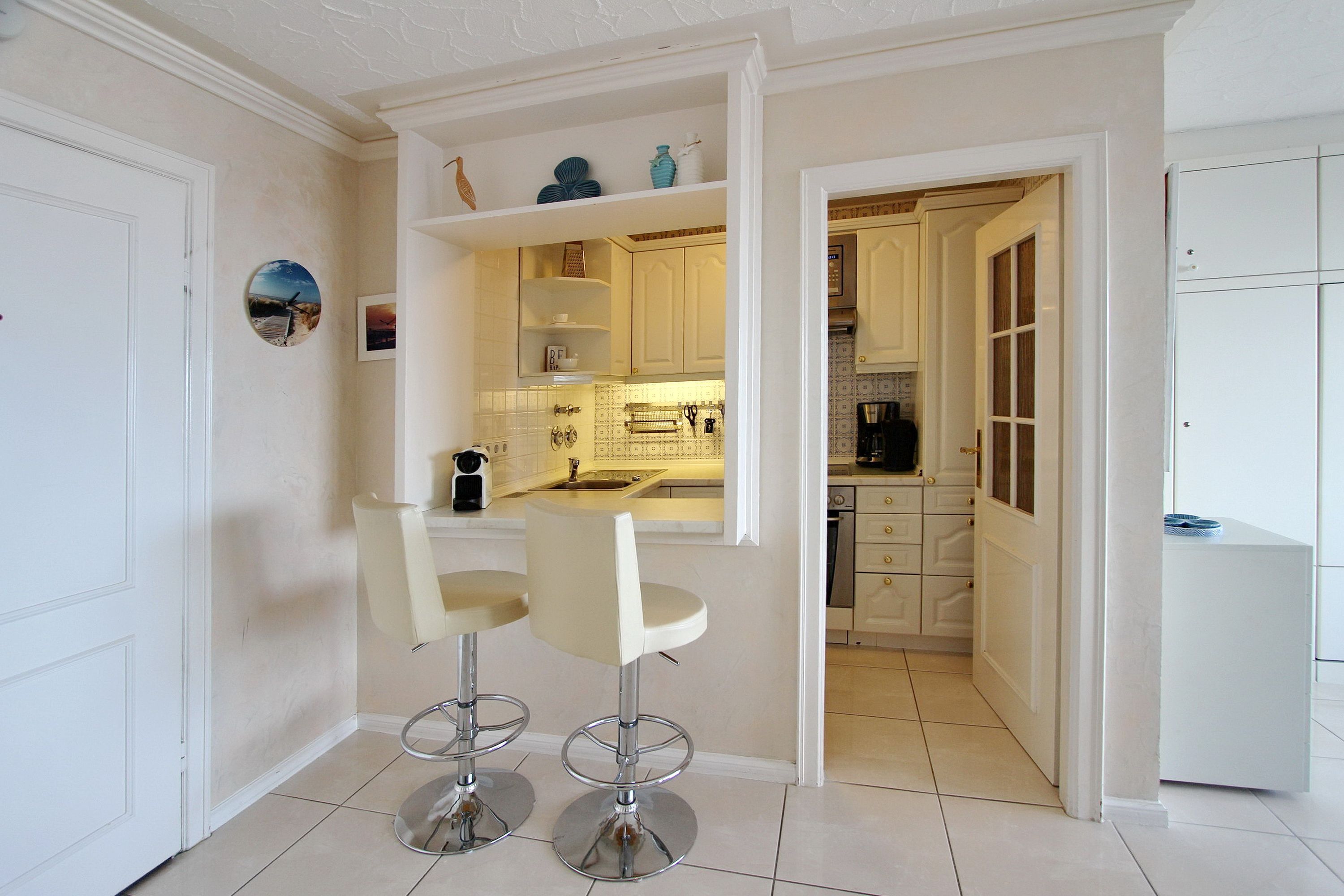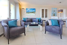Mit viel Liebe zum Detail eingerichtete 2 Zimmer Wohnung in der 9. Etage im Haus Metropol, mit einem herrlichen Weitblick über die Insel und die Stadt. Vom großen Ostbalkon, mit neuen Rattan Loungemöbeln, aus können sie bei gutem Wetter bis aufs Festland schauen. Das lichtdurchflutete Wohnzimmer hat eine bequeme Sitzgruppe, bestehend aus einem Sofa und 2 Sesseln, sowie einen Essplatz mit 4 Stühlen und ein Doppelschrankbett als weitere Schlafgelegenheit. Das separate Schlafzimmer, ausgestattet mit Doppelbett, modernem Smart TV und Kleiderschrank, hat einen eigenen Ostbalkon. Die offene Küche mit Backofen, Ceranfeld, Mikrowelle und zusätzlicher Nespressomaschine hat eine Durchreiche zum Wohnbereich, der auch als Esstresen genutzt werden kann. Das helle und moderne Badezimmer hat eine Badewanne und eine Dusche. Zur technischen Ausstattung der Wohnung gehören: zwei Flachbildfernseher, ein Blueray Player, eine Stereoanlage mit CD-Player, USB-Anschluß und Bluetooth und ein Radio. Ein freies WLAN Netzwerk (WEG Haus Metropol - Passwortfrei - ohne Gewähr) steht ihnen kostenfrei zur Verfügung. Diese Nichtraucherwohnung hat eine Größe von ca. 60 m².