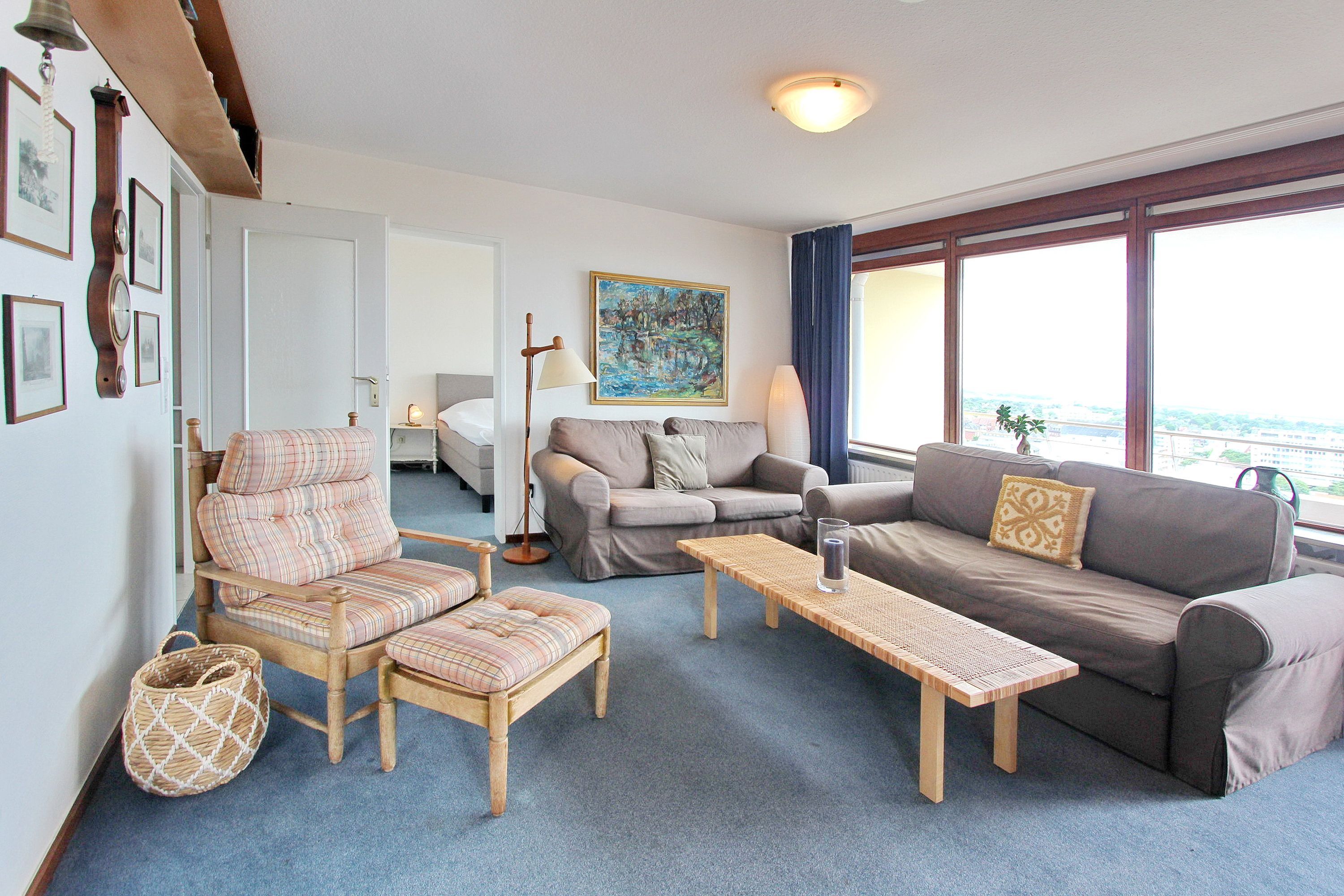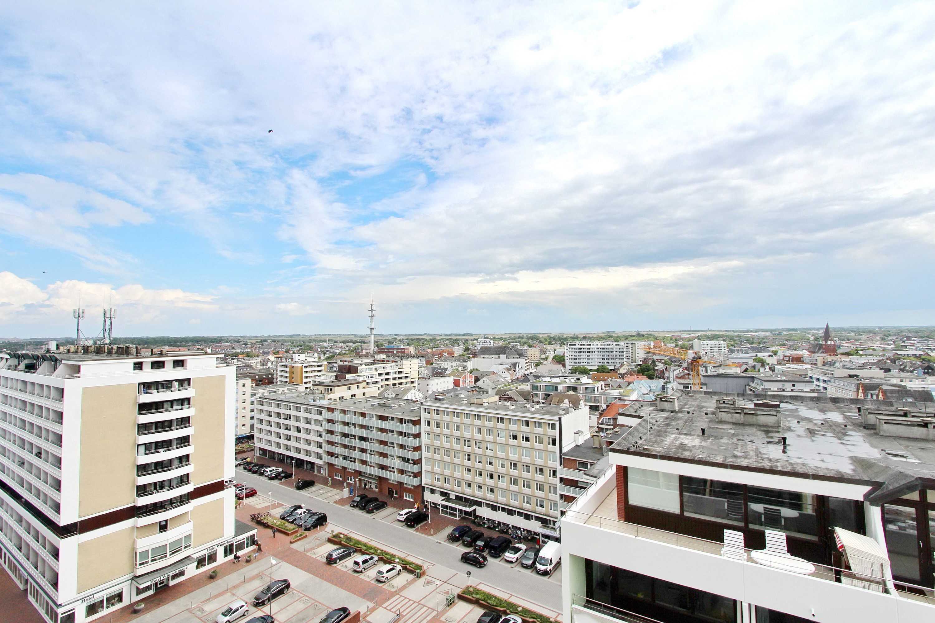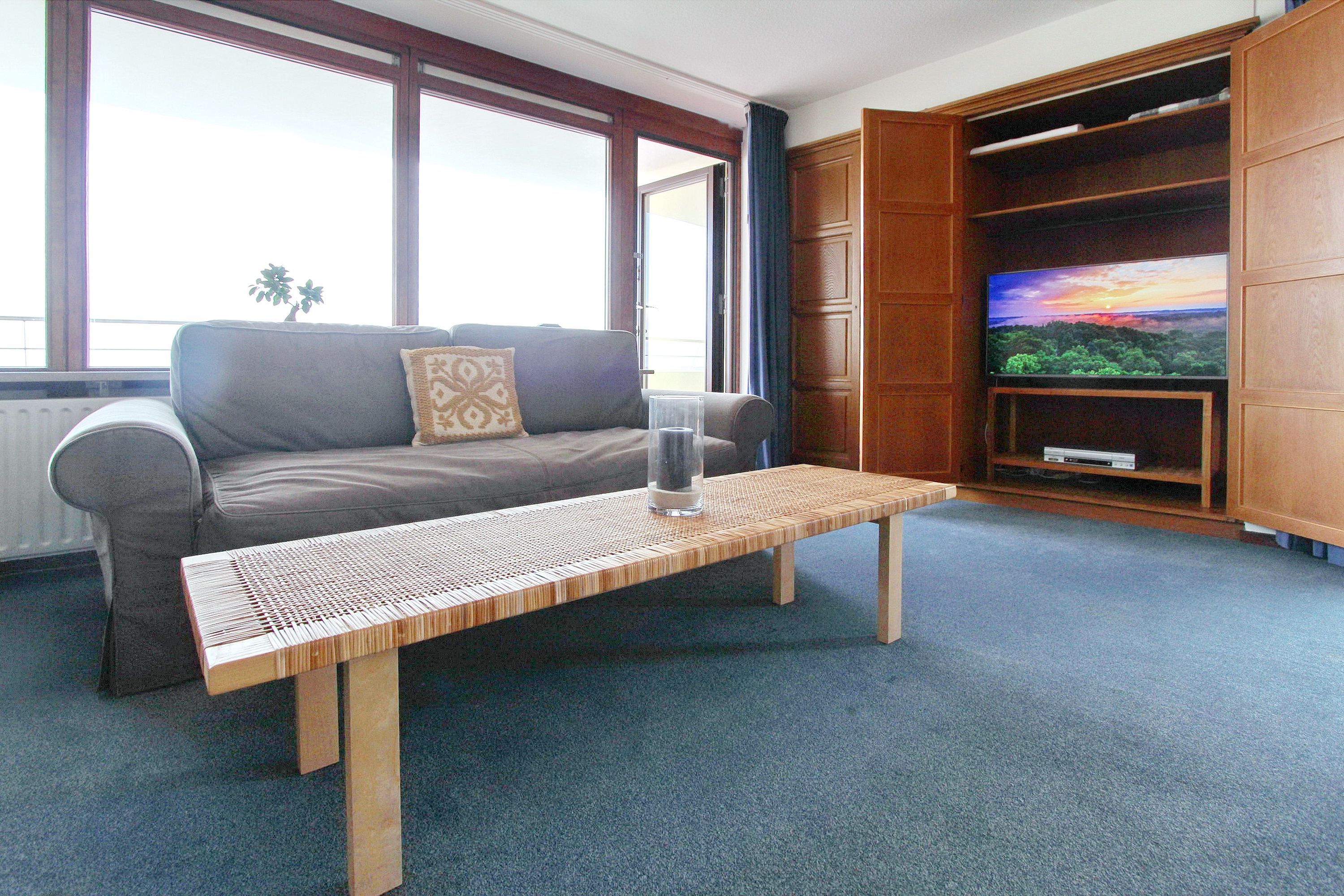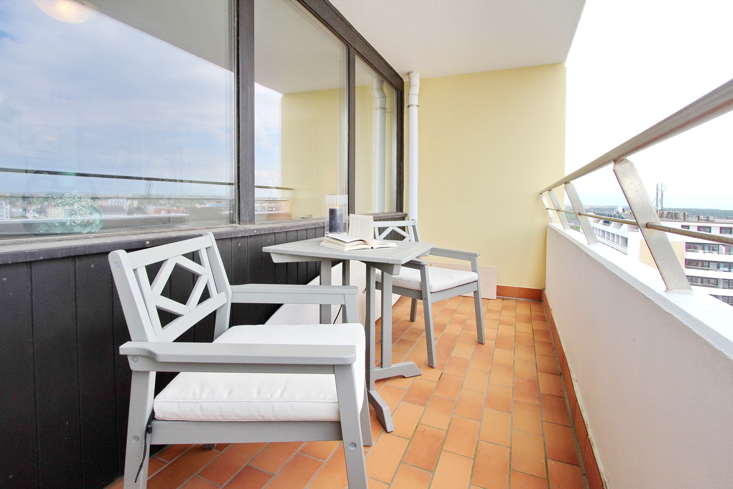 Großzügige Zweizimmerwohnung in der 10. Etage im Haus Metropol mit Blick über die Stadt und die Nordsee von einem vorgelagerten Süd- und Ostbalkon. Das Wohnzimmer hat 2 Couchen, wovon eine eine Schlafcouch für 2 Personen ist. Des weiteren gibt es einen Essplatz mit Sitzbank und 2 Stühlen. Das Schlafzimmer mit feststehendem Doppelbett hat einen eigenen Ostbalkon. Das moderne Badezimmer hat eine Dusche mit flachem Einstieg und viel Ablagefläche und Stauraum für Ihre persönlichen Dinge. In der separaten Küche gibt es einen Backofen und eine Durchreiche zum Essplatz. Zur technischen Ausstattung gehört: ein Flachbildfernseher, ein VHS Player und ein Radio. Ein freies WLAN Netzwerk (WEG Haus Metropol - Passwortfrei - ohne Gewähr) steht ihnen kostenfrei zur Verfügung. Haustiere nicht gestattet. Diese Nichtraucherwohnung hat eine Größe von ca. 74 m².