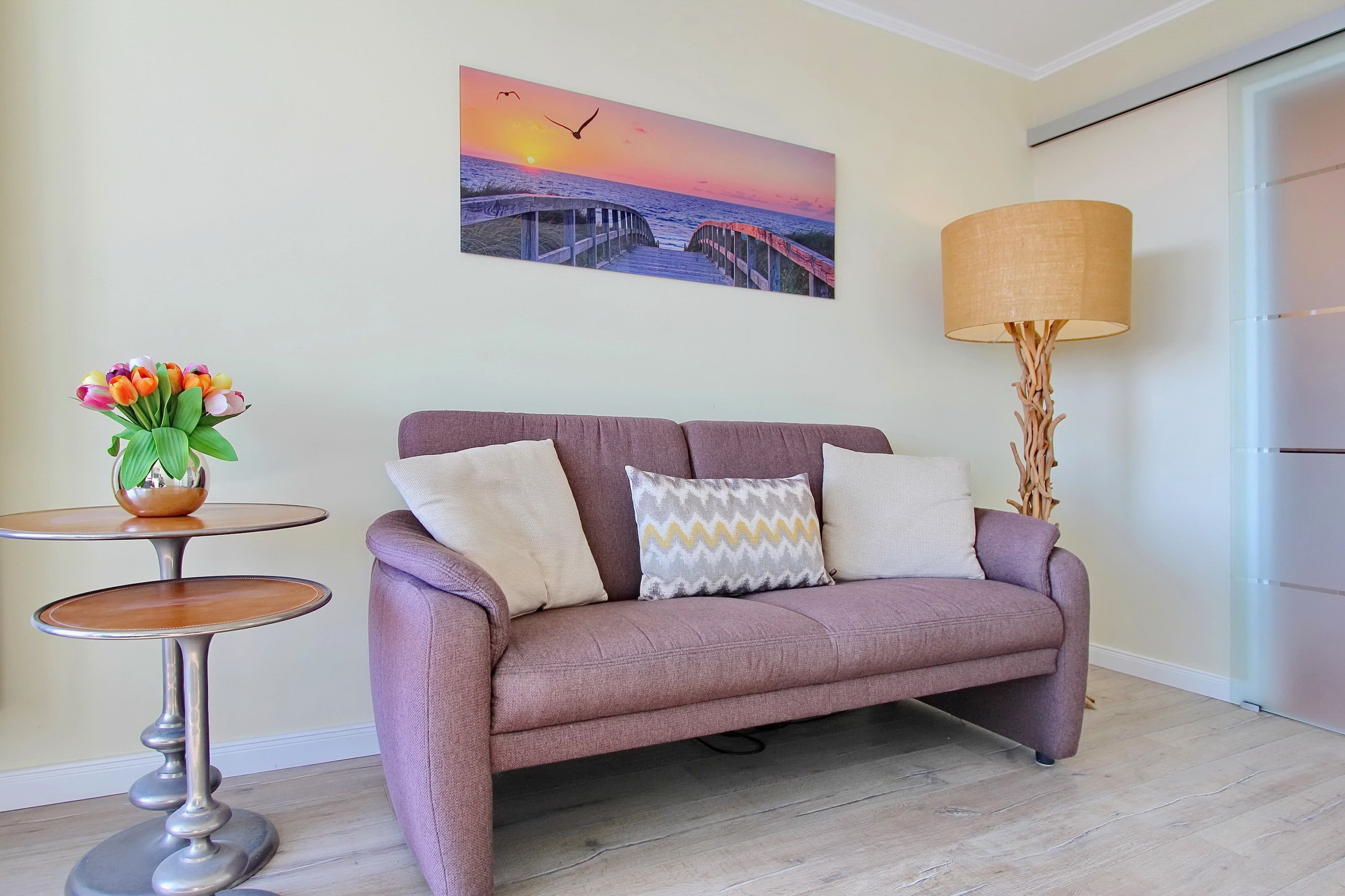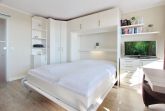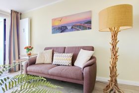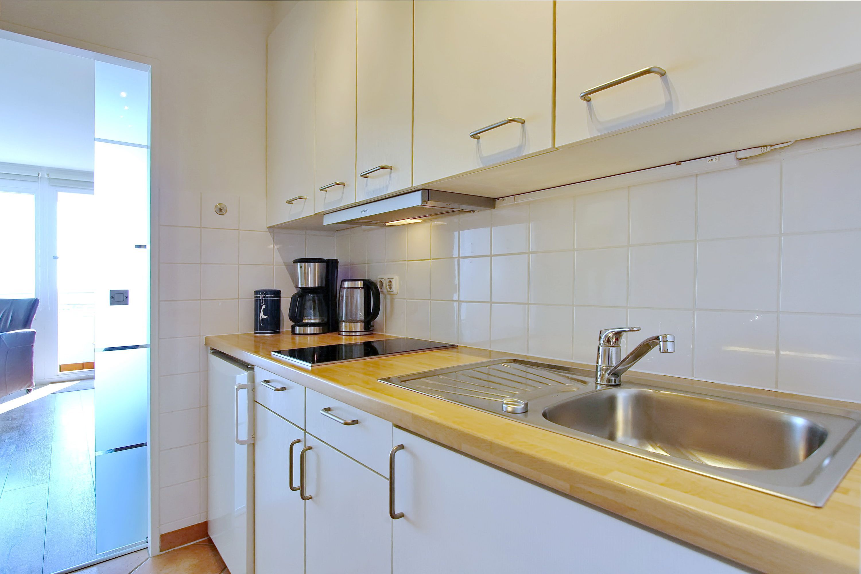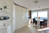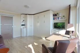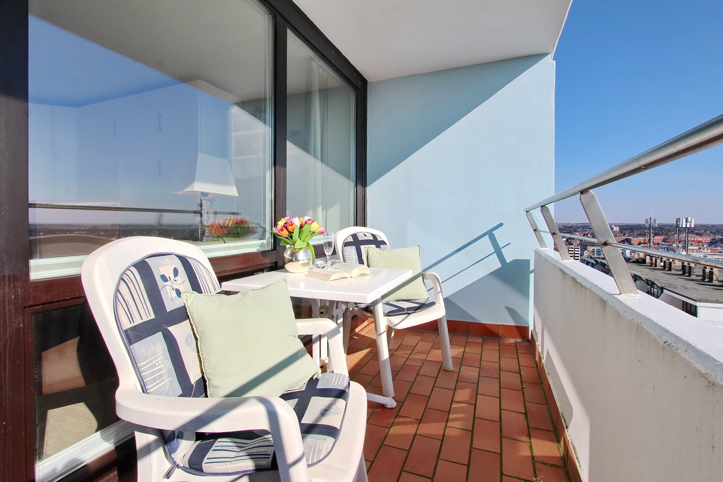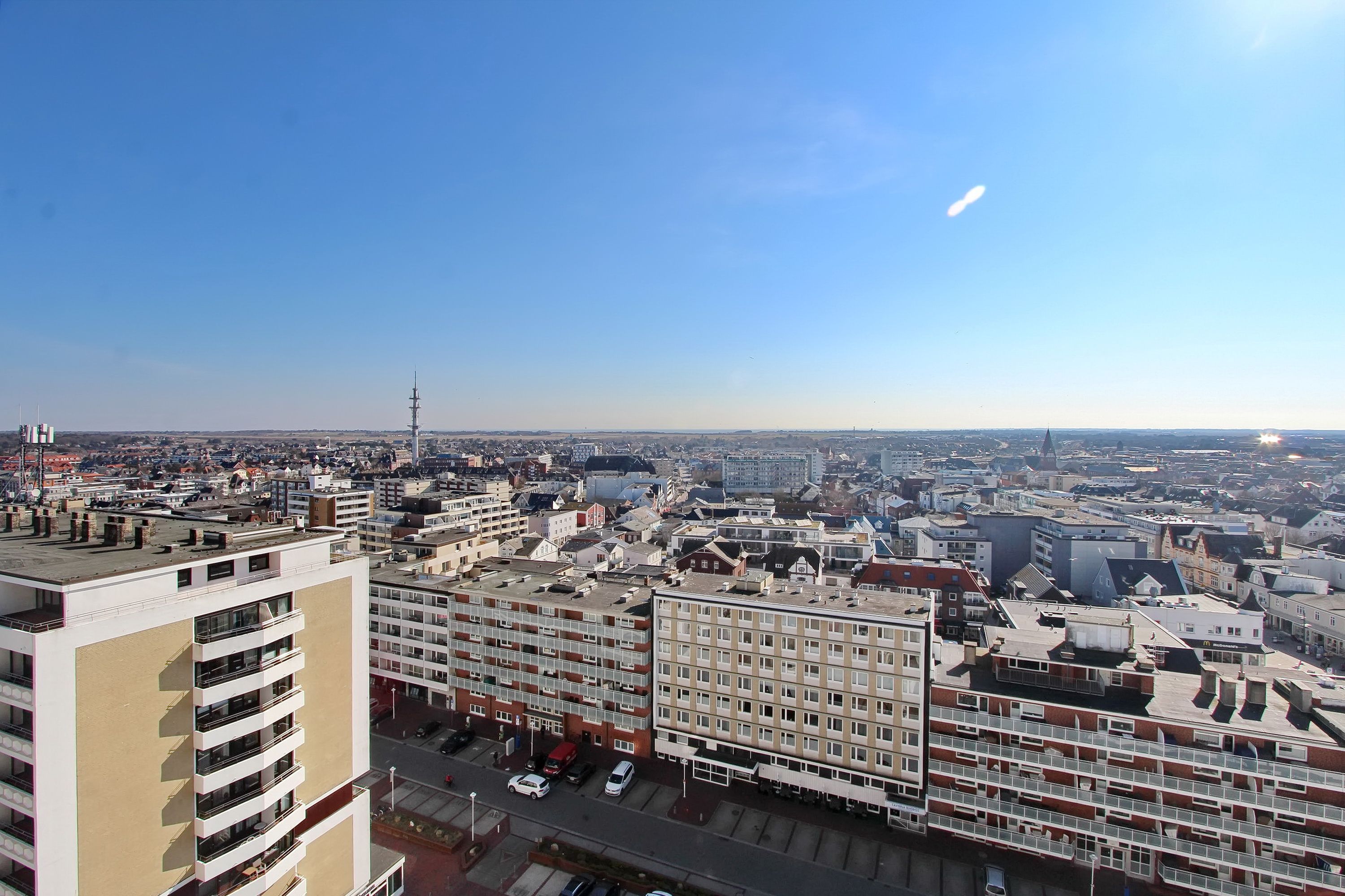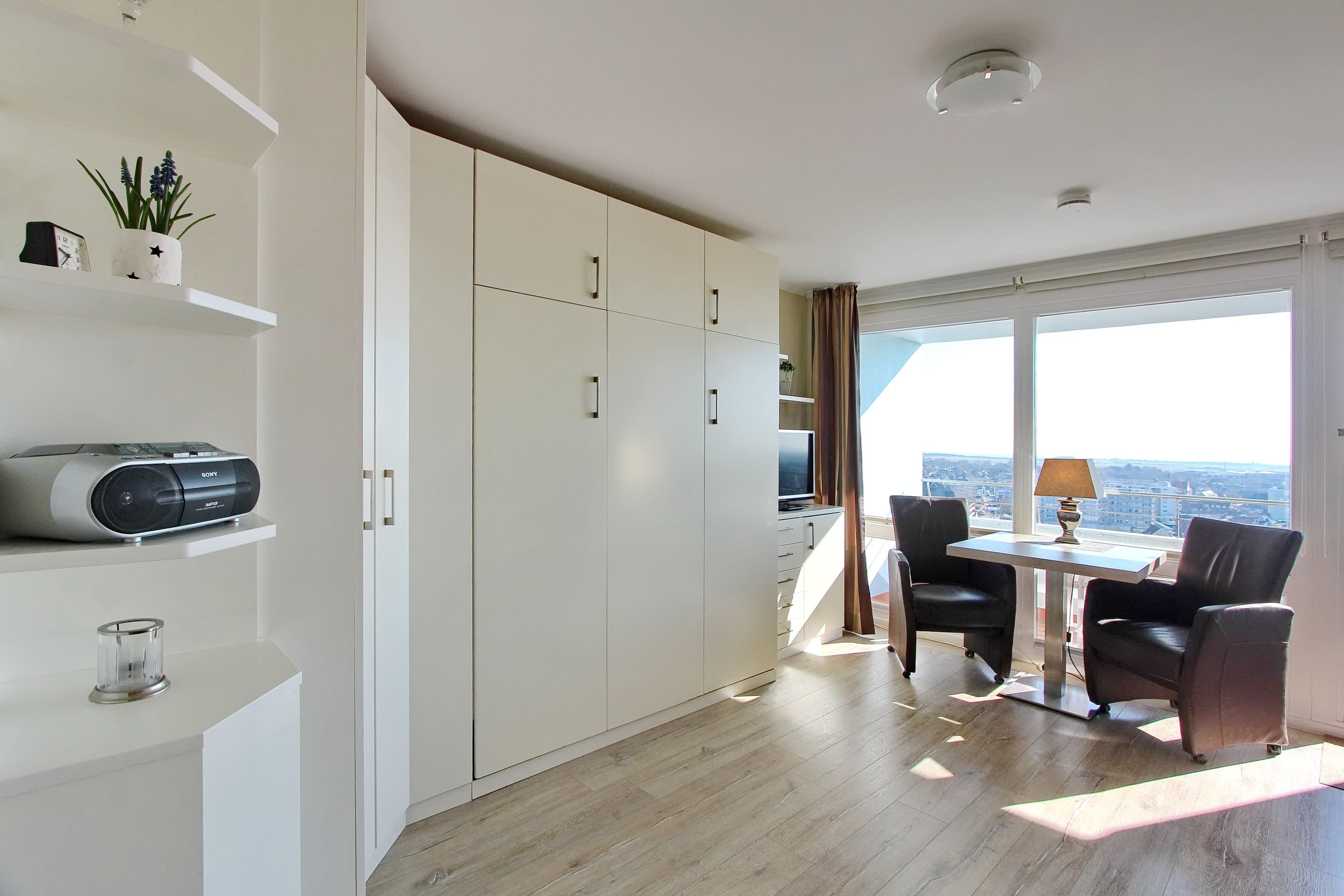 Im Haus Metropol in der 12. Etage befindet sich diese wunderschöne Einzimmerwohnung. Sie hat einen herrlichen Weitblick über die Insel und die Stadt und bei klarem Wetter können Sie bis zum nordfriesischen Wattenmeer und dem Festland schauen. Der Wohn-Schlafraum mit vorgelagertem Balkon zur Ostseite (inkl. Balkonmöbeln) hat bodentiefe Fenster und ist daher lichtdurchflutet. Direkt am Fenster steht der Essplatz mit 2 bequemen Sesseln und des weiteren gibt es eine Couch und eine Schrankwand mit einem Doppelschrankbett. Stauraum für Ihre persönlichen Dinge ist vorhanden. Das Badezimmer hat eine Dusche, Handtuchtrockner und einen Fön. Die Einbauküche mit 2 Cerankochplatten befindet sich im Flur. Zur technischen Ausstattung der Wohnung gehört ein Flachbildfernseher, ein DVD Player, sowie ein Stereo-CD-Radioplayer. Ein freies WLAN Netzwerk (WEG Haus Metropol - Passwortfrei - ohne Gewähr) steht ihnen kostenfrei zur Verfügung. Diese Nichtraucherwohnung hat eine Größe von ca. 30 m².