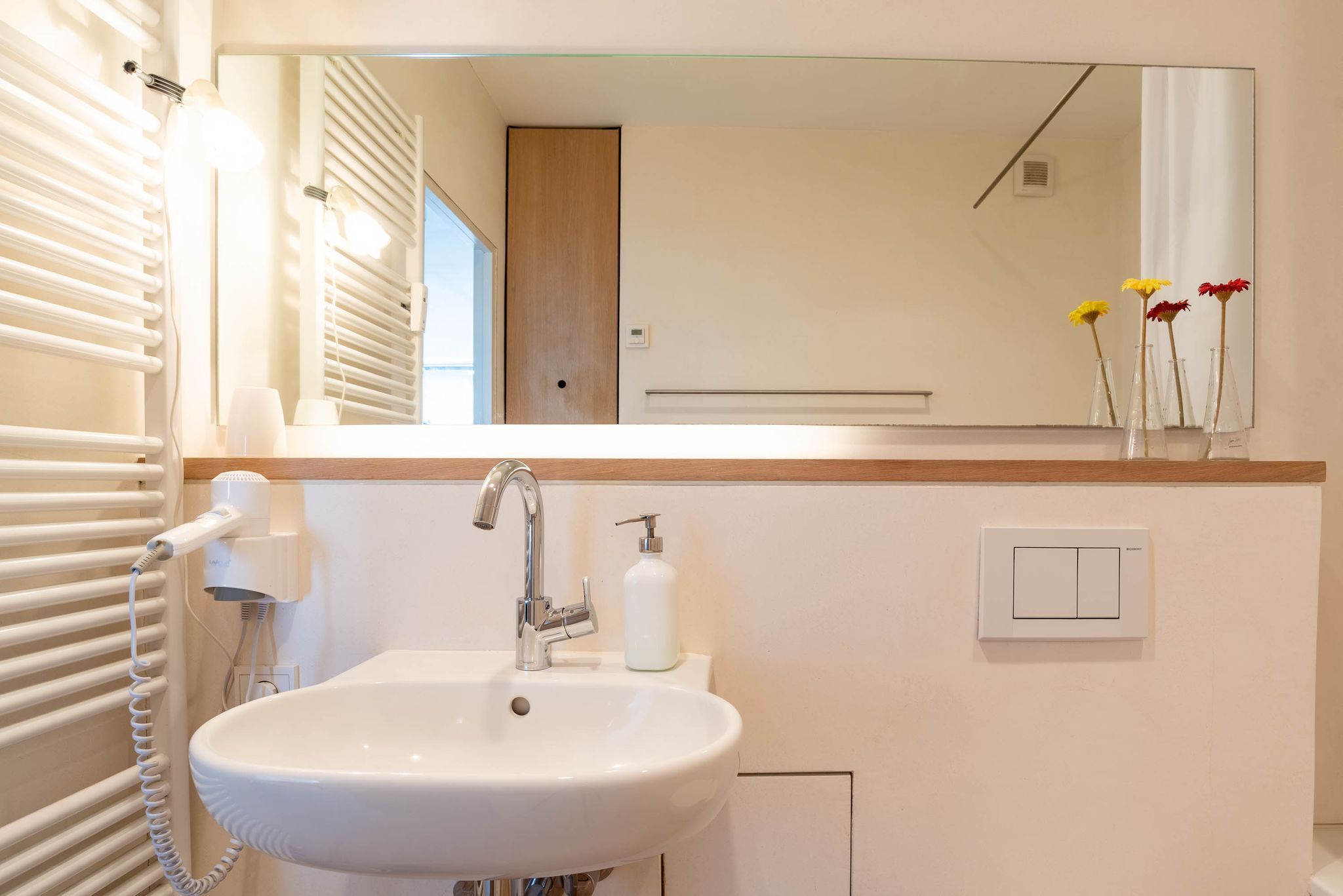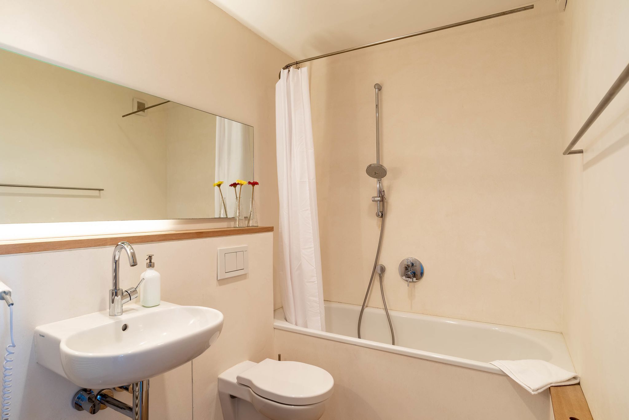 Die Wohnung ist mit einem Wannenbad ausgestattet. Im großen Wandschrank befindet sich ausreichend Platz für Ihre Kleidung. Zusätzlich ist hier eine Waschmaschine integriert.