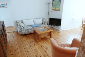 Die gemütliche Nichraucher-Wohnung im 1. Obergeschoss bietet Ihnen auf drei Zimmern - Wohnzimmer mit offener Küche, Schlafzimmer mit Doppelbett sowie Gästezimmer mit Schlafcouch - viel Platz für einen erholsamen Urlaub. Das Badezimmer ist mit einer Dusche ausgestattet. Der historische Charme der Wohnung zeigt sich in den originalen Holzdielen aus der Gründerzeit, kombiniert mit hochwertigen Massivholzmöbeln und stilvollen Rattan-Elementen. Die moderne Küchenzeile verfügt über Herd, Backofen, Spülmaschine, Kühlschrank und Mikrowelle - ideal für Selbstversorger. Zur weiteren Ausstattung gehören Fernseher, CD-Player und eine eigene Waschmaschine. Ein Parkplatz steht Ihnen direkt am Haus zur Verfügung. Auf Wunsch stellen wir Ihnen kostenfrei ein Kinderbett und einen Hochstuhl bereit. Bettwäsche und Handtücher können gegen Aufpreis hinzugebucht werden.