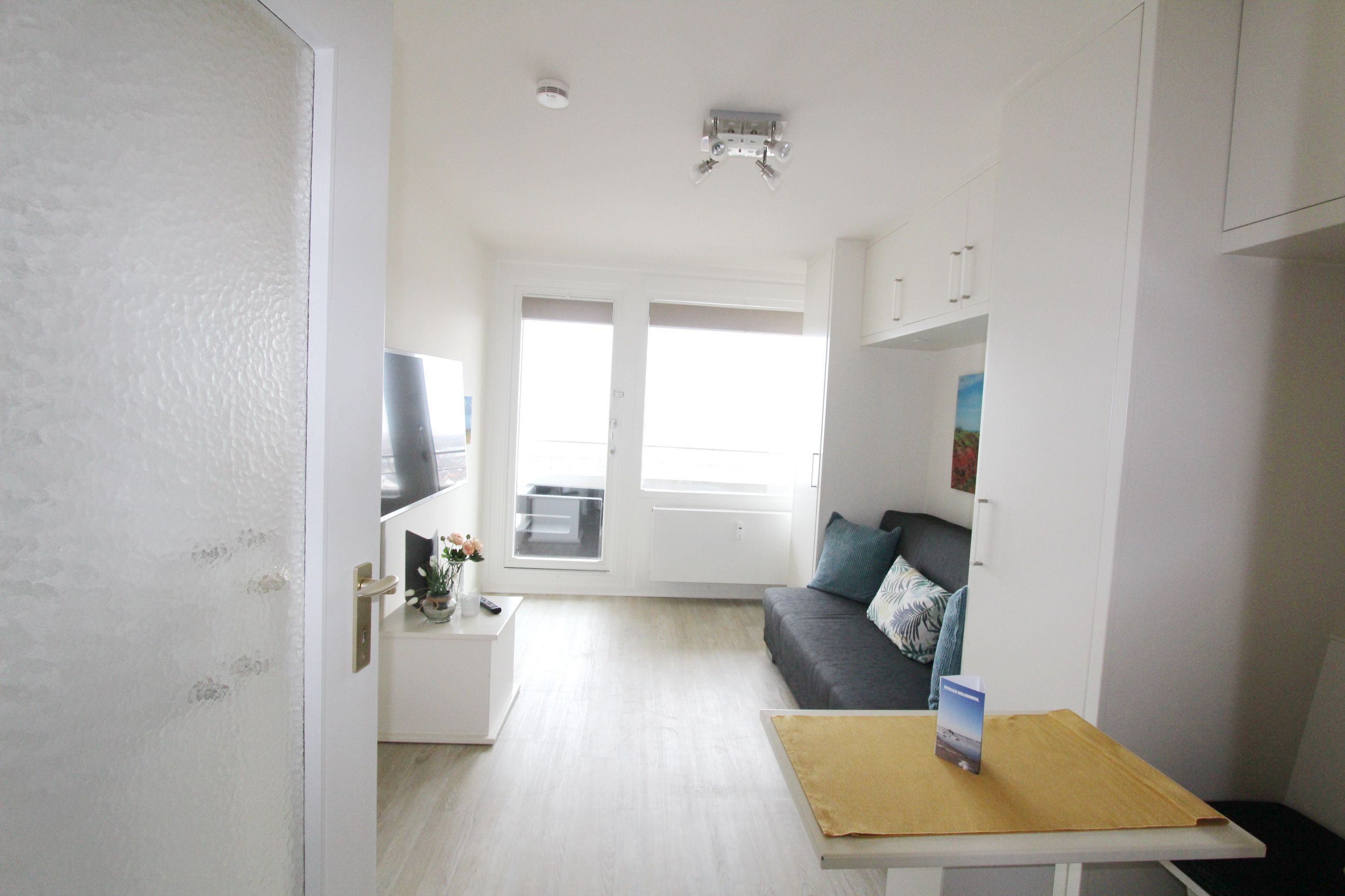 Hell und freundlich eingerichtete Einzimmerwohnung in der 13. Etage im Haus Metropol mit herrlichem Weitblick über die Insel und die Stadt Westerland. Bei klarem Wetter können sie sogar das nordfriesische Wattenmeer und das Festland sehen. Auf dem vorgelagerten Balkon zur Ostseite befinden sich 2 große Loungesessel . Der Wohn-Schlafbereich besticht durch eine klare Einrichtungslinie mit hochwertigen Tischlerarbeiten. Es gibt eine Schlafcouch, einen Couchtisch, ausreichend Stauraum in 2 Wandschränken, sowie eine Eckbank mit Tisch. Der Designfussboden in Holzoptik verleiht dem Raum Wärme und Gemütlichkeit. Das Badezimmer verfügt über eine Dusche. Im Flur gibt es eine kleine Einbauküche mit Mikrowelle und 2 Herdplatten. Zur technischen Ausstattung dieser Nichtraucherwohnung gehört ein großer Flachbildfernseher und das freie WLAN Netzwerk (WEG Haus Metropol - Passwortfrei - ohne Gewähr) steht ihnen kostenfrei zur Verfügung. Wohnungsgröße: ca. 23 m².
