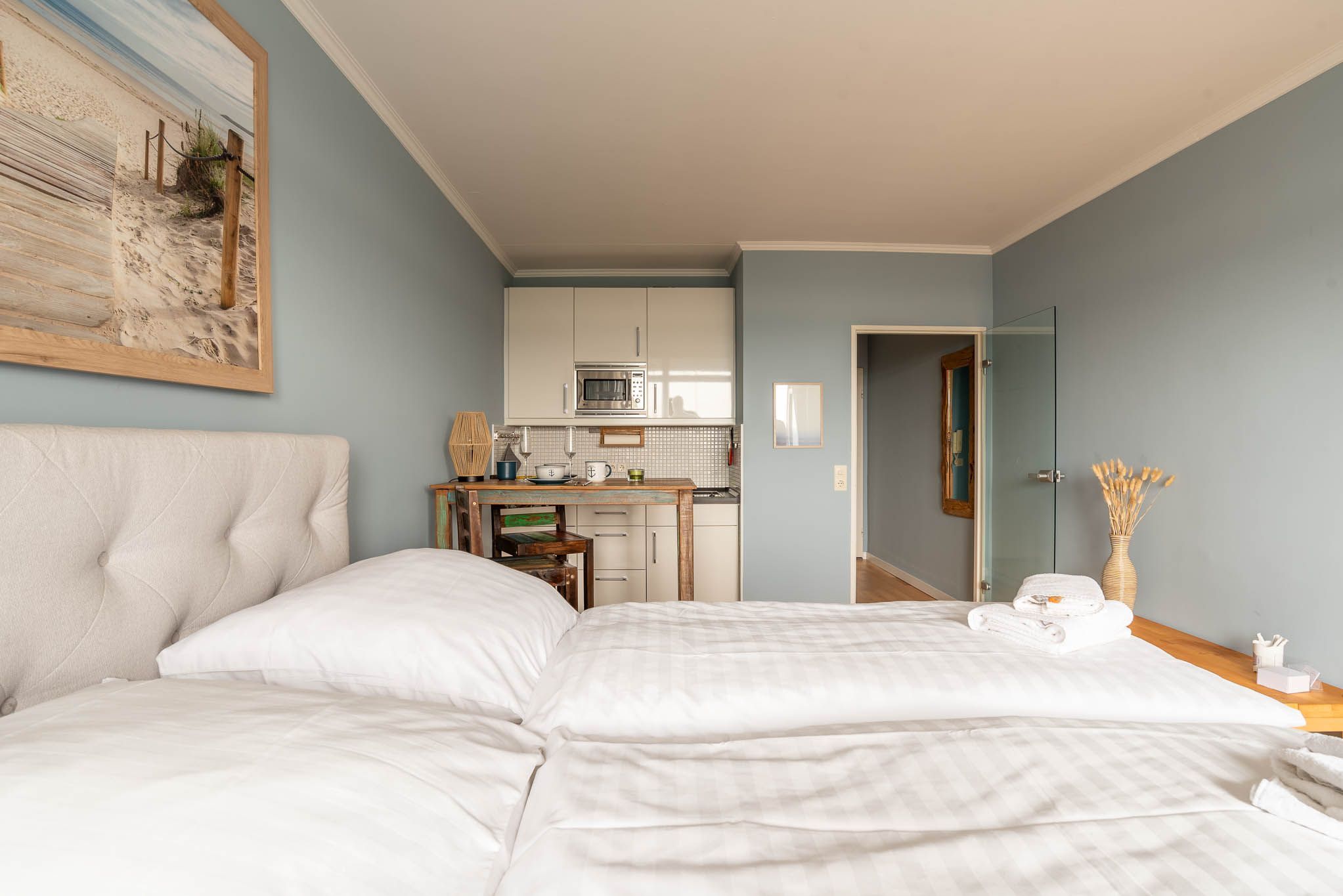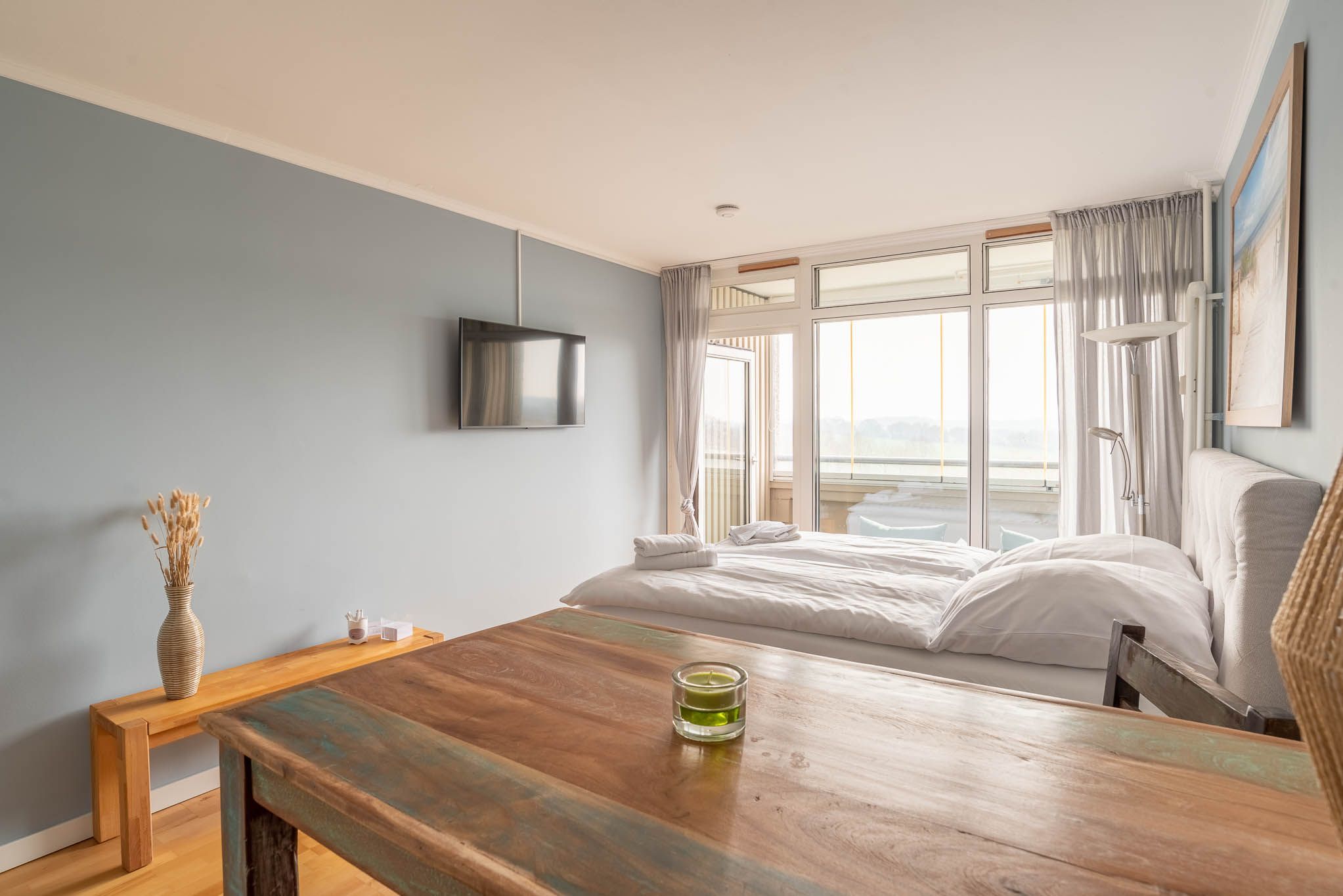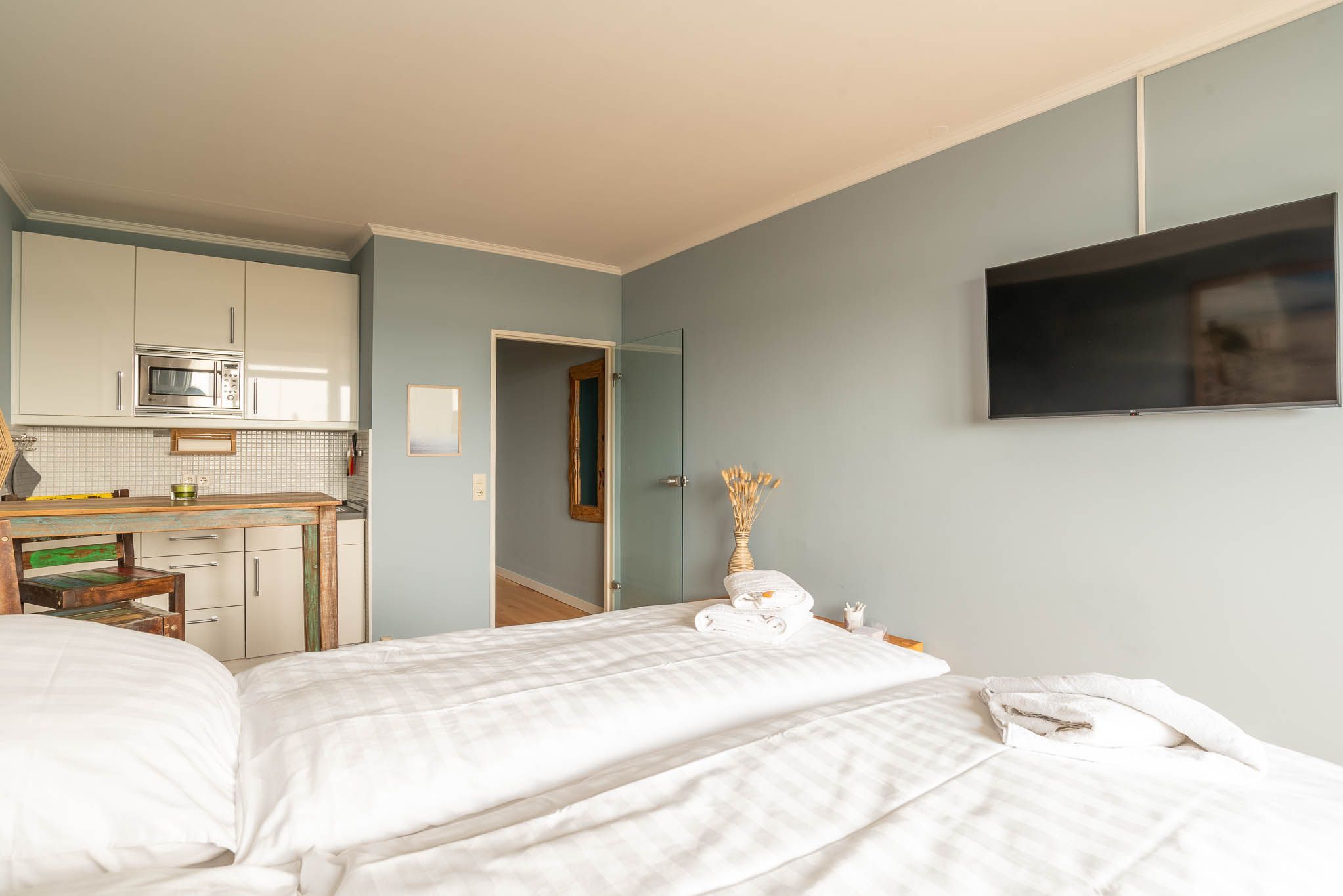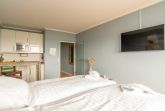 Im freundlichen Appartement befindet sich ein bequemes Boxspringbett (Liegefläche von 160x200 cm). An der Wand gegenüber ist ein LCD- Fernseher angebracht.