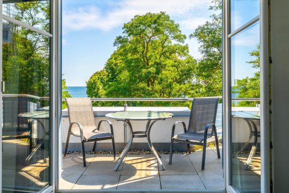 Vom Wohn-/ Schlaf-/Essbereich aus gelangen Sie direkt auf den großzügigen Eck-Balkon (Nordost + Nordwest) mit Gartenmöbeln. Hier können Sie die Sonne, die Meeresluft und den tollen Ausblick genießen.