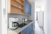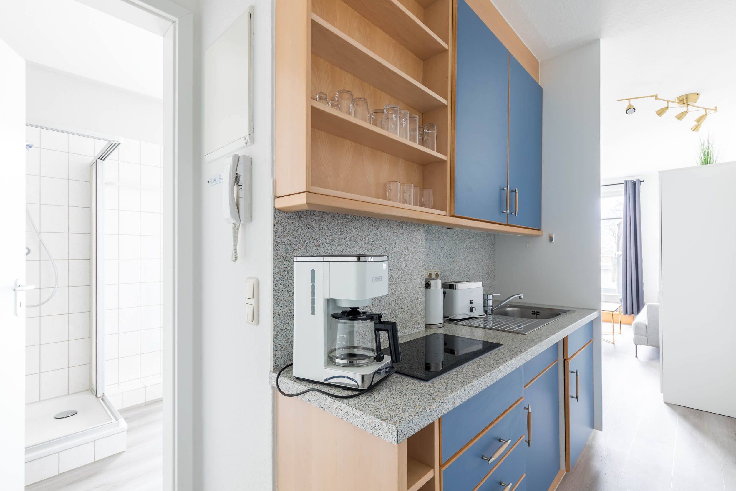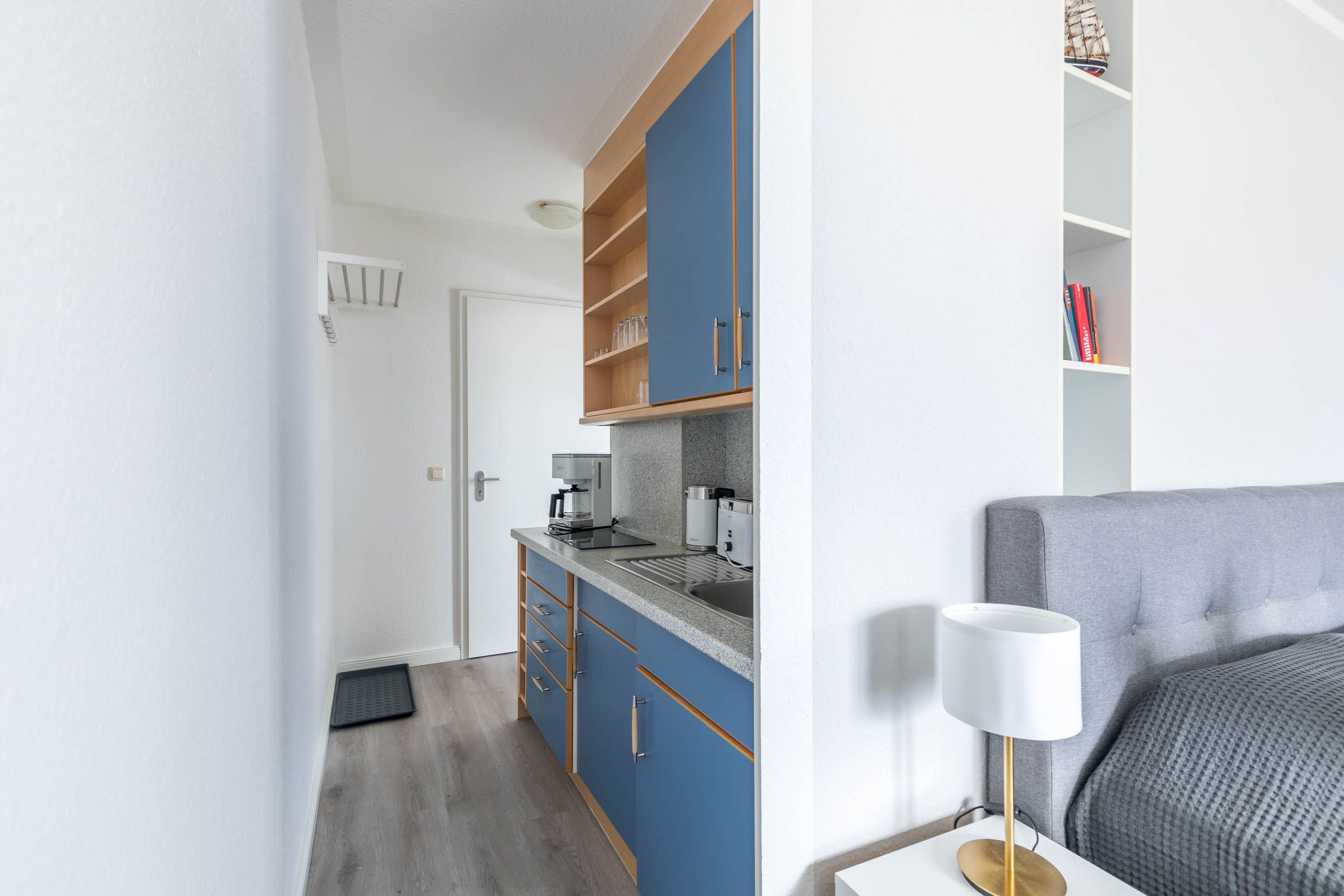 Im Eingangsbereich werden Sie von einer offenen Küchenzeile empfangen. Hier finden Sie neben dem Cerankochfeld, einen Kühlschrank, einen Toaster, einen Wasserkocher und eine Kaffeemaschine.