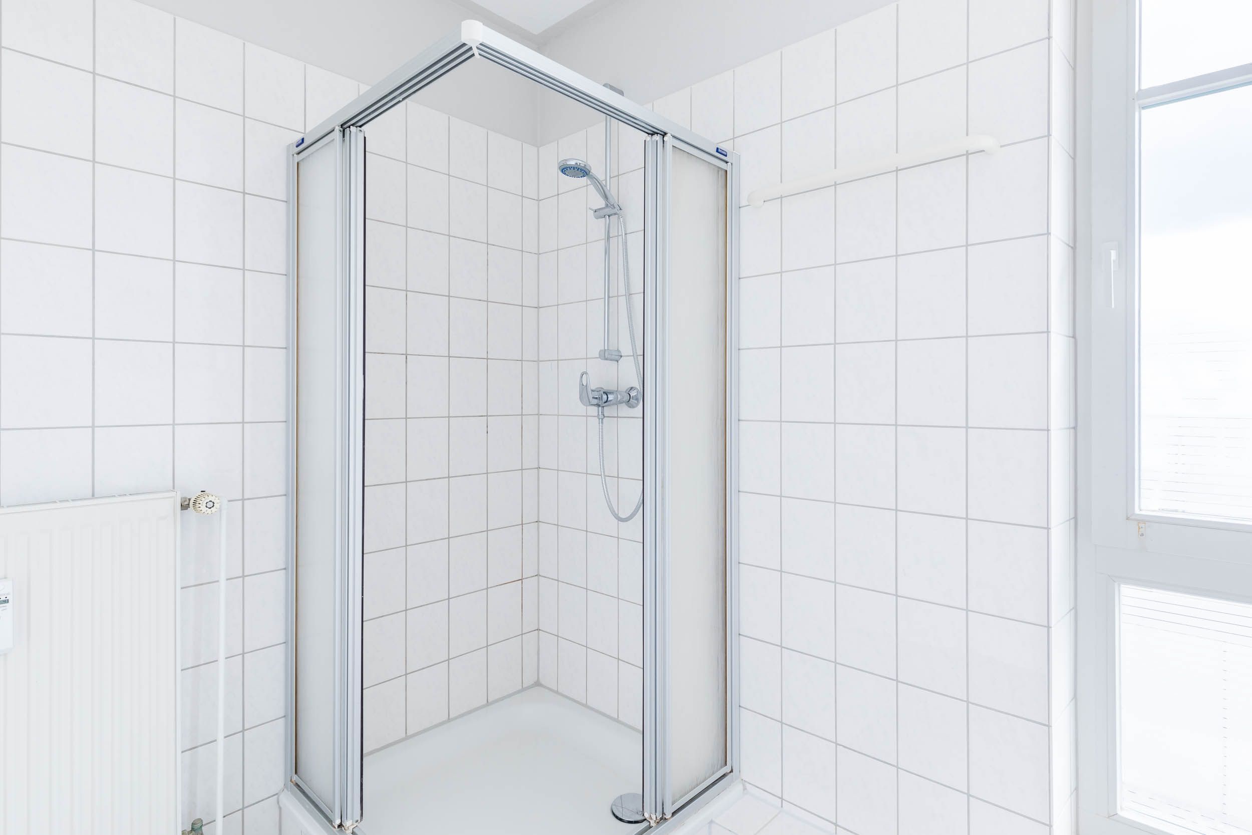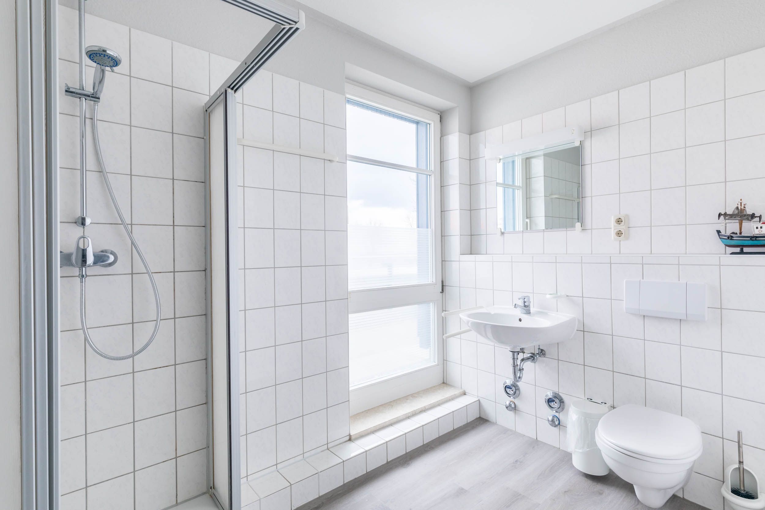 Das geflieste Bad bietet eine Dusche und WC, ebenfalls mit Fenster mit Ostseeblick.