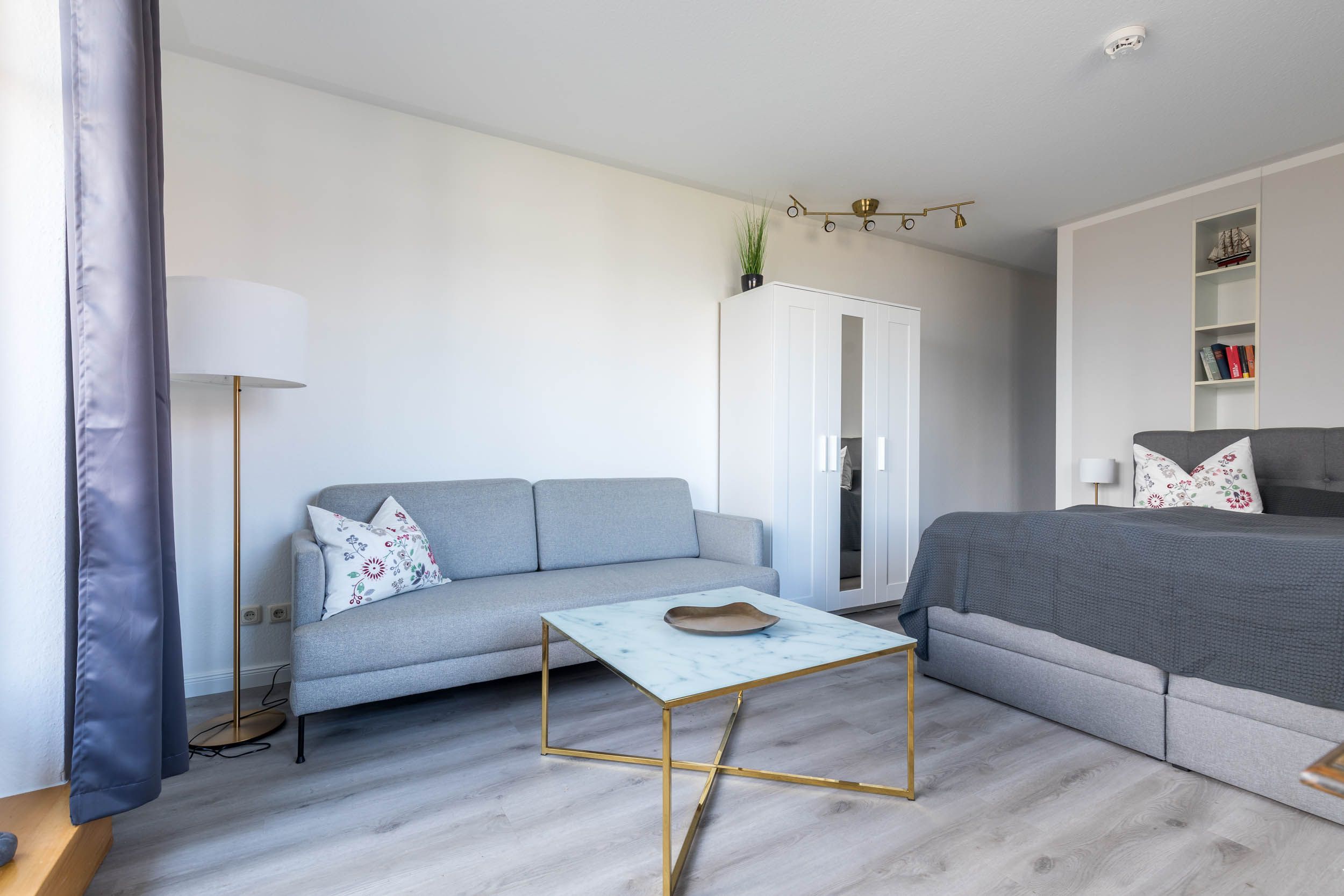 Der kombinierte Schlaf- und Wohnbereich ist praktisch und gemütlich eingerichtet: Der Schlafbereich ist mit einem bequemen Boxspringbett (180x200m) und einem Kleiderschrank für Ihre Urlaubsgarderobe ausgestattet. Die bequeme Couch und ein Flatscreen-TV sorgen für einen entspannten Filmeabend.