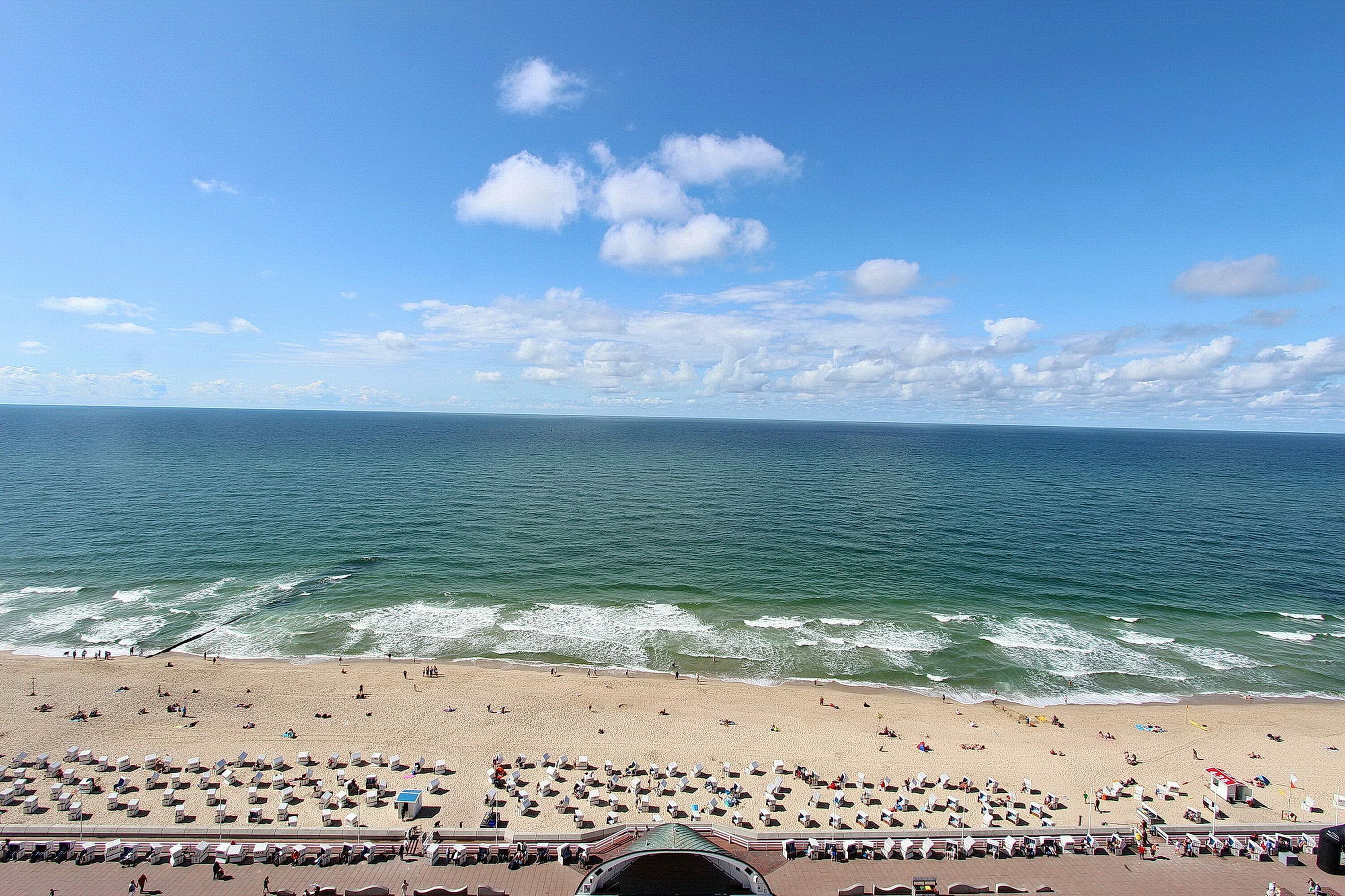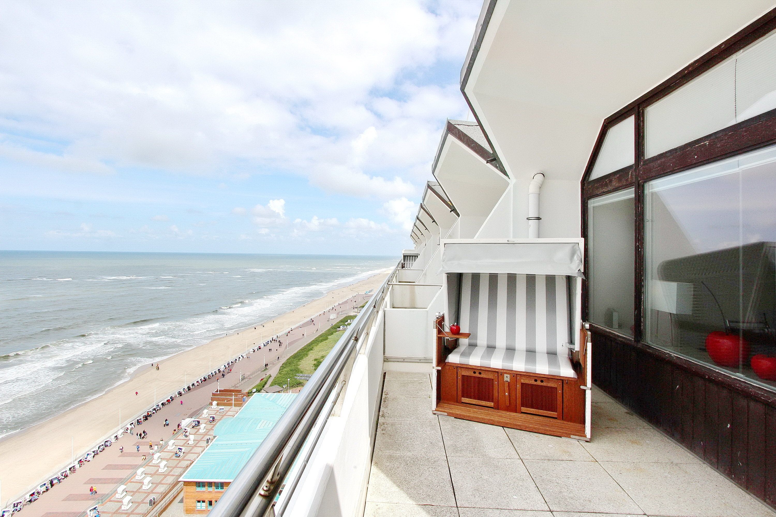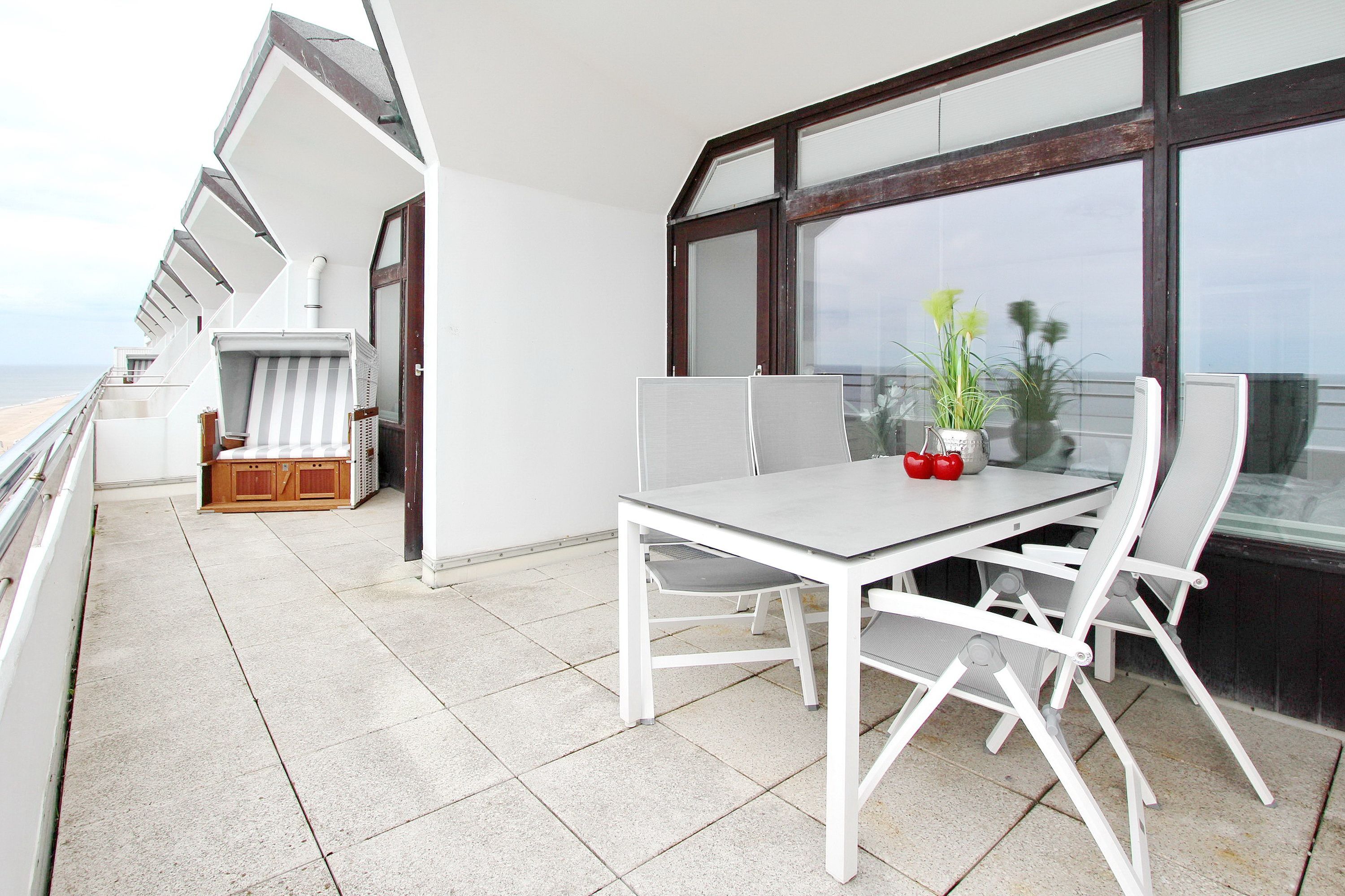 Exklusive 2-Zimmer-Wohnung in der 14. Etage des Haus Metropol mit einer großen vorgelagerten Dachterrasse von der man einen traumhaften Blick auf die Nordsee genießen kann. Der Wohnraum ist mit einer gemütlichen Couchgarnitur mit Schlaffunktion, einem Sessel, einem Smart-TV, einem Radio und einem Essplatz mit 4 Stühlen am Fenster ausgestattet. Im Schlafzimmer, welches über einen direkten Zugang zum Badezimmer mit Dusche und Badewanne verfügt, findet man ein feststehendes Doppelbett, einen großen Kleiderschrank und einen zusätzlichen Smart-TV vor. Zusätzlich gehört zur Wohnung ein separates Gäste-WC. Die neue offene moderne Küche ist mit einem 4 Platten-Cerankochfeld, Backofen, Kühlschrank mit Gefrierfach und einer Geschirrspülmaschine ausgestattet. Nichtraucherwohnung. Der Eigentümer verfügt über einen eigenen Internetanschluss (Zugangsdaten in der Wohnung) der kostenfrei zu nutzen ist. Der Aufzug im Haus Metropol geht nur bis zur 13. Etage - die 14. Etage (Penthouse) ist dann über eine Treppe erreichbar. Wohnungsgröße ca. 67 m².