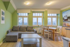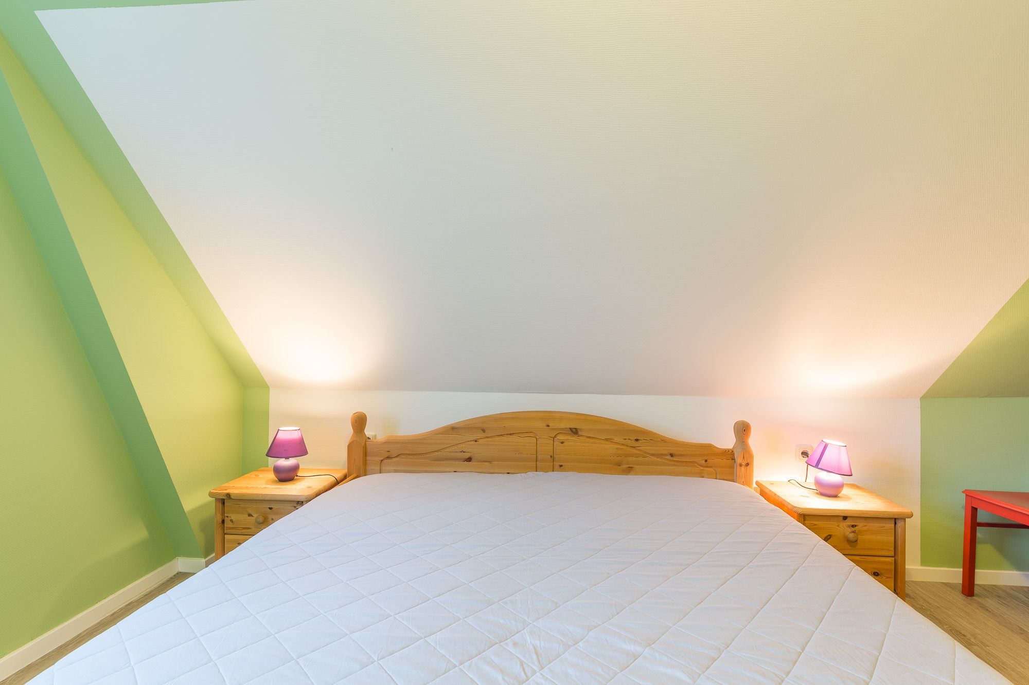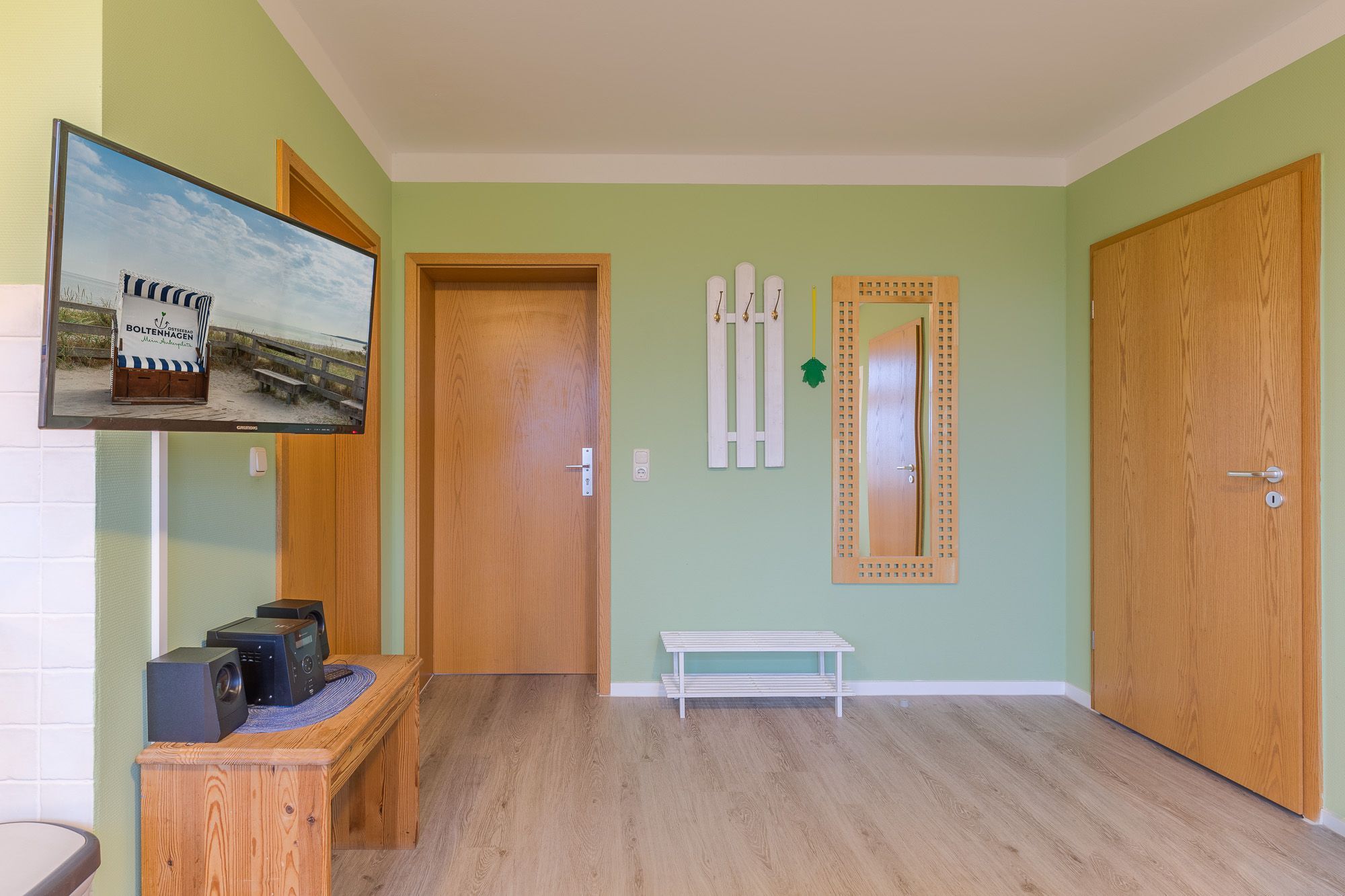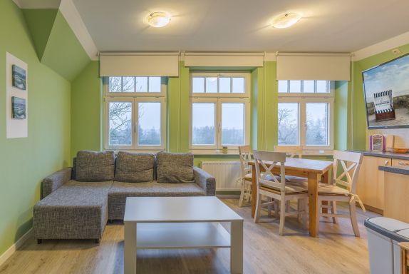 Die Wohnung 06 im 1. Obergeschoss bietet mit einem Wohnzimmer und zwei separaten Schlafzimmern Platz für 4 Personen. Sie verfügt über einen großen Flachbild-TV, eine komplette Küchenzeile im Wohnzimmer mit Geschirrspülmaschine, Backofen, 4-Platten-Herd, Mikrowelle und Kühlschrank sowie ein Badezimmer mit Dusche und WC.