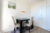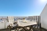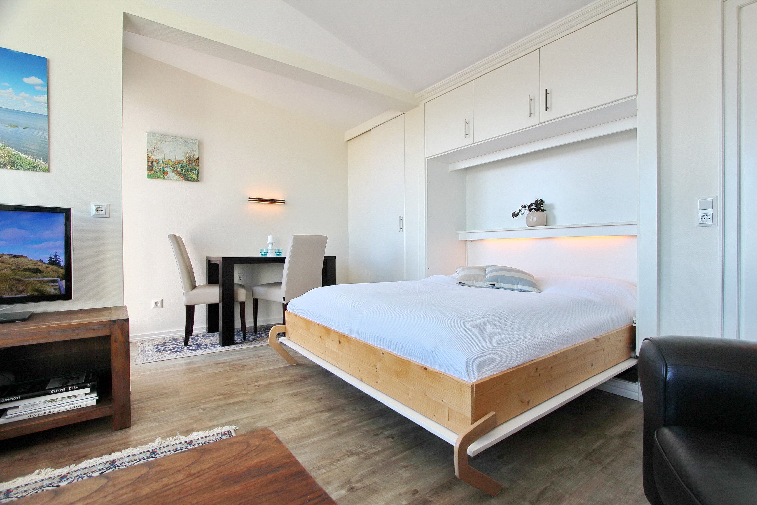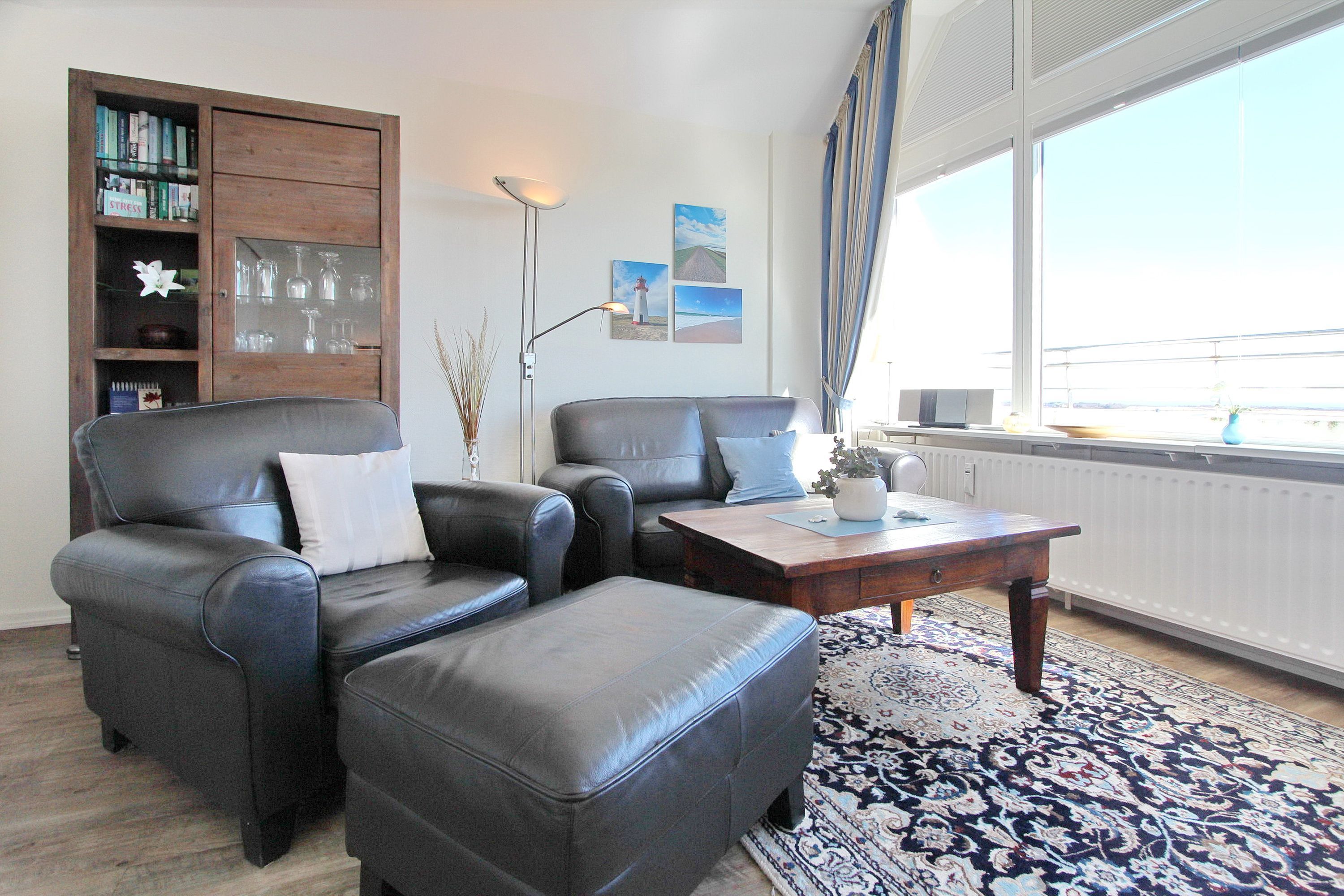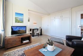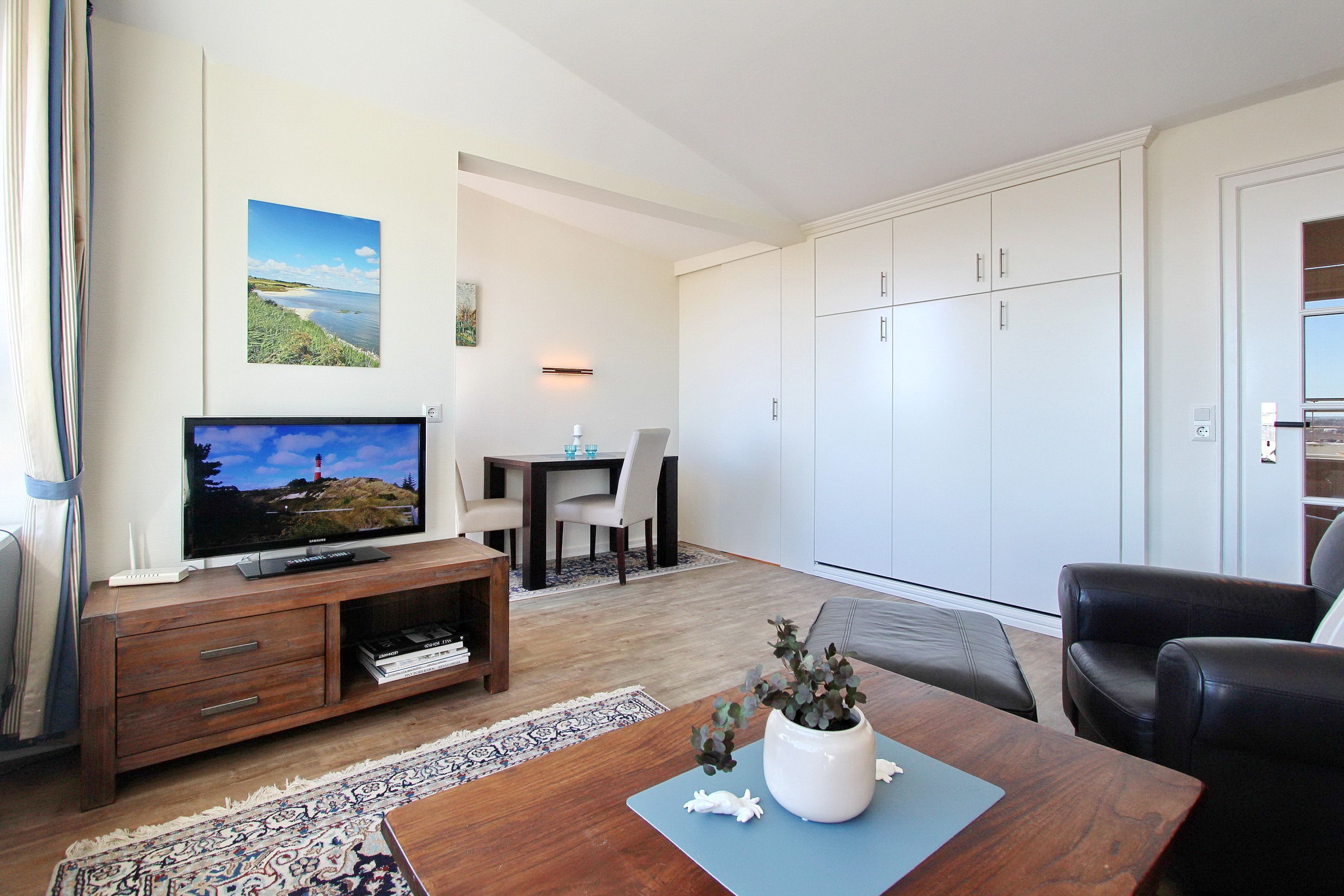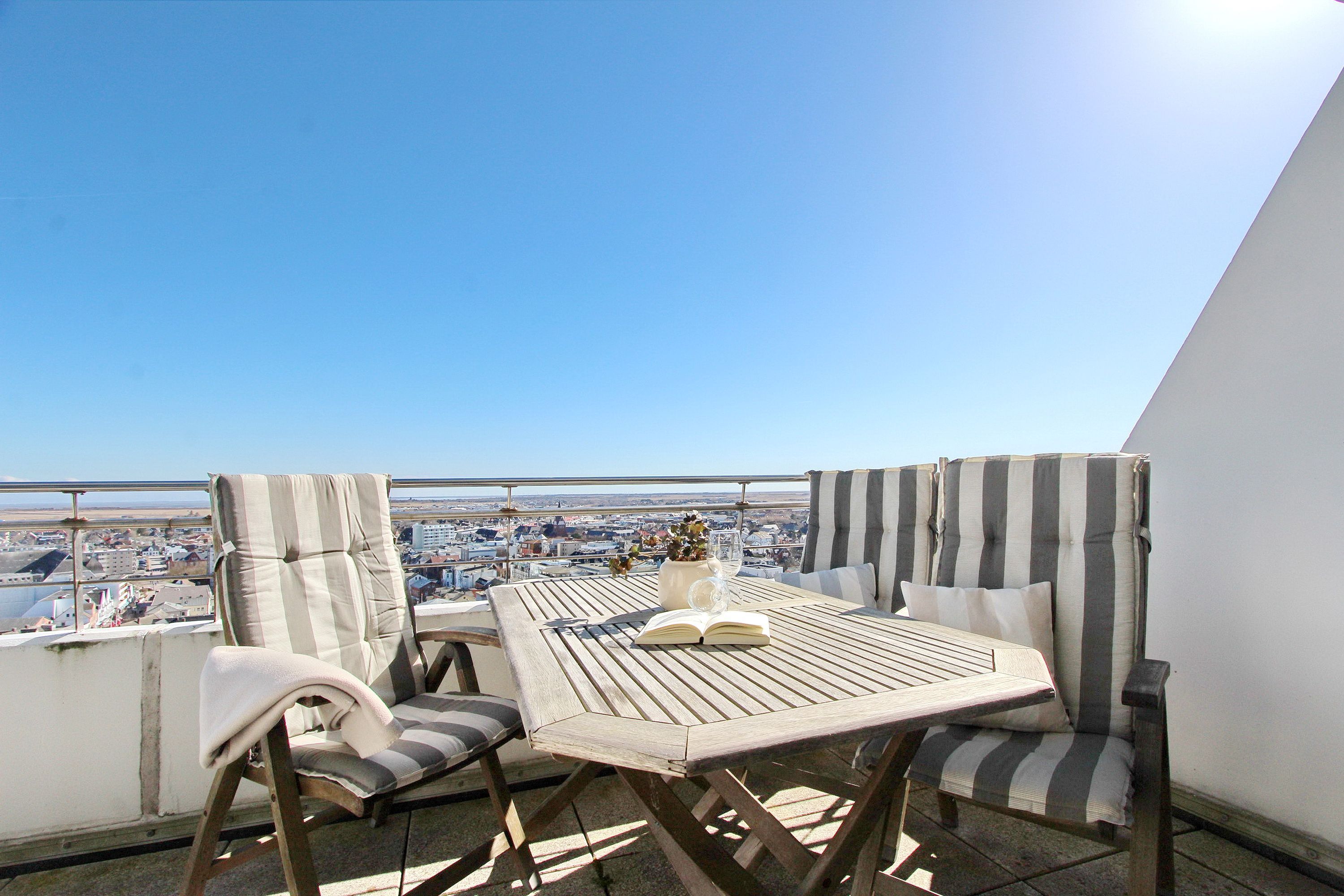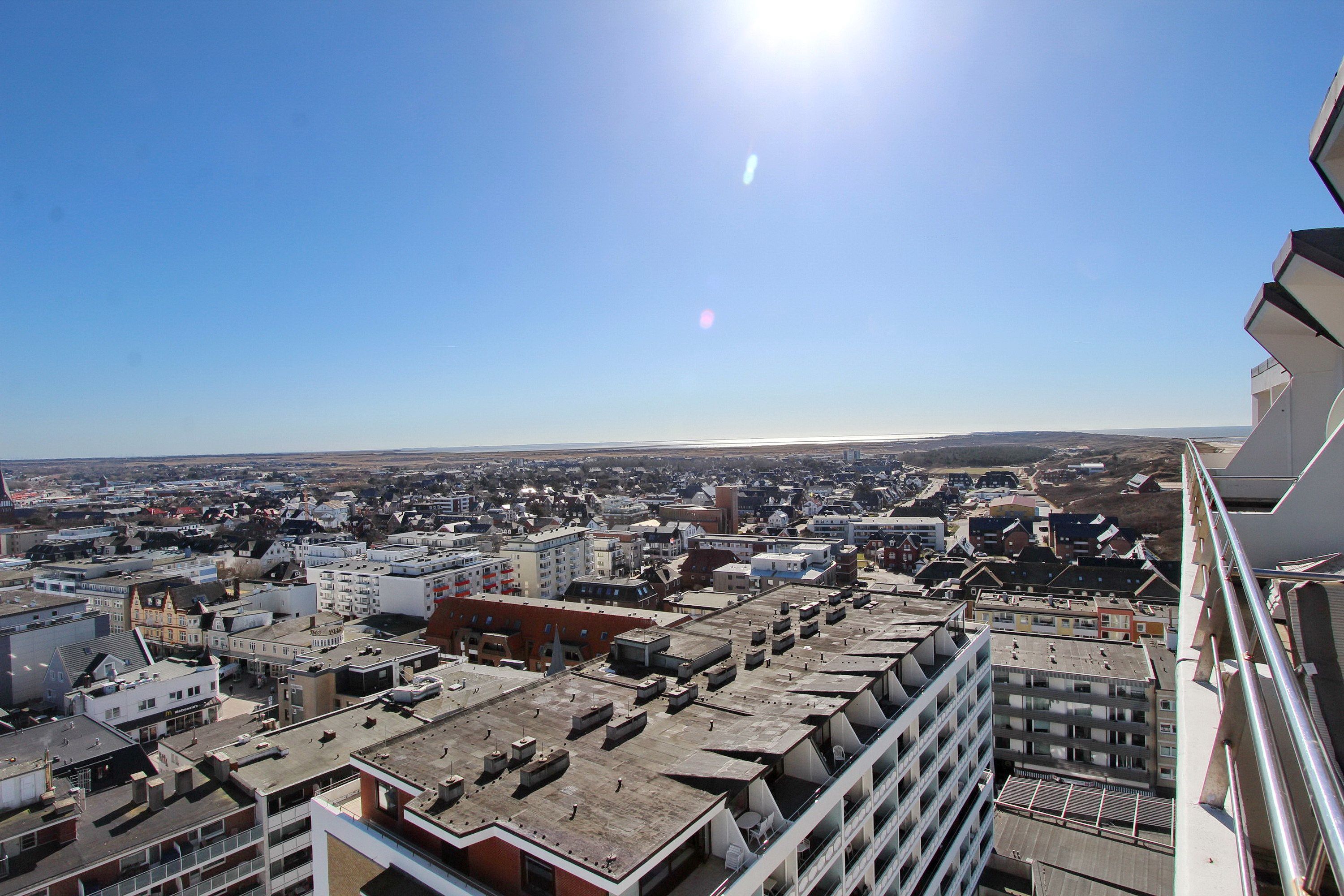 Aus der 14. Etage des Haus Metropol haben Sie einen herrlichen Weitblick über die Insel und die Stadt Westerland. Bei klarem Wetter können Sie bis zum nordfriesischen Wattenmeer und dem nahen Festland schauen. Der kombinierte Wohn-/Schlafraum mit vorgelagerter Ostdachterrasse (Terrassenmöbel sind vorhanden) ist mit Laminatfußboden, einem Doppelschrankbett, kleiner begehbarer Kleiderschrank, einem Essplatz mit 2 Stühlen und einer Sitzgruppe und Fernsehsessel eingerichtet. Im Badezimmer gibt es eine Dusche. Selbstverpflegung ist dank der kleinen Einbauküche mit Nespresso-Maschine, Geschirrspüler, Ceranfeld und Mikrowelle im Flur möglich. Zur technischen Ausstattung gehört : ein Flachbildfernseher und ein Radio mit CD Spieler. Der freie WLAN Hotspot (WEG Haus Metropol - Passwortfrei - ohne Gewähr) steht ihnen kostenfrei zur Verfügung. Das Penthouse ist nur über eine Treppe erreichbar, da der Aufzug in der 13. Etage endet. Diese Nichtraucherwohnung hat eine Größe von ca. 38 m².