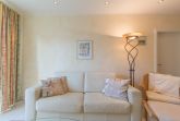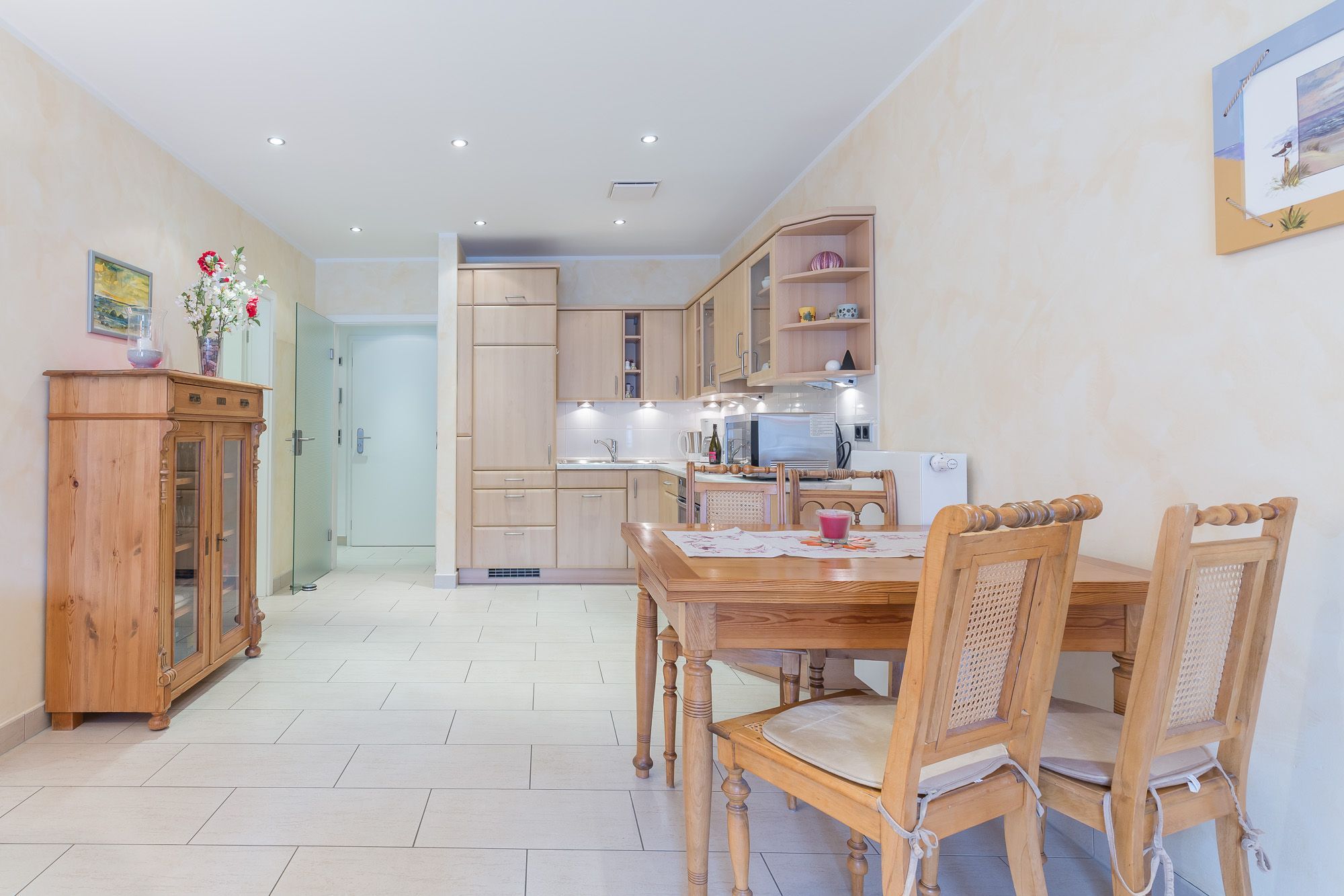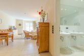 Die Ferienwohnung Nr. 5 liegt im 1. Obergeschoss zur Südseite und ist 55 qm groß. Sie ist modern und mit hochwertigen Möbeln ausgestattet und verfügt über eine komfortable Küchenzeile mit Backofen, Geschirrspülmaschine und Mikrowelle sowie ein Vollbad mit zwei Waschbecken, Dusche, Badewanne und WC. Die Ferienwohnung verfügt zudem über ein separates Gäste-WC.