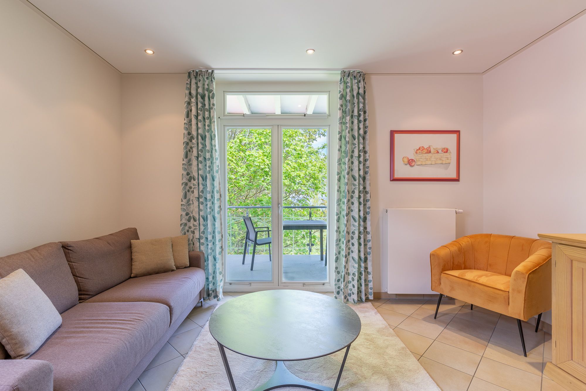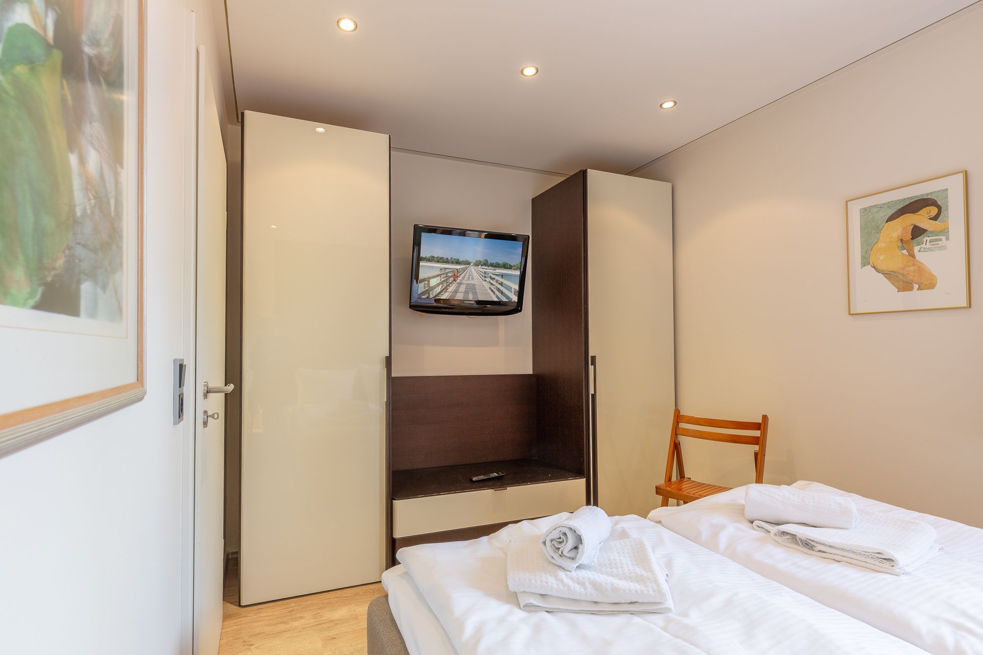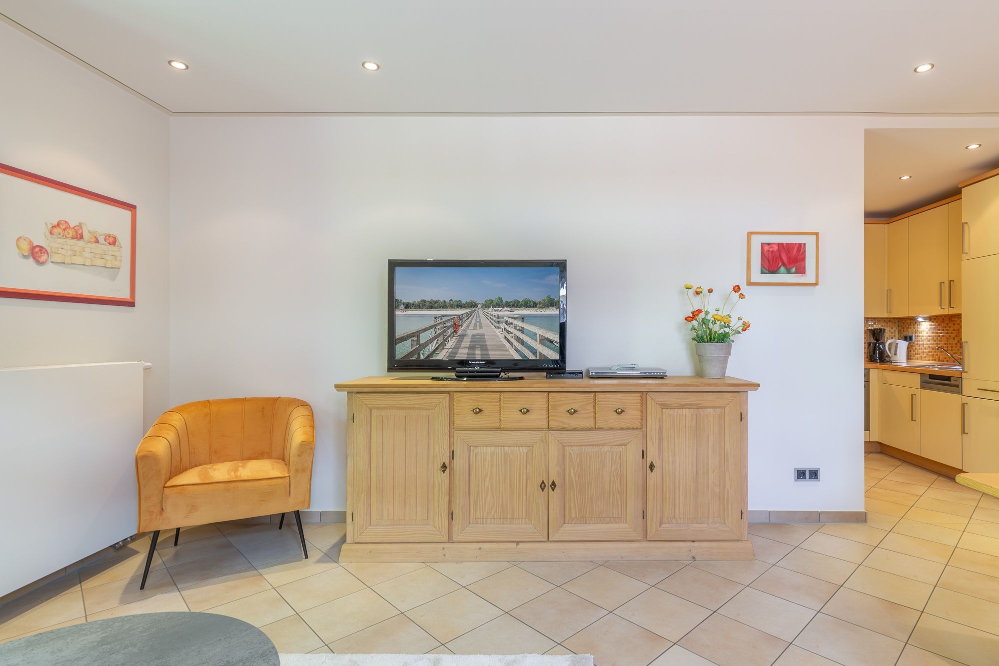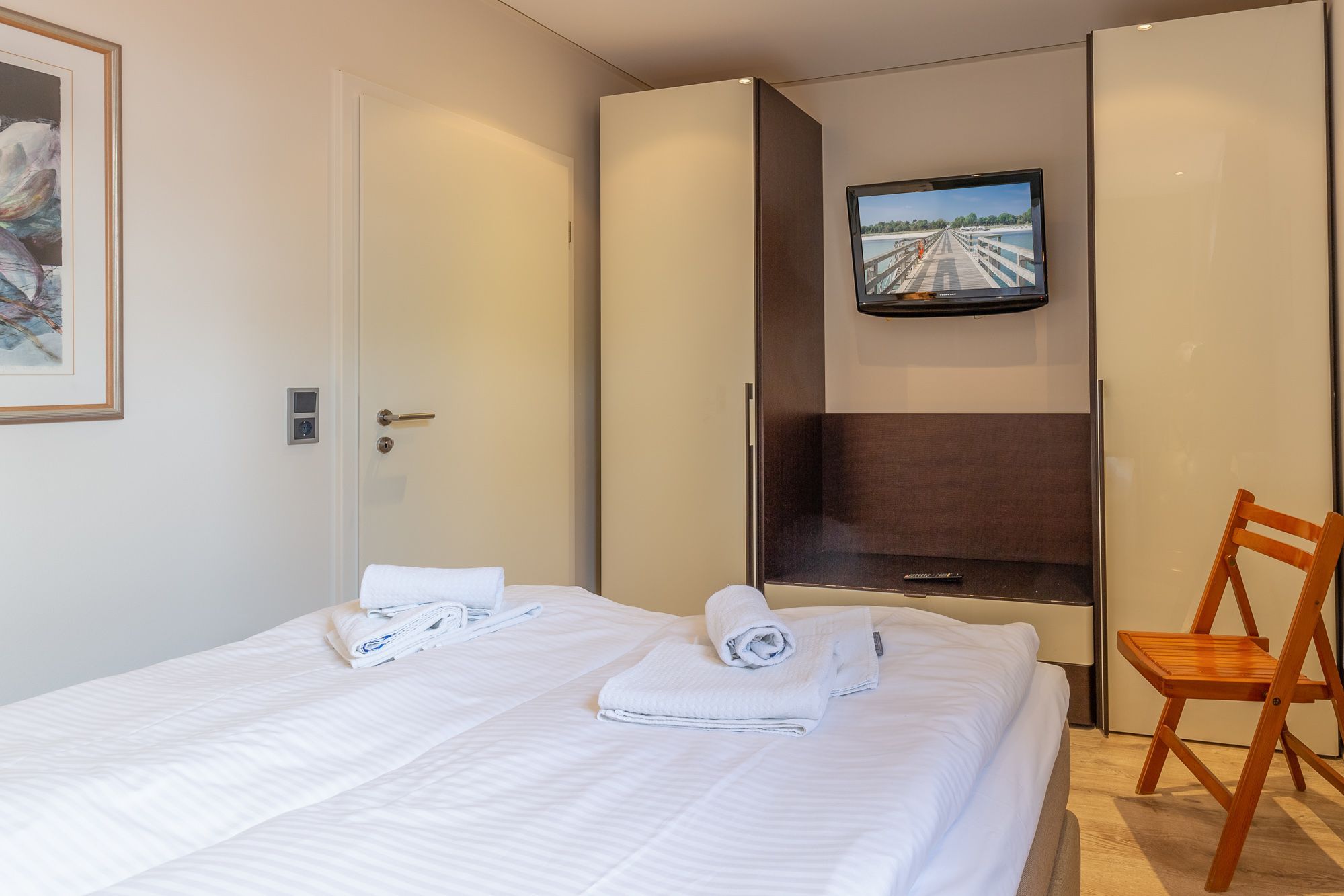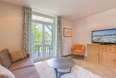 Das Wohnzimmer bietet Ihnen einen offenen und freundlichen Blick über die Anlage in Richtung Ostsee. Der großzügige Balkon ist nur eines der vielen Highlights Ihres Appartements. Sowohl im Wohn- als auch im Schlafzimmer steht je 1 moderner Flatscreen-Fernseher zur Verfügung.