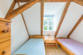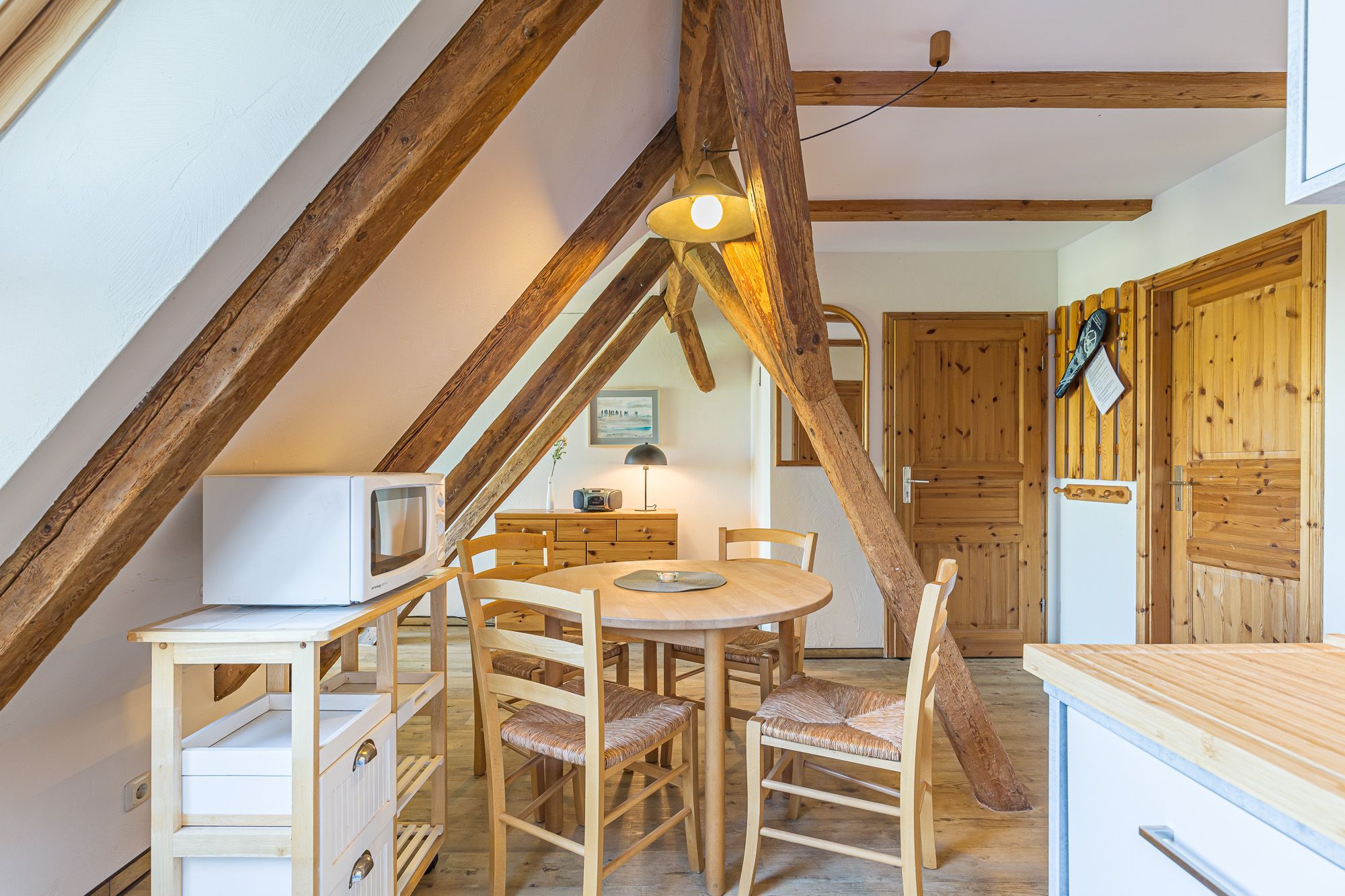 Die Wohnung 3 befindet sich im 1. Obergeschoss. Sie hat eine Größe von 48 m² und ist für bis zu 4 Personen geeignet. Die Wohnung besitzt zwei Schlafräume mit zwei Einzelbetten und einem Doppelstockbett. Die zum Wohnbereich offene Küche ist ausgestattet mit E-Herd (ohne Backofen), Kühlschrank mit Gefrierfach, Mikrowelle und Toaster.