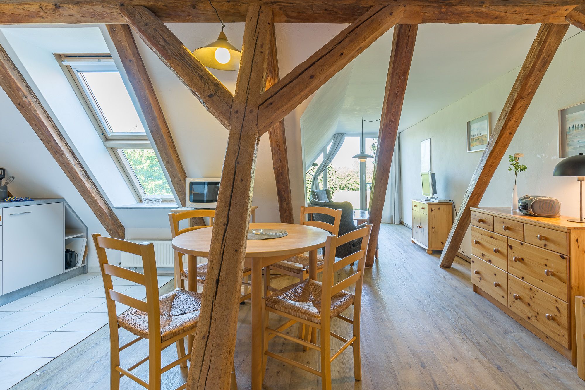 Der Wohnbereich der Wohnung liegt im Bereich des Ostgiebels, der bei guter Sicht den Blick auf die Ostsee frei gibt. Hier befindet sich auch das Satellitenfernsehgerät und ein Radio für die Unterhaltung.