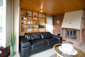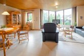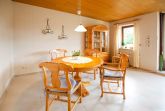 Das gemütliche Wohnzimmer der Ferienwohnung ist mit einem bequemen Sofa und einem Sessel, einem Couchtisch und einem großen Esstisch ausgestattet.