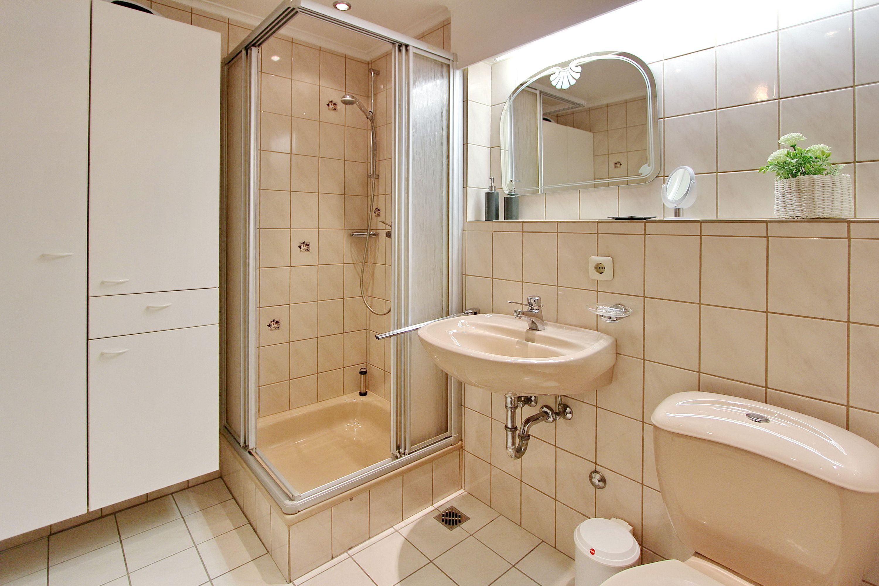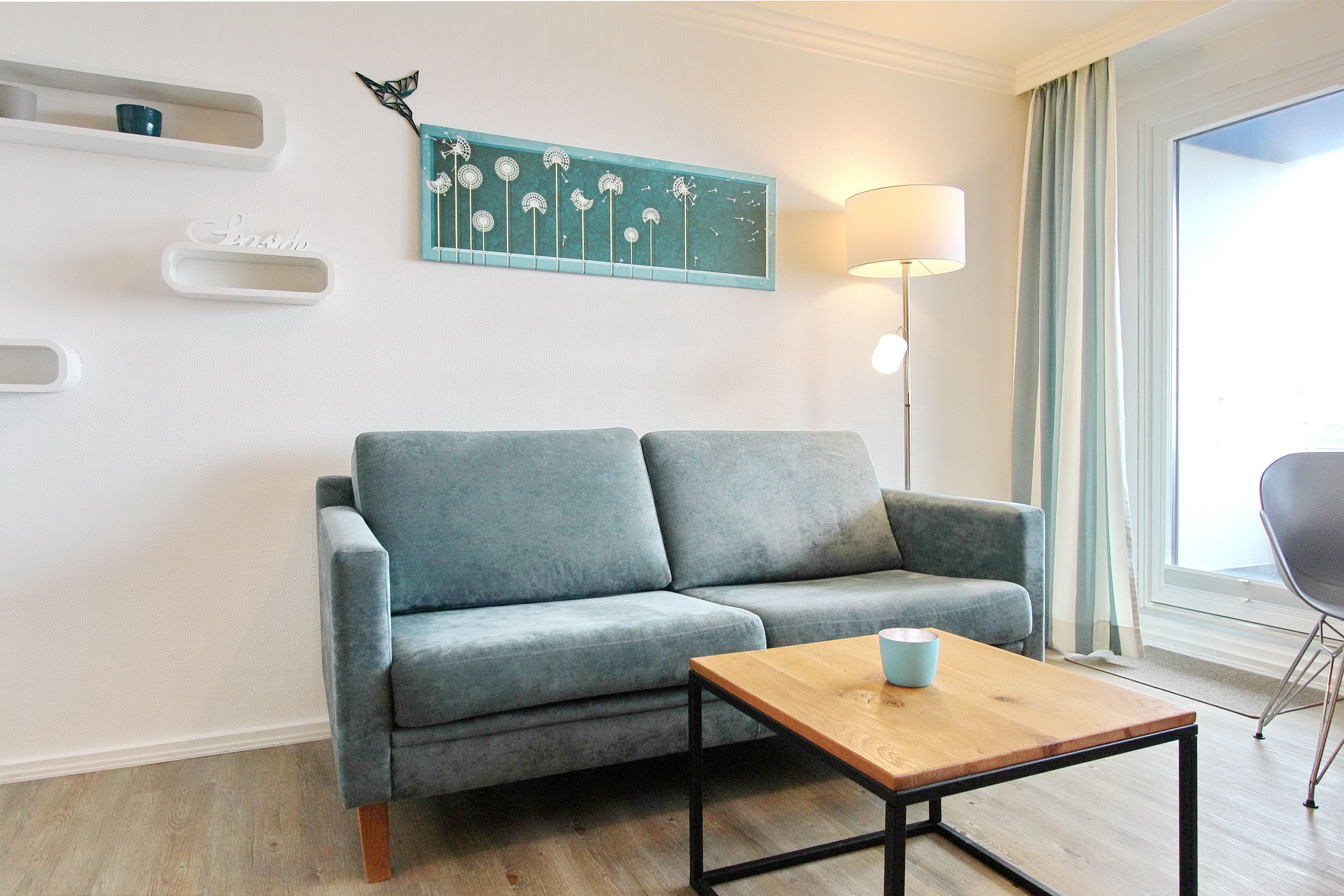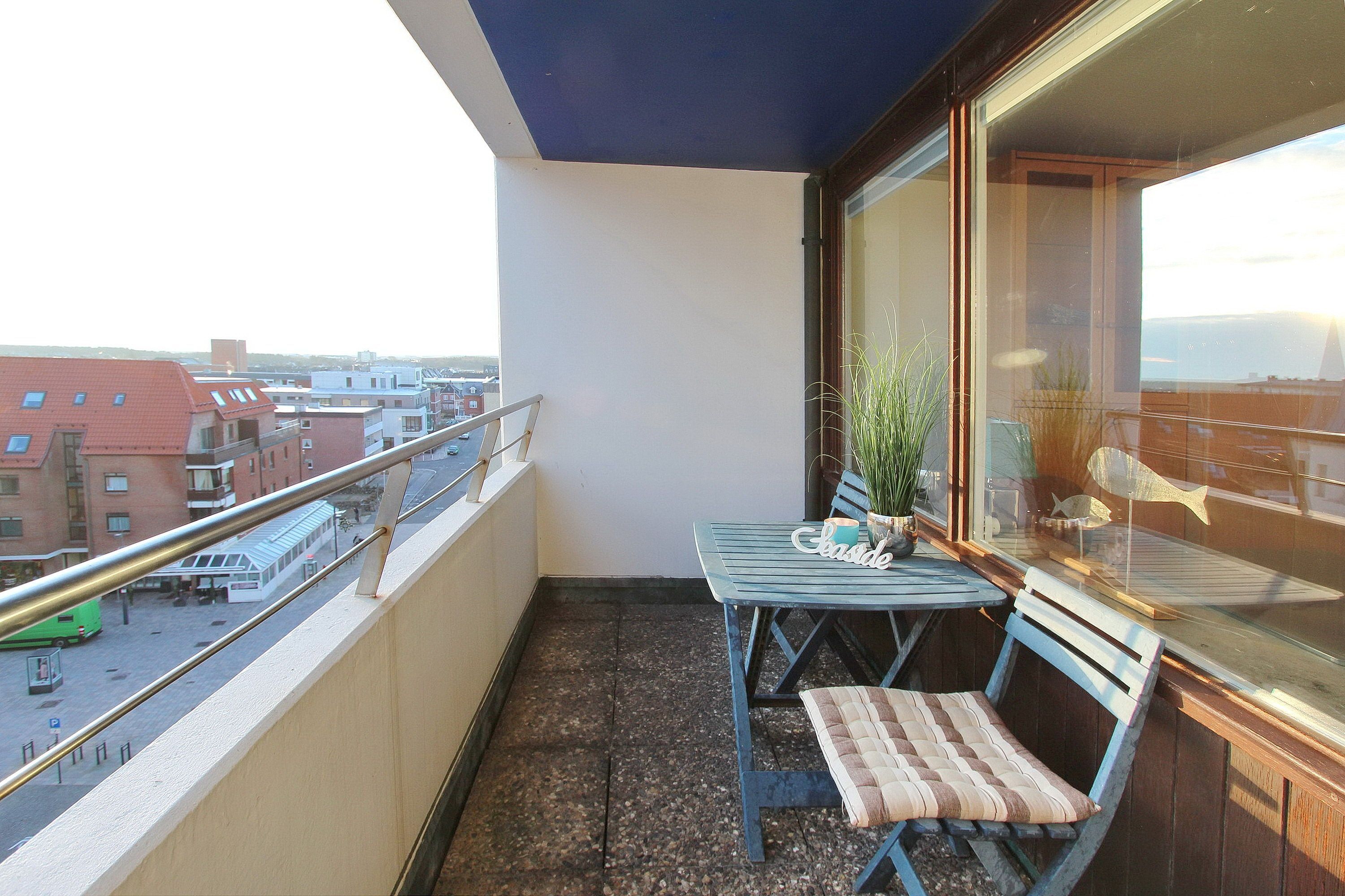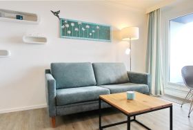 Diese Einzimmerwohnung befindet sich in der 4. Etage im Haus am Meer, nur wenige Schritte vom Strand und Meer entfernt. Der kombinierte Wohn-/Schlafraum mit vorgelagertem Ostbalkon (inkl. Balkonmöbel) verfügt über ein Doppelschrankbett, eine Couch und einen Essplatz mit 2 Stühlen. Im Badezimmer gibt es eine Dusche, einen Badezimmerhocker, einen mobilen Haltegriff, einen Fön und einen Kosmetikspiegel. Ausreichend Ablagefläche und Stauraum für ihre persönlichen Dinge ist vorhanden. Um sich während des Urlaubs selbst zu verpflegen steht ihnen im Flur eine Küchenzeile mit 4 Platten Herd, Dunstabzugshaube und zusätzlicher Nespressomaschine zur Verfügung. Zur technischen Ausstattung dieser Wohnung gehört: ein Smartfernseher von Panasonic. Den kostenfreien Zugang zum WLAN Hot Spot (WEG Haus am Meer - Passwortfrei - ohne Gewähr) können sie nutzen. Wohnungsgröße: ca. 30 m².