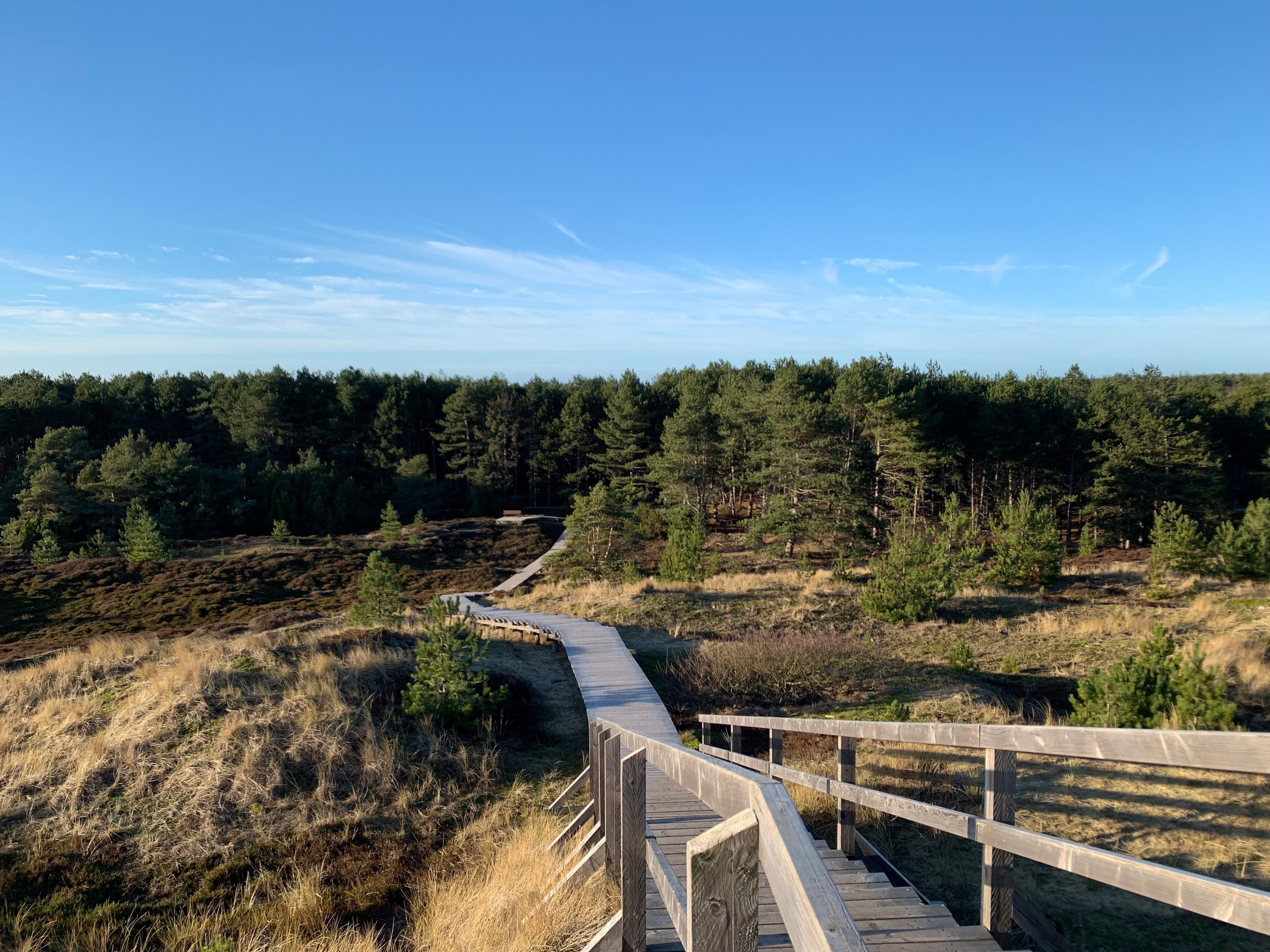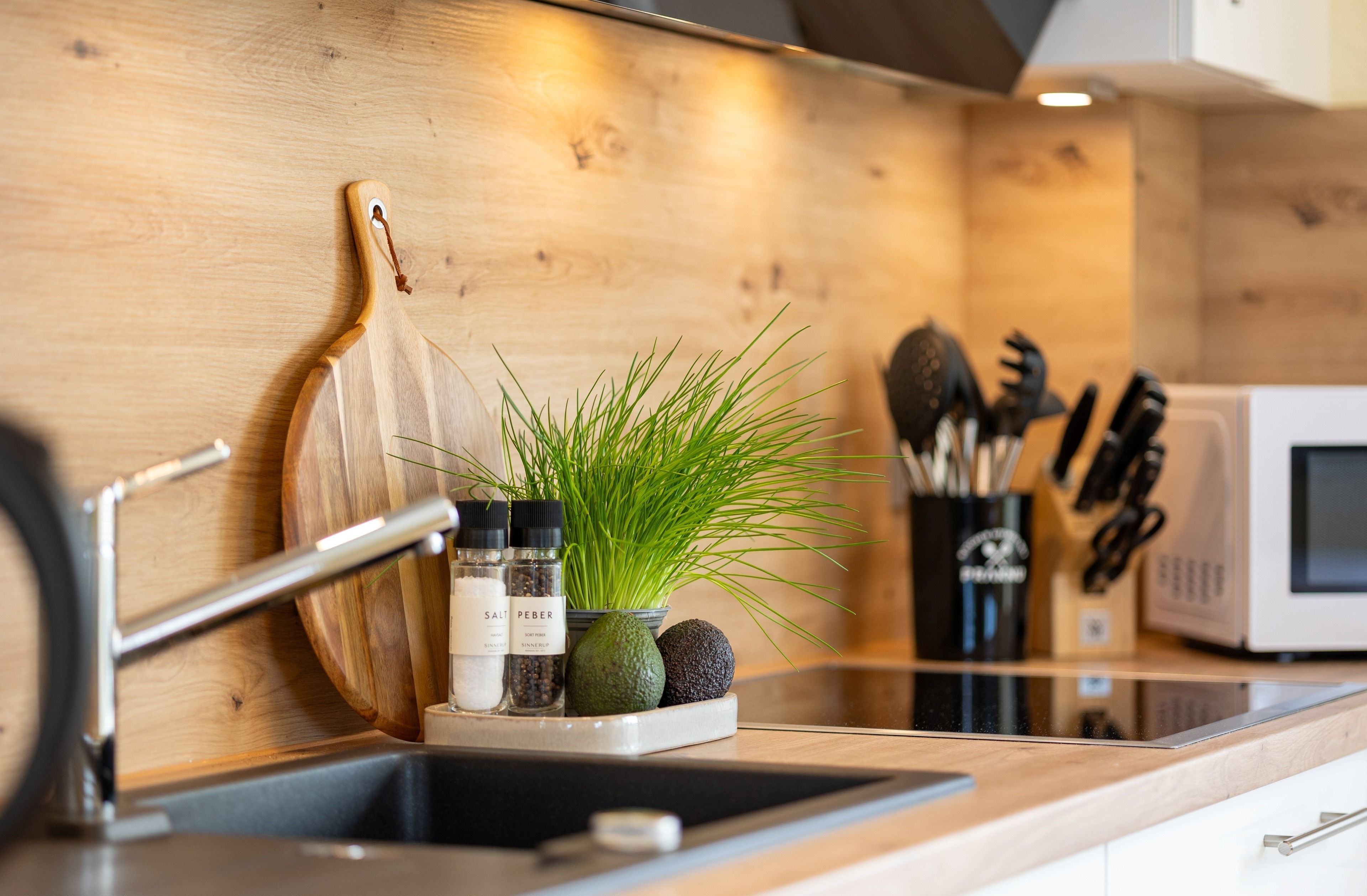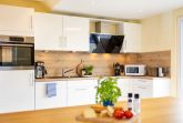 Die moderene Küche bietet genug Platz zum entspannten Kochen und zusätzlich den Zugang zum zweiten Balkon, der einen herrlichen Blick auf Amrums traumhaftes Naturschutzgebiet am Kniephaken bereithält.