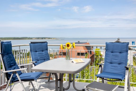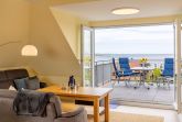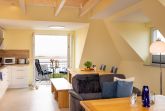 Der großzügigen Wohn-Essbereich - mit direktem Zugang zur Dachterrasse - bietet ein Sat-TV Gerät, hochwertige Sofas und weitere Sitzmöglichkeiten. Von der Dachterrasse reicht der Blick über den Hafen nach Steenodde bis nach Norddorf und zur Nachbarinsel Föhr.
