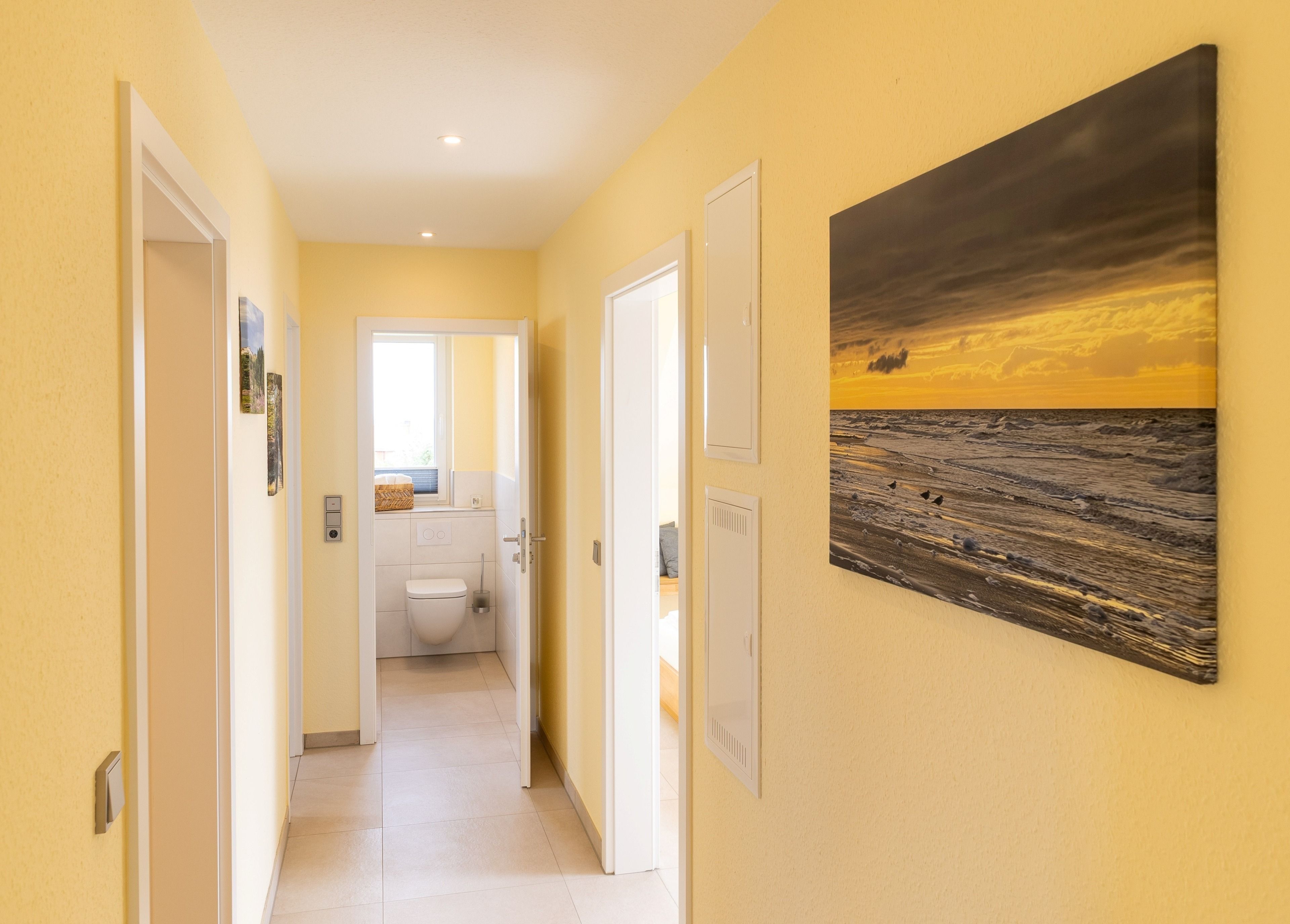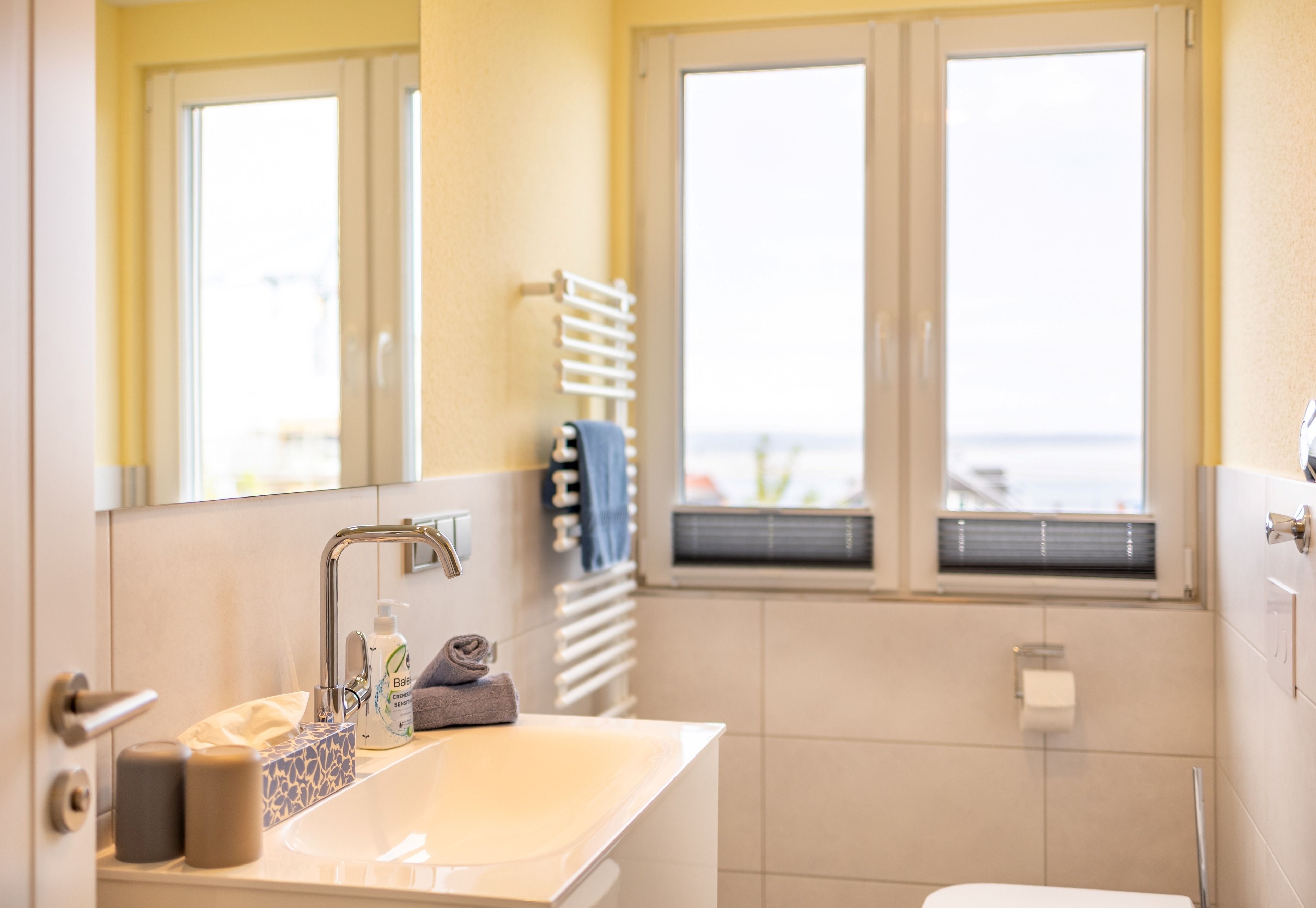 Es erwartet sie außerdem ein hochwertiges, modernes Badezimmer mit ebenerdiger Dusche und WC sowie ein separates Gäste-WC. An allen Fenstern befinden sich Sonnenschutzmöglichkeiten in Form von Plissees.