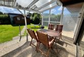 Zum Garten hin gelegen ist eine ca. 20 qm² große, überdachte und windgeschützte Terrasse, die vom Wohnzimmer aus begehbar ist. Der Garten ist eingezäunt und nicht einsehbar.