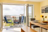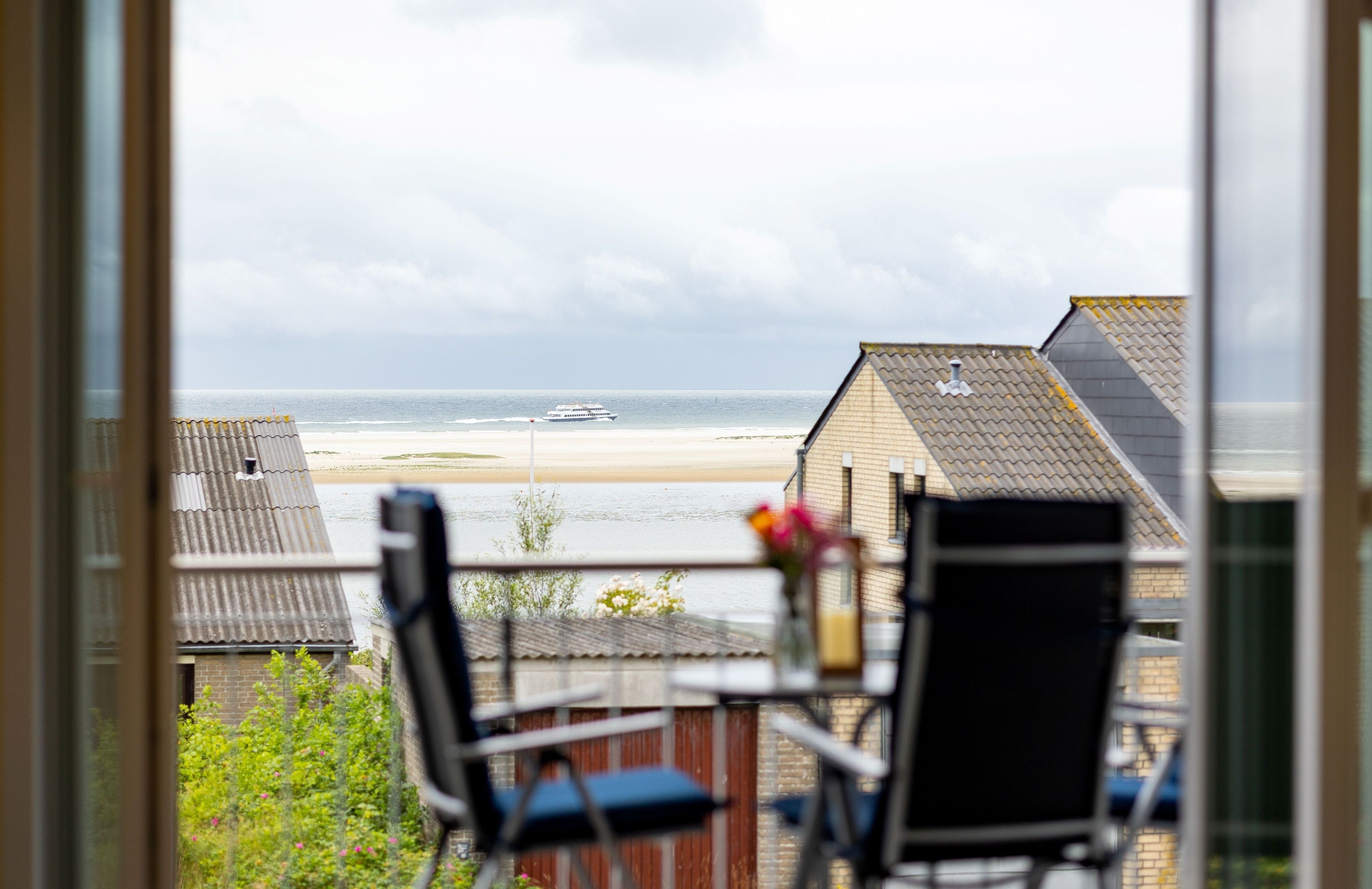 Vom Essbereich aus können Sie die Schiebetüren zum Balkon für einen herrlichen Blick auf Amrums traumhaften Kniephaken öffnen.
