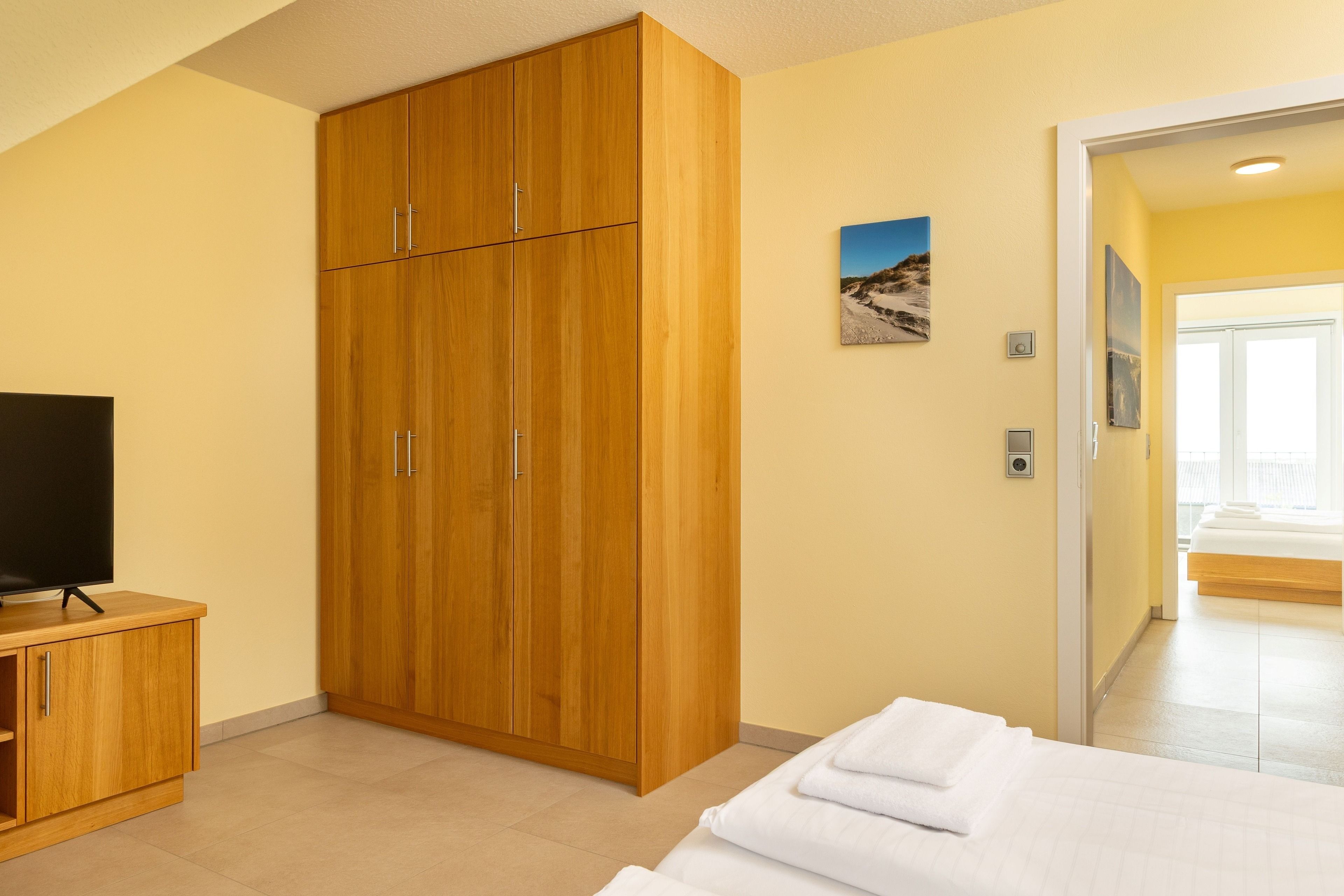 Drei Schlafzimmer mit Doppelbett, eigenem TV und geräumige Einbauschränke werden jeweils mit Meerblick abgerundet.