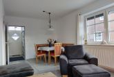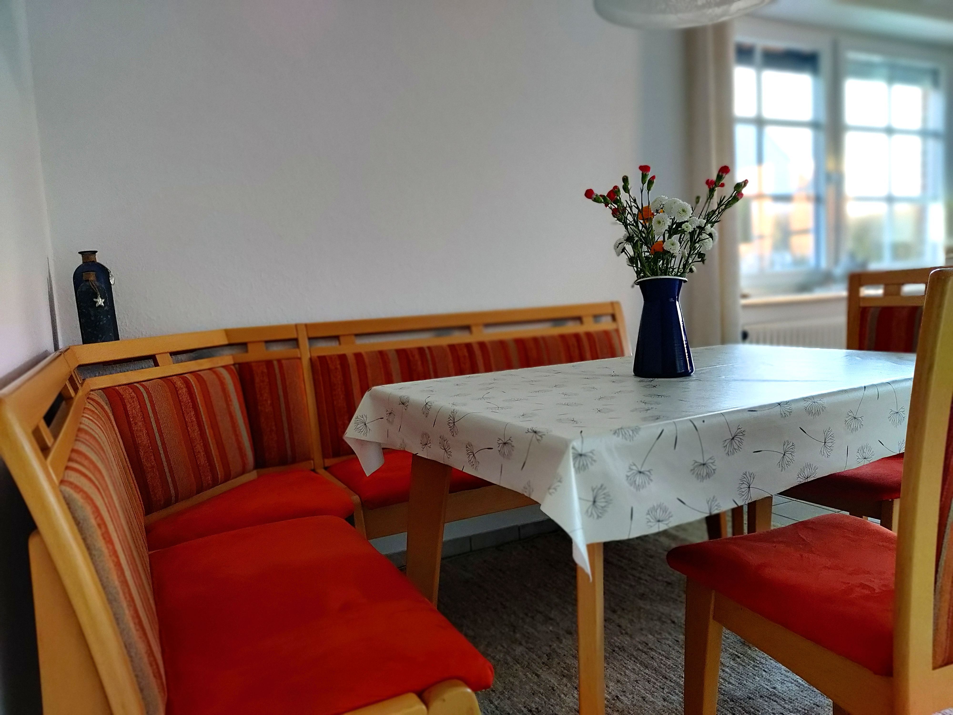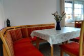 Wohnzimmer mit Esstisch (ausziehbar), 4 Stühlen und Eckbank, Komfort-Couch, Sessel, Flachbild TV, Radio