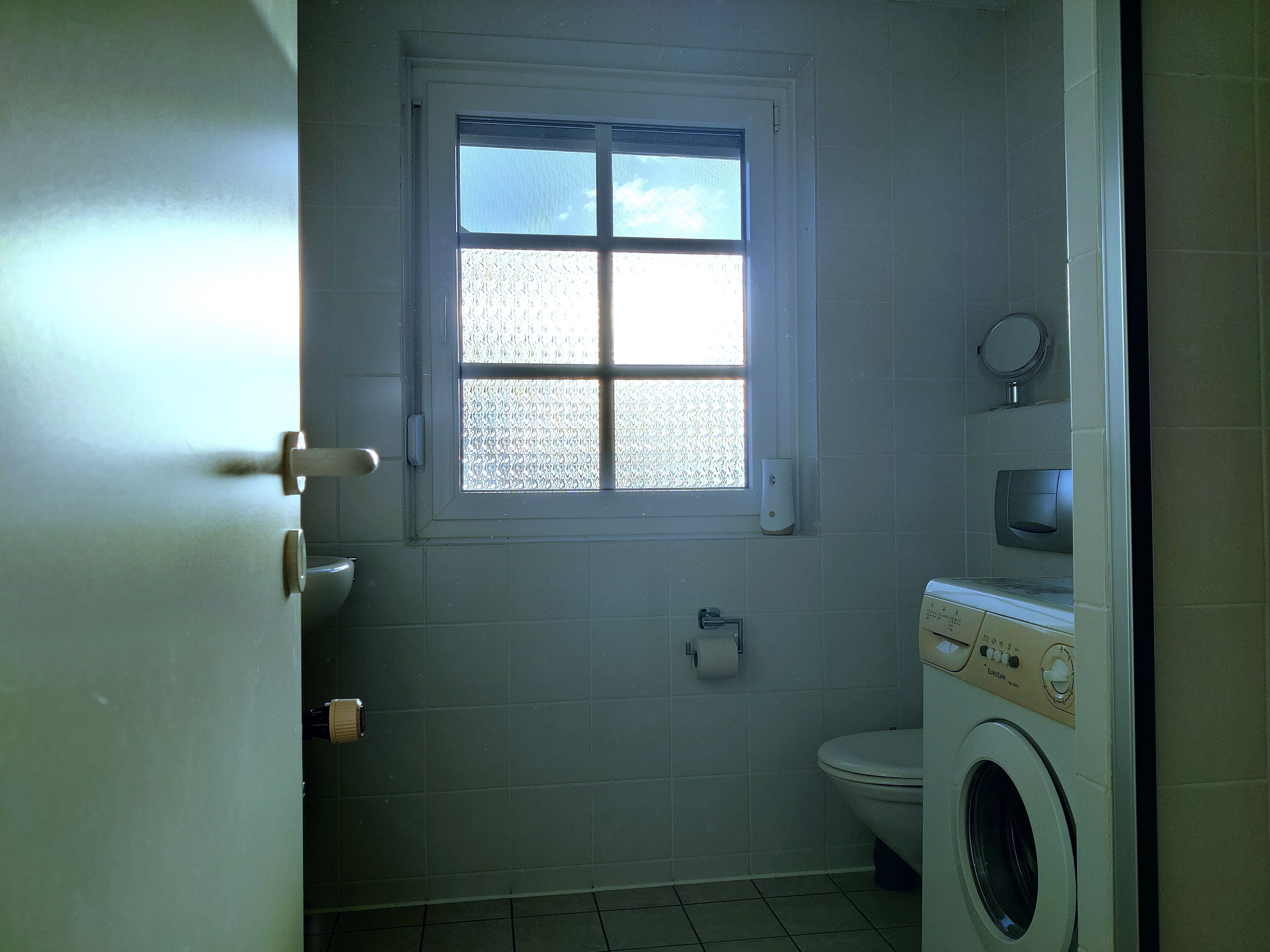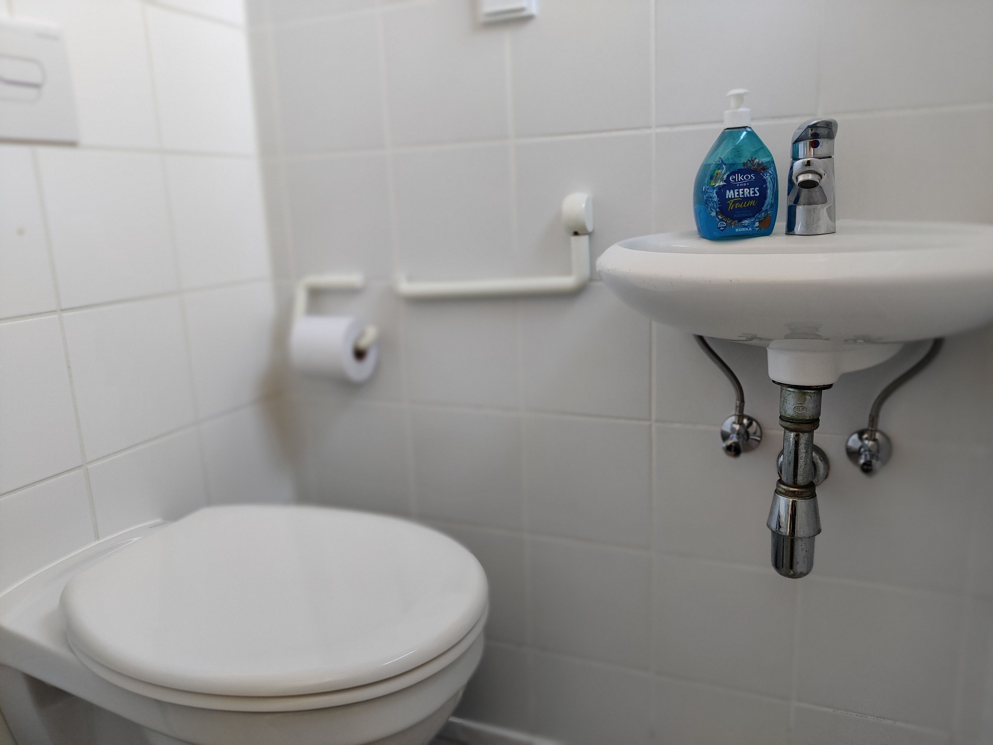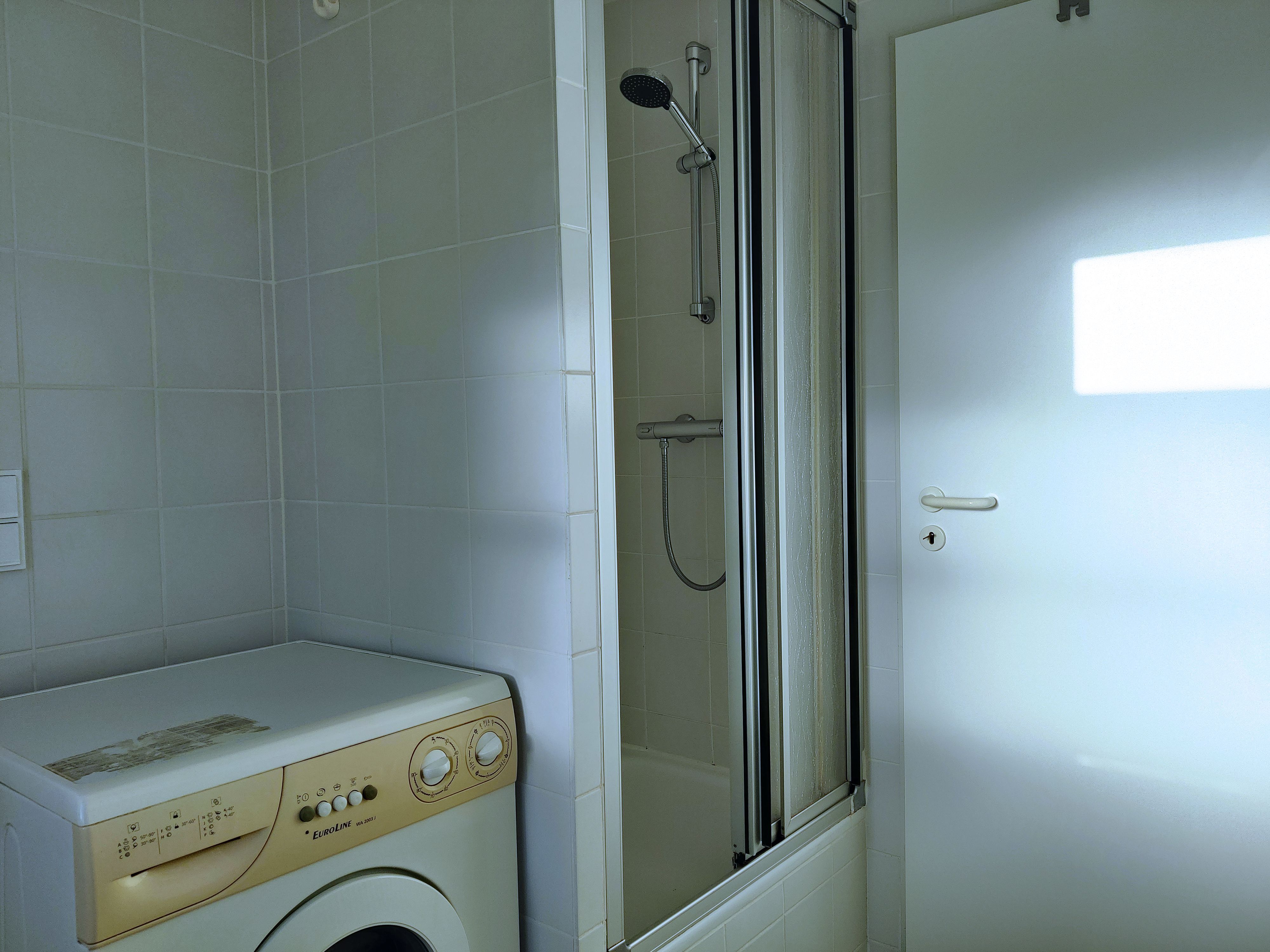 Badezimmer mit Dusche, Toilette und Waschmaschine