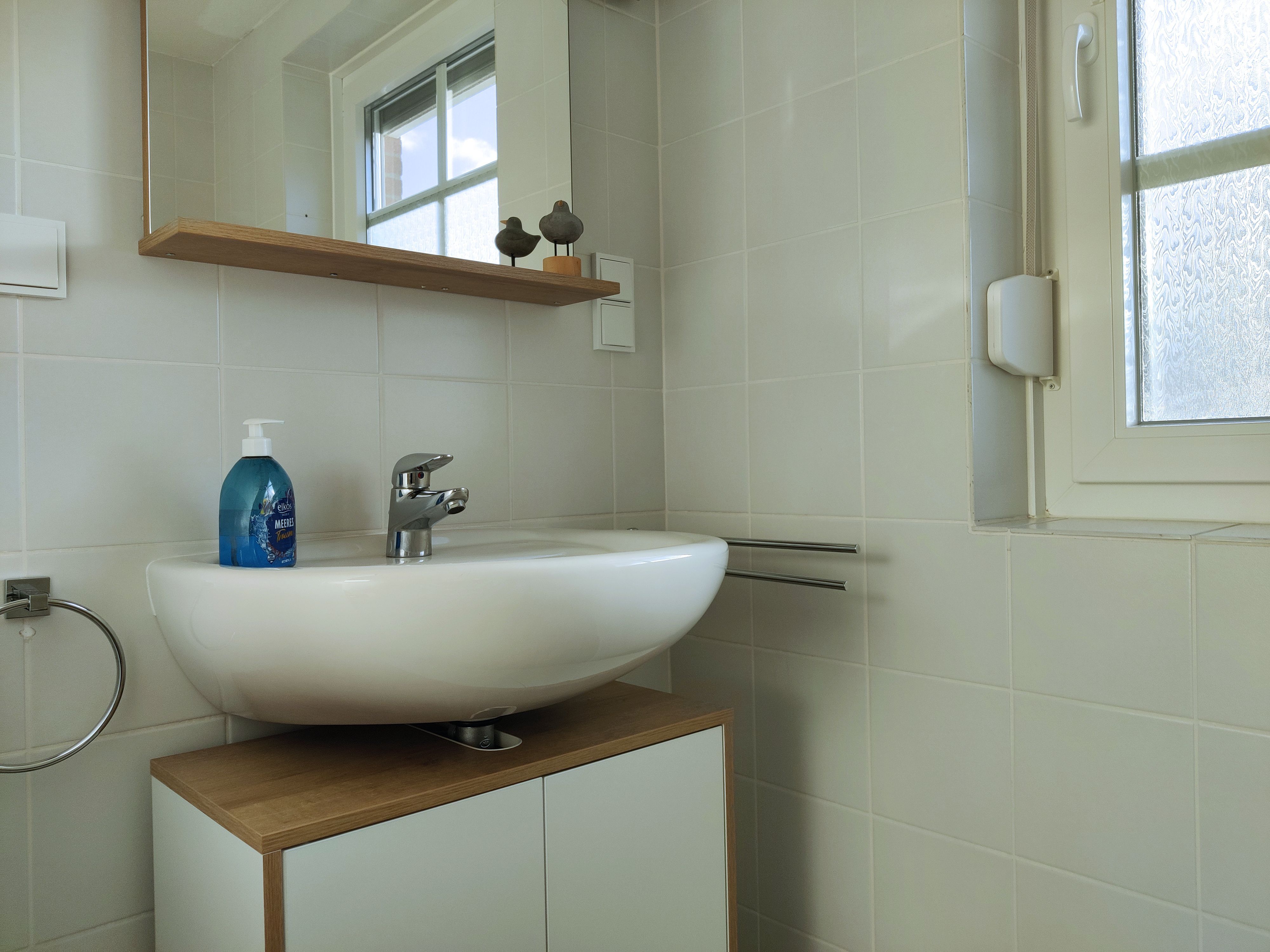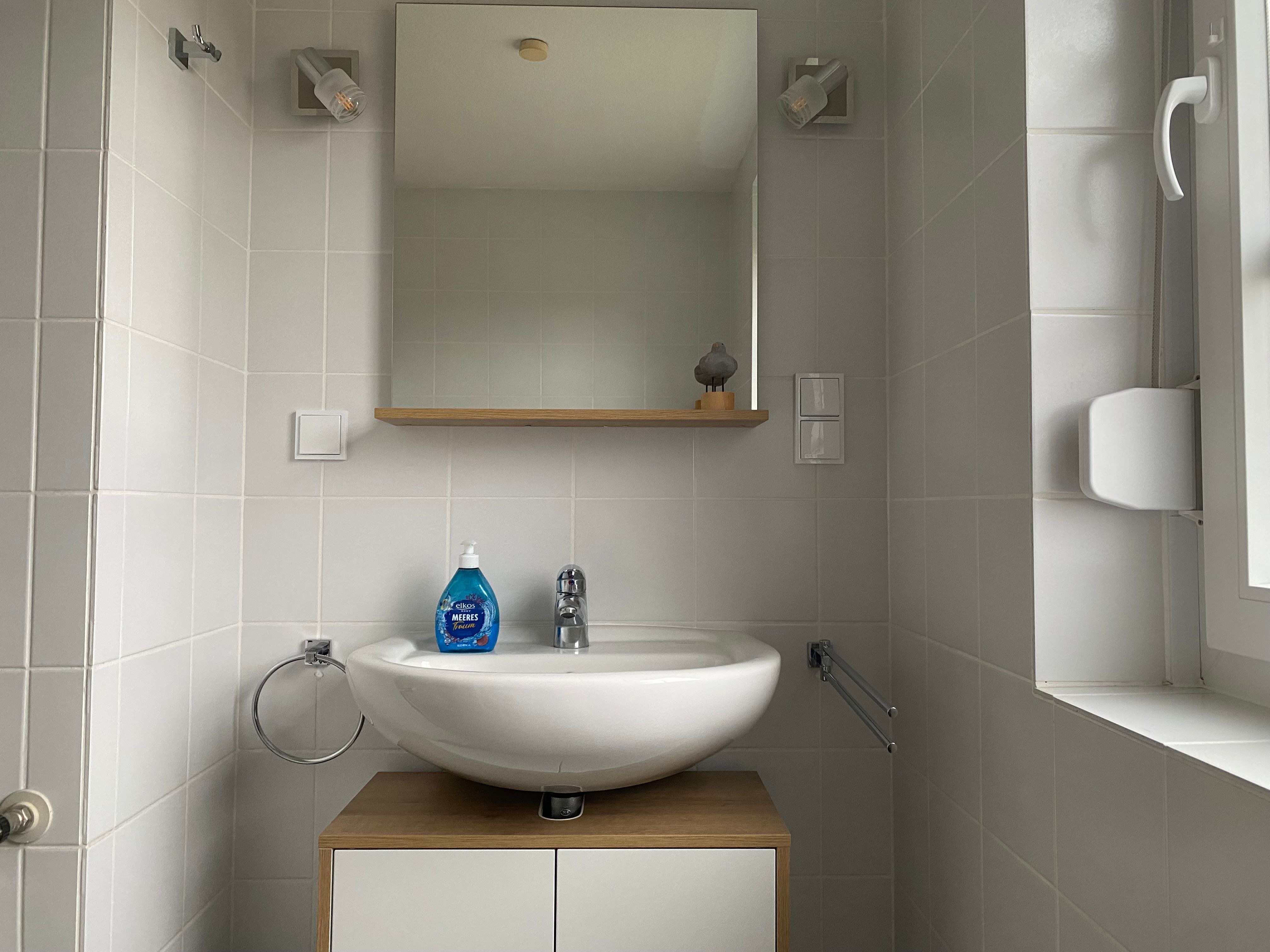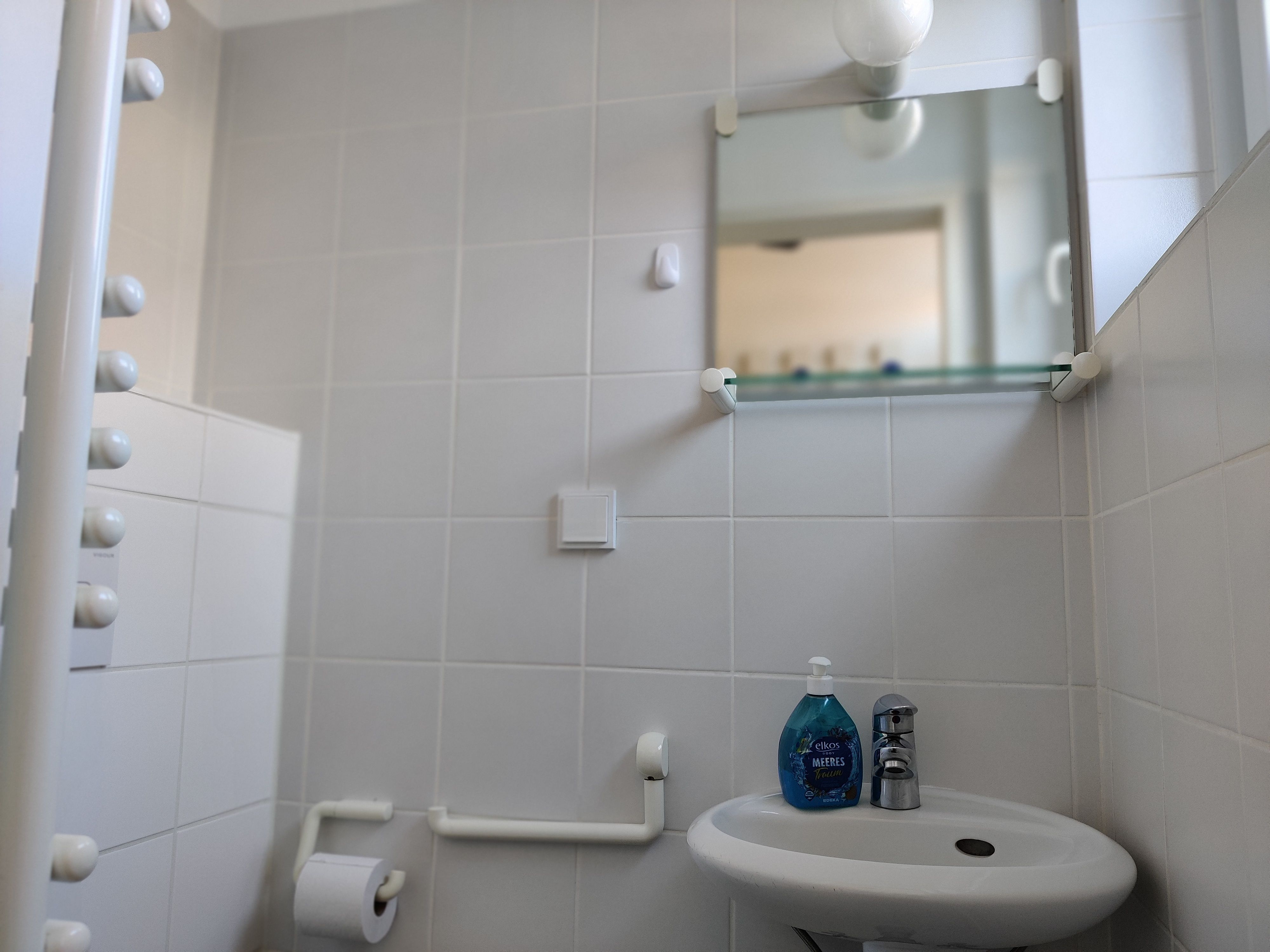 Badezimmer mit Dusche, Toilette und Waschmaschine