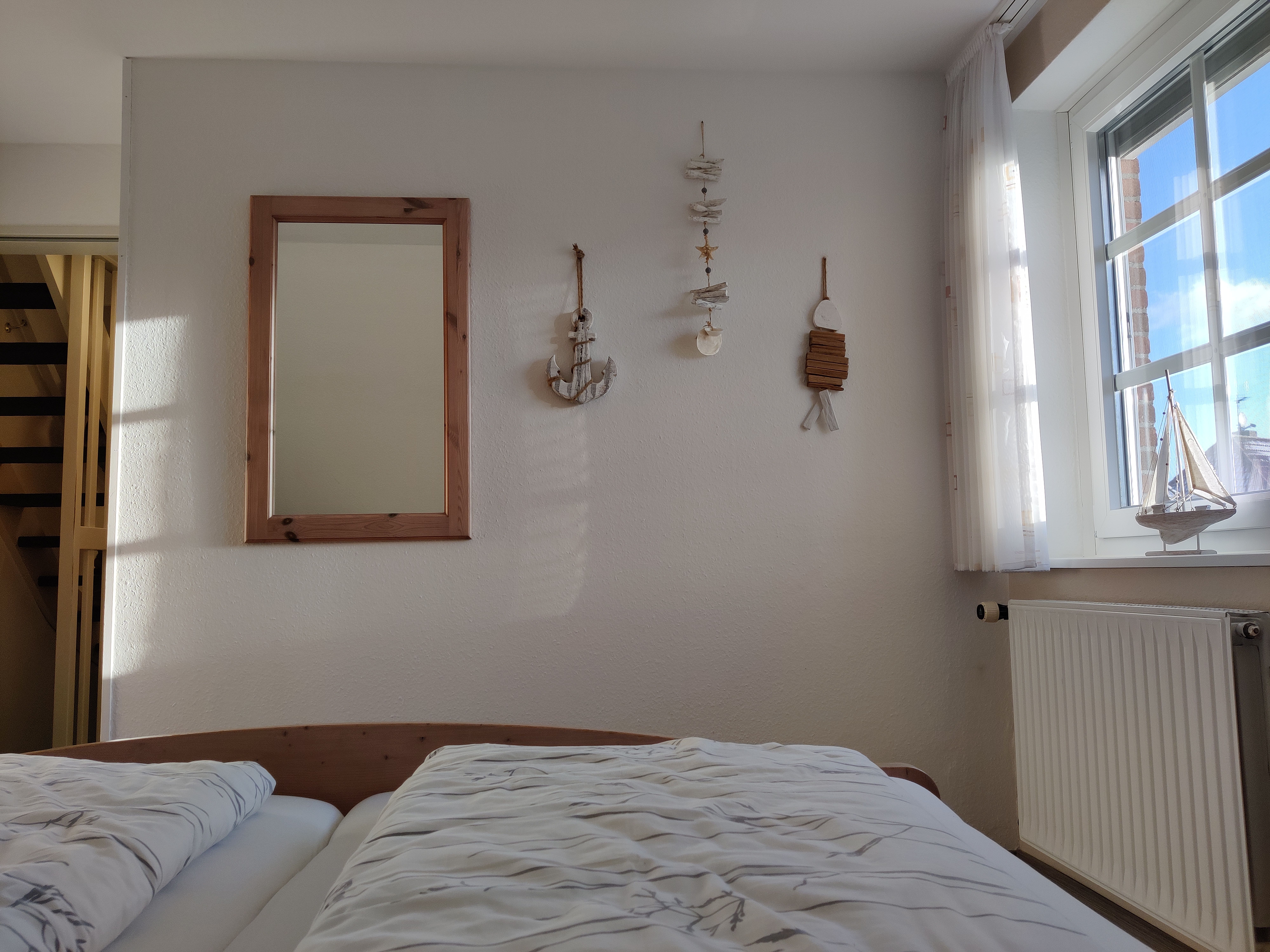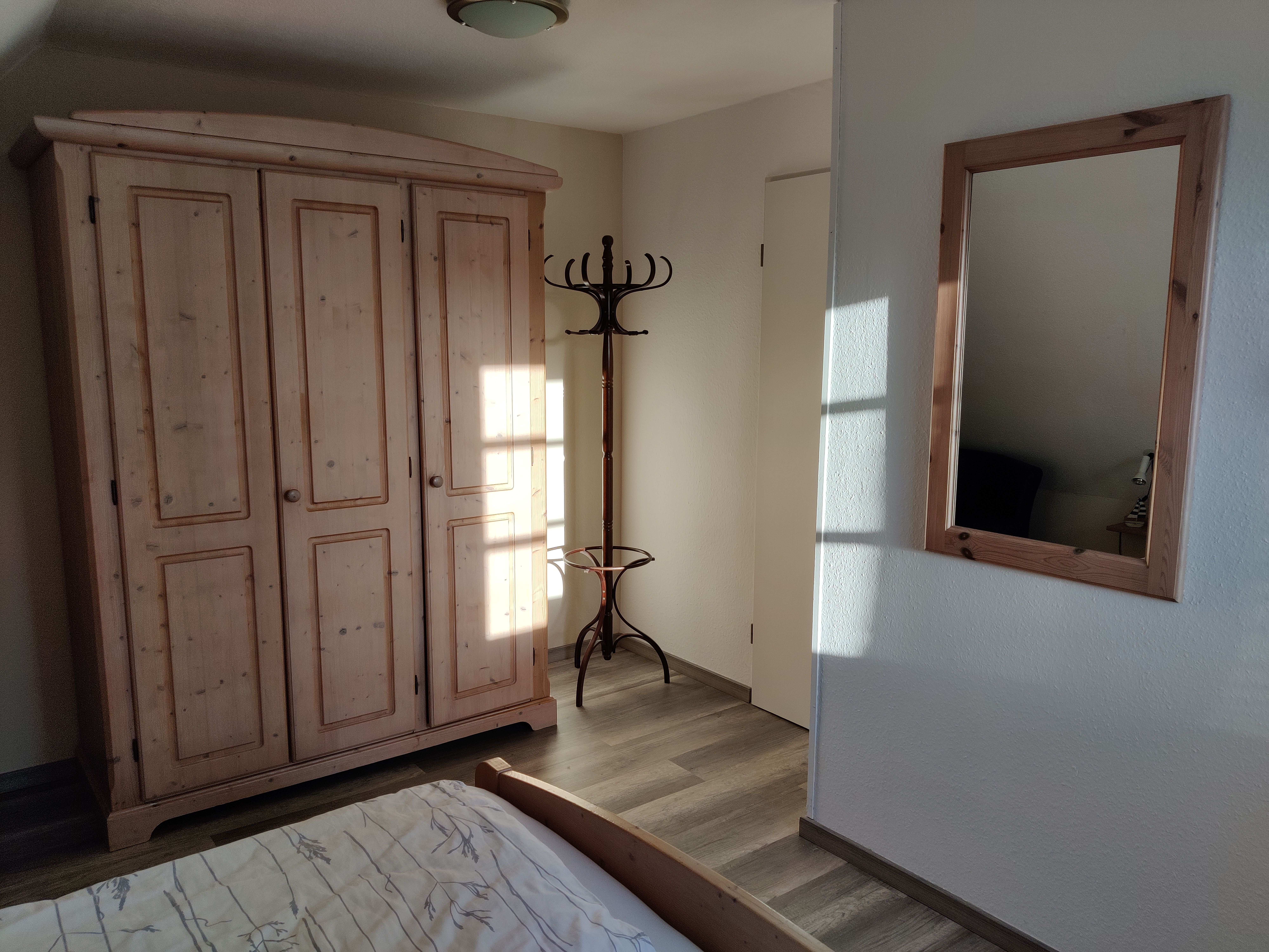 ein Schlafzimmer mit einem Doppelbett (180cm x 200cm), Schrank und Garderobenständer