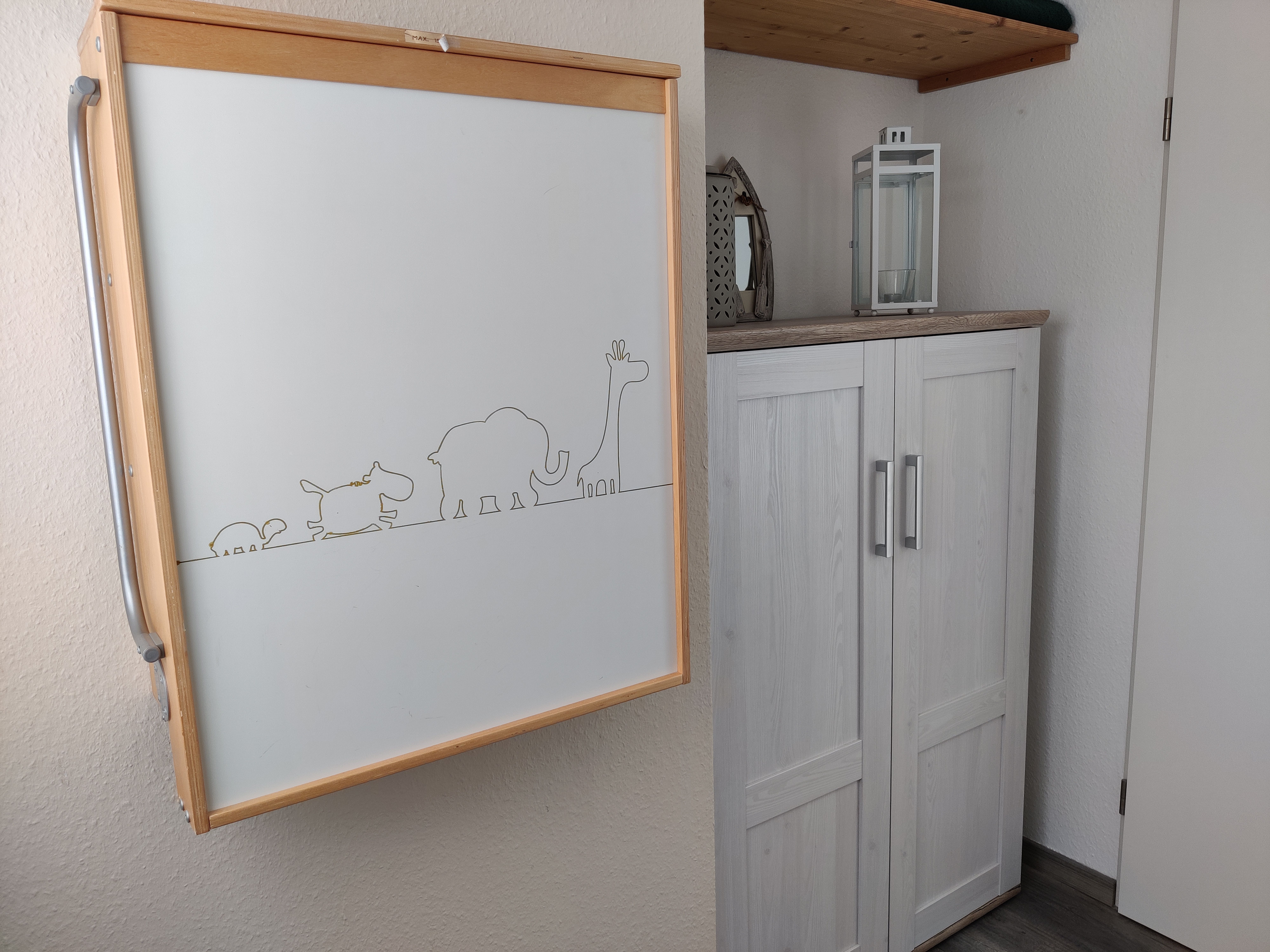 kleiner Abstellraum mit Staubsauger, Wäschesständer und Wäscheklammern sowie Bügelbrett und Bügeleisen