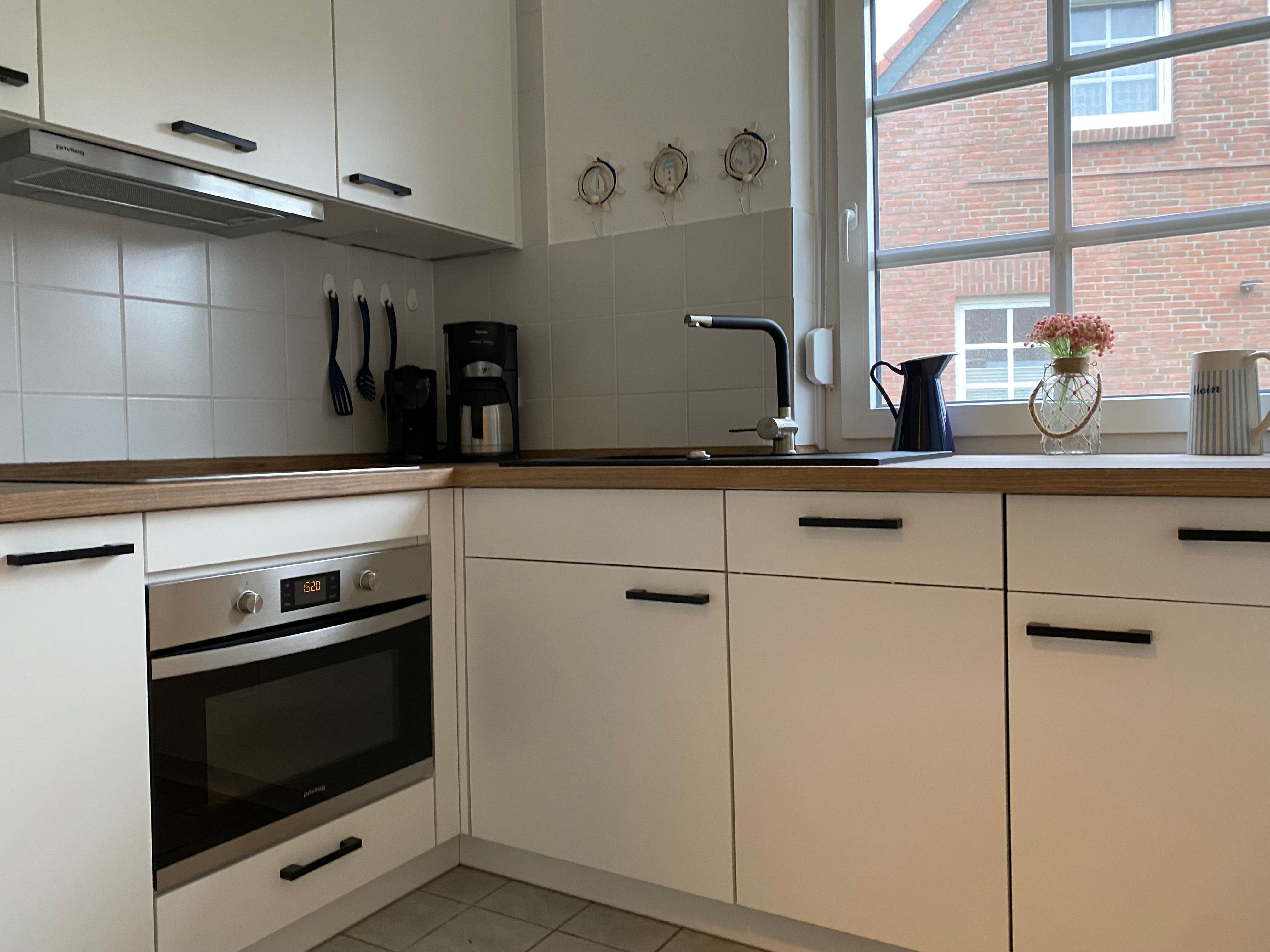 voll ausgestattete Küche mit Elektroherd, Backofen, Geschirrspüler, Mikrowelle, Kaffeemaschine (Filterkaffee), Wasserkocher, Kühlschrank mit Gefrierfach und ausreichend Geschirr, Besteck, Töpfen etc.